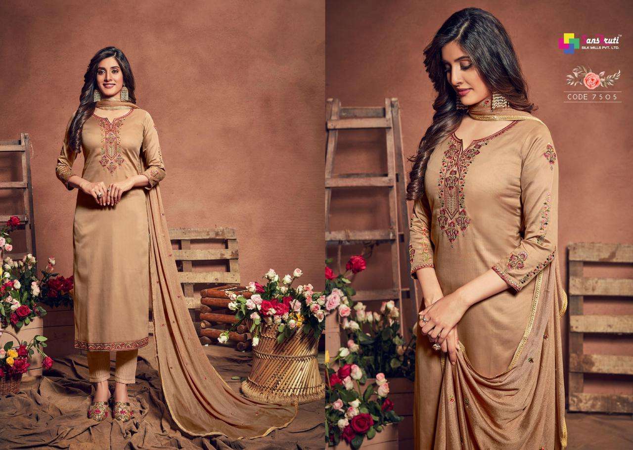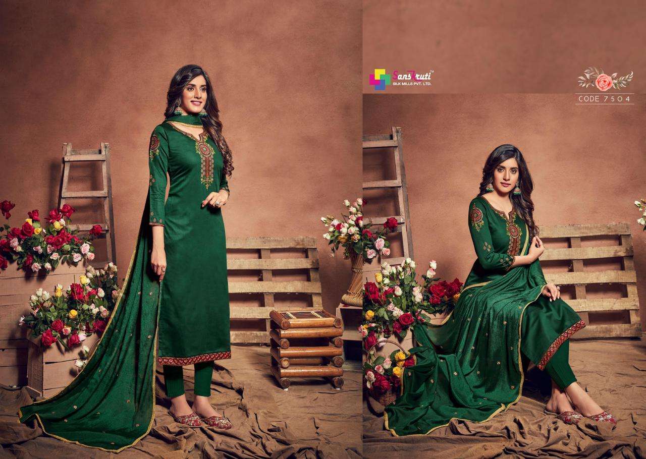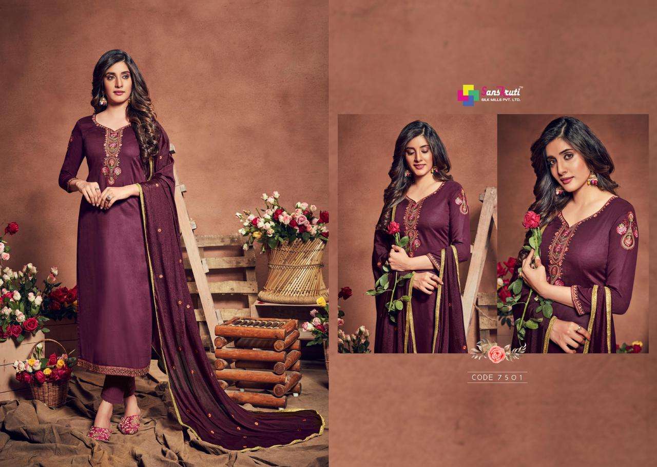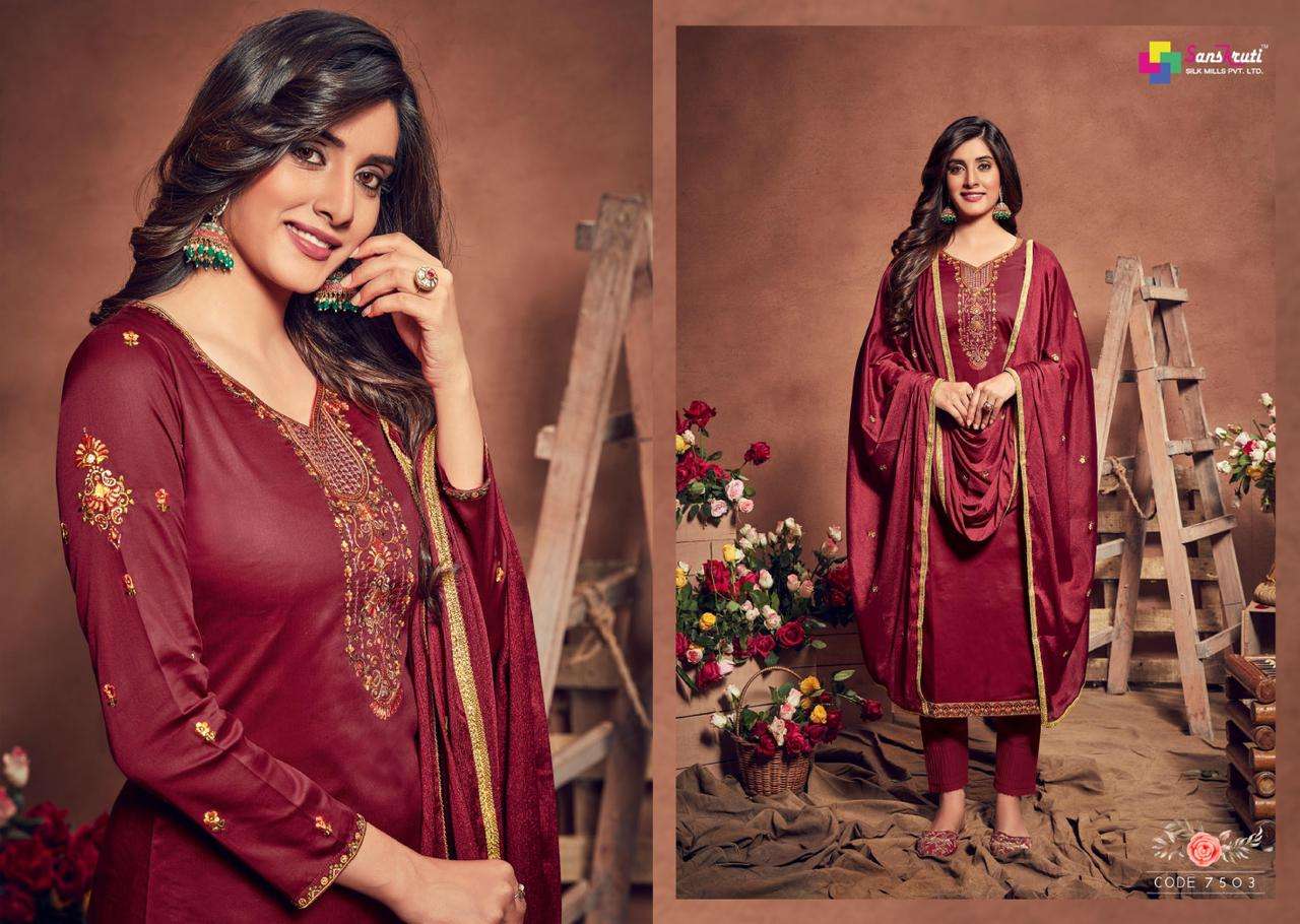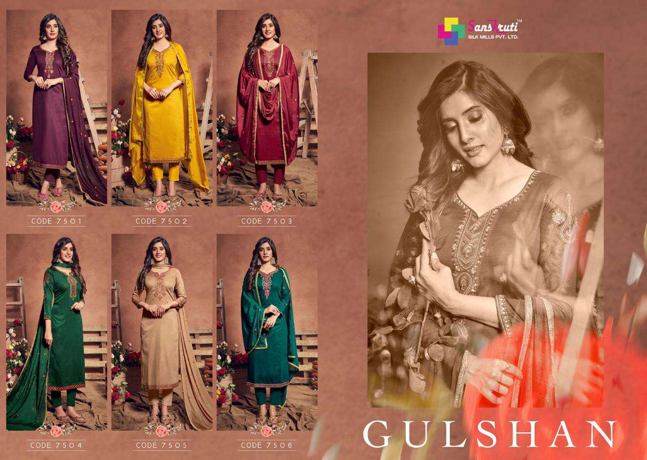 SANSKRUTI SILK MILLS PVT LTD       Present New Catlog        GULSHAN       Fabric Details Top: PURE JAM SILK WITH HEAVY EMRODARI AND SLAVE WORK Bottom: PURE COTTAN Dupatta: PURE CHINON WITH EMBRODARY  FOUR SIDE  LEES Designs: 6 PCS * Price:- 895/- * |