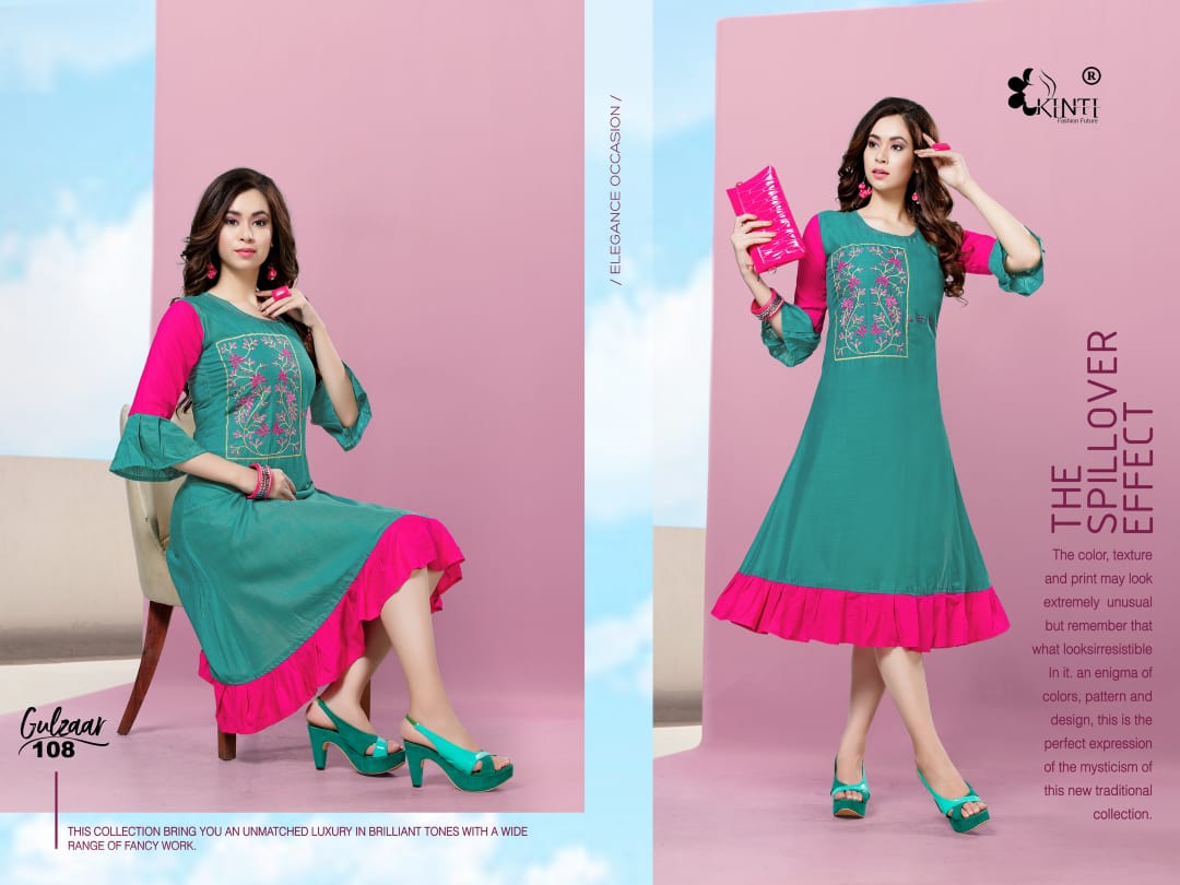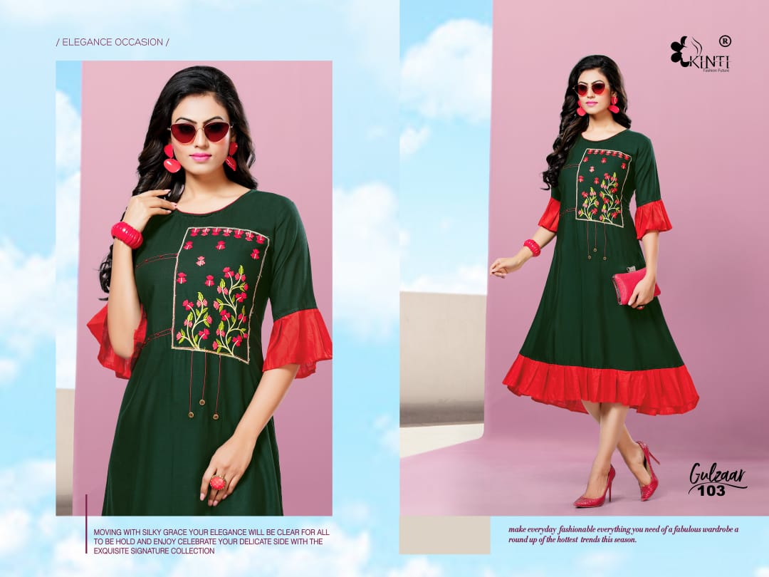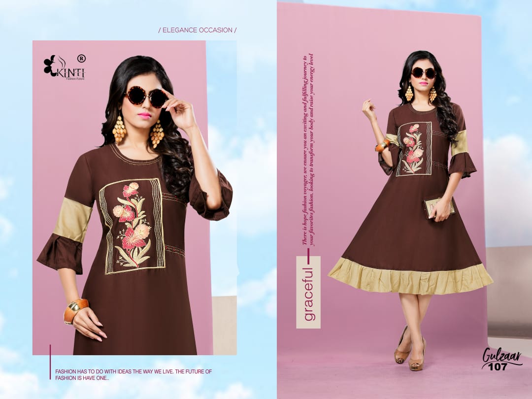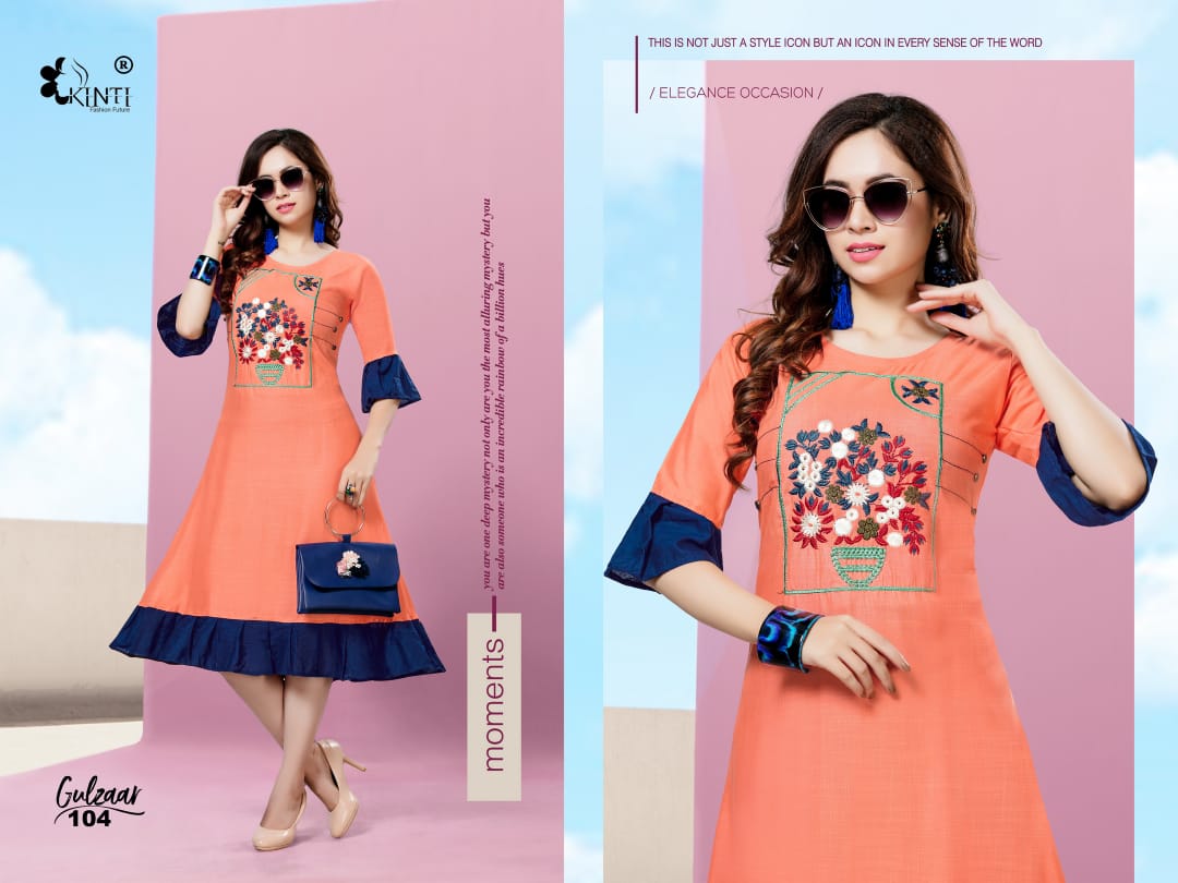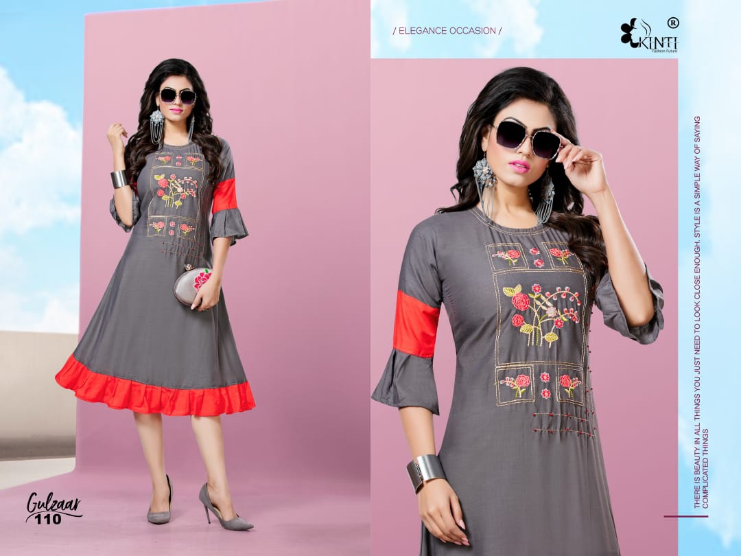 Gulzar by KINTI® Fabric : Reyon Slub Style : Embroidery Hand Work Frill Size. : S M L XL XXL 3XL 4XL 5XL Length. : 45 (approx) Designs : 10 Rate :- 399 + GST |