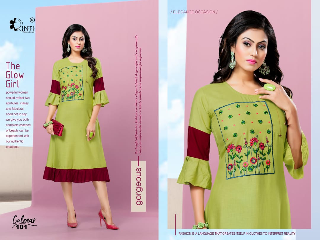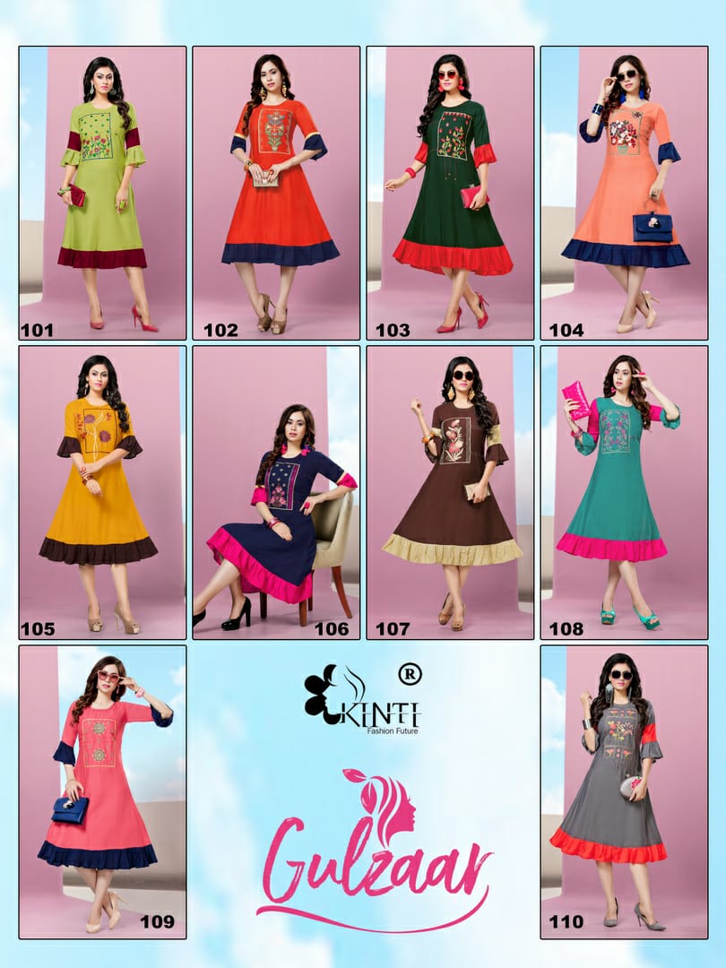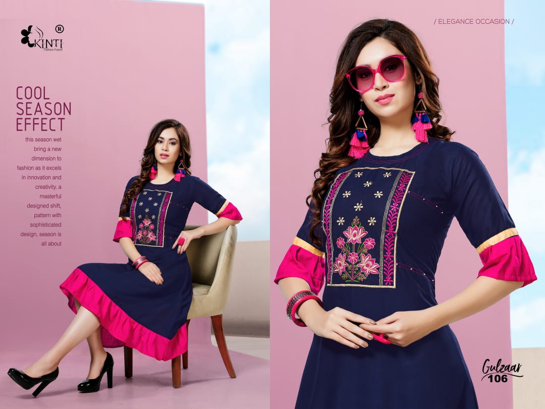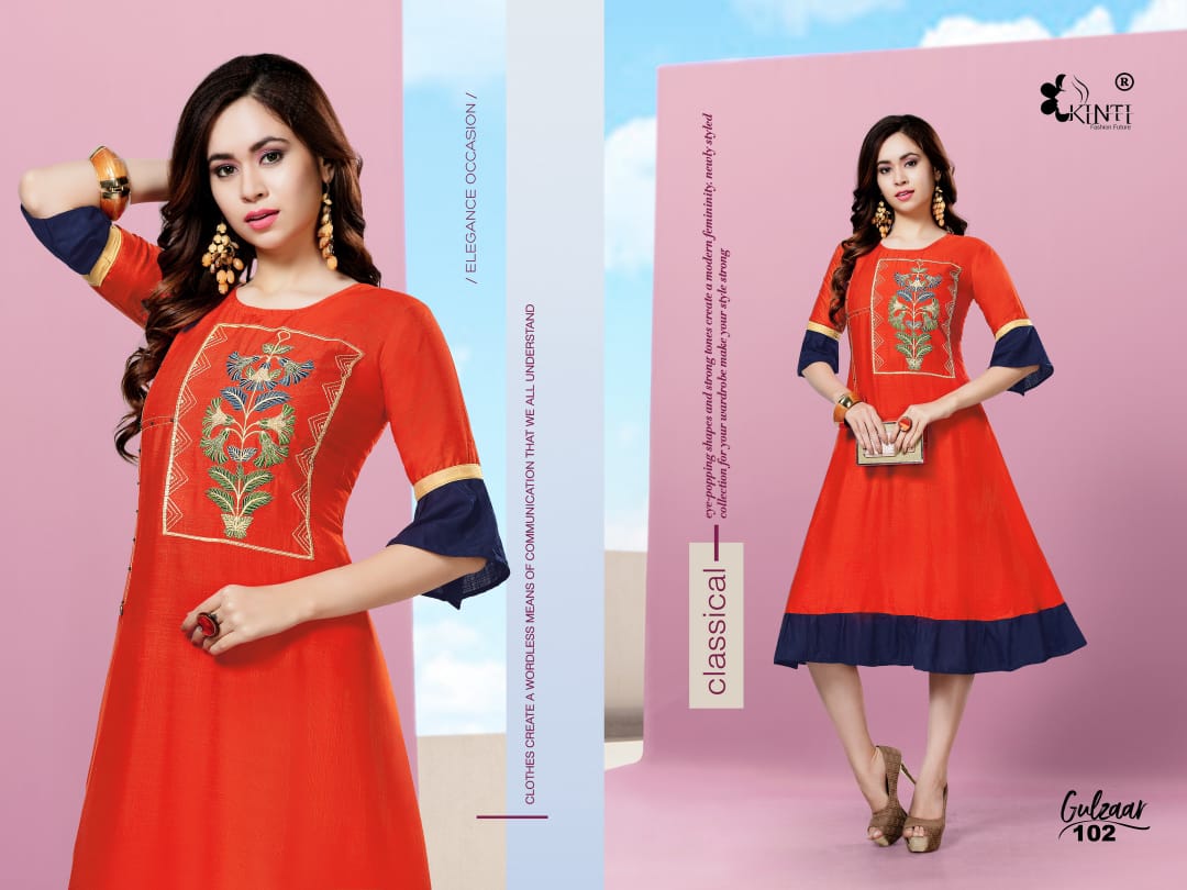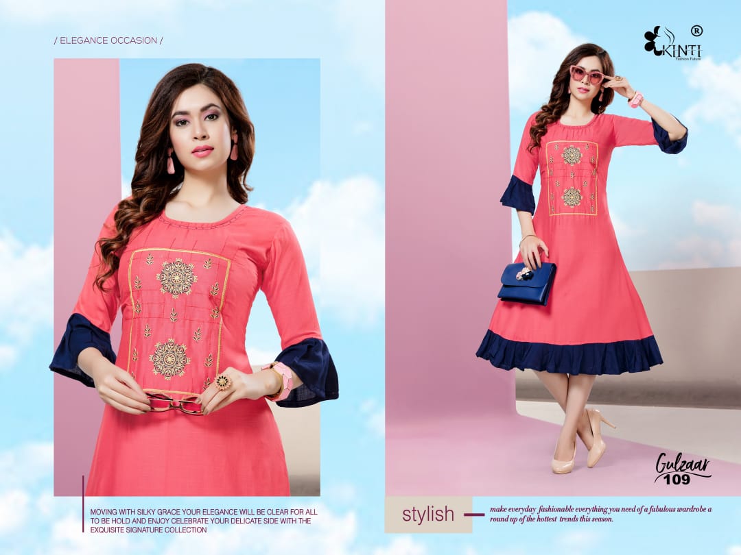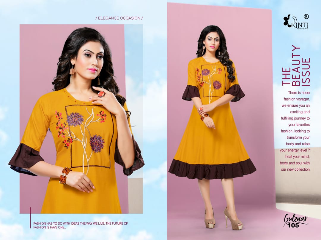 Gulzar by KINTI® Fabric : Reyon Slub Style : Embroidery Hand Work Frill Size. : S M L XL XXL 3XL 4XL 5XL Length. : 45 (approx) Designs : 10 Rate :- 399 + GST |