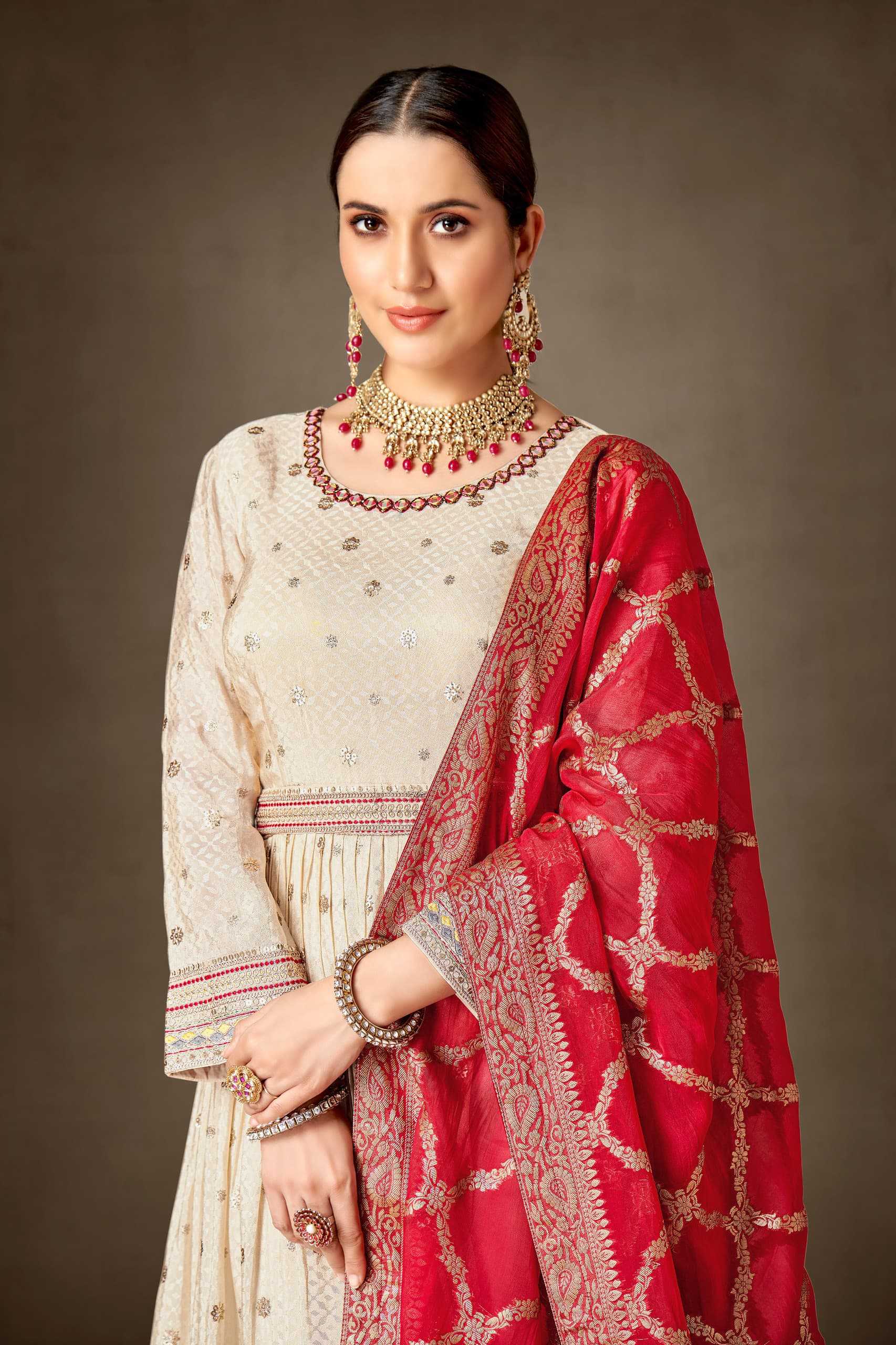 Umang by Gulzar 3 COLOUR PER SET FREESIZE Readymade Inside Marging Upto 48 inch size Fabric Top : Pure Viscose Tissue Silk Jacquard Dupatta : Pure Viscose Organza Banarasi Jacquard Pant : Heavy Santoon Silk Front & Back Embroidery WORK : Jari Resham and Sequince Work with handmade embroidery