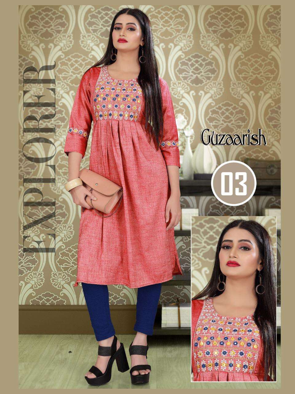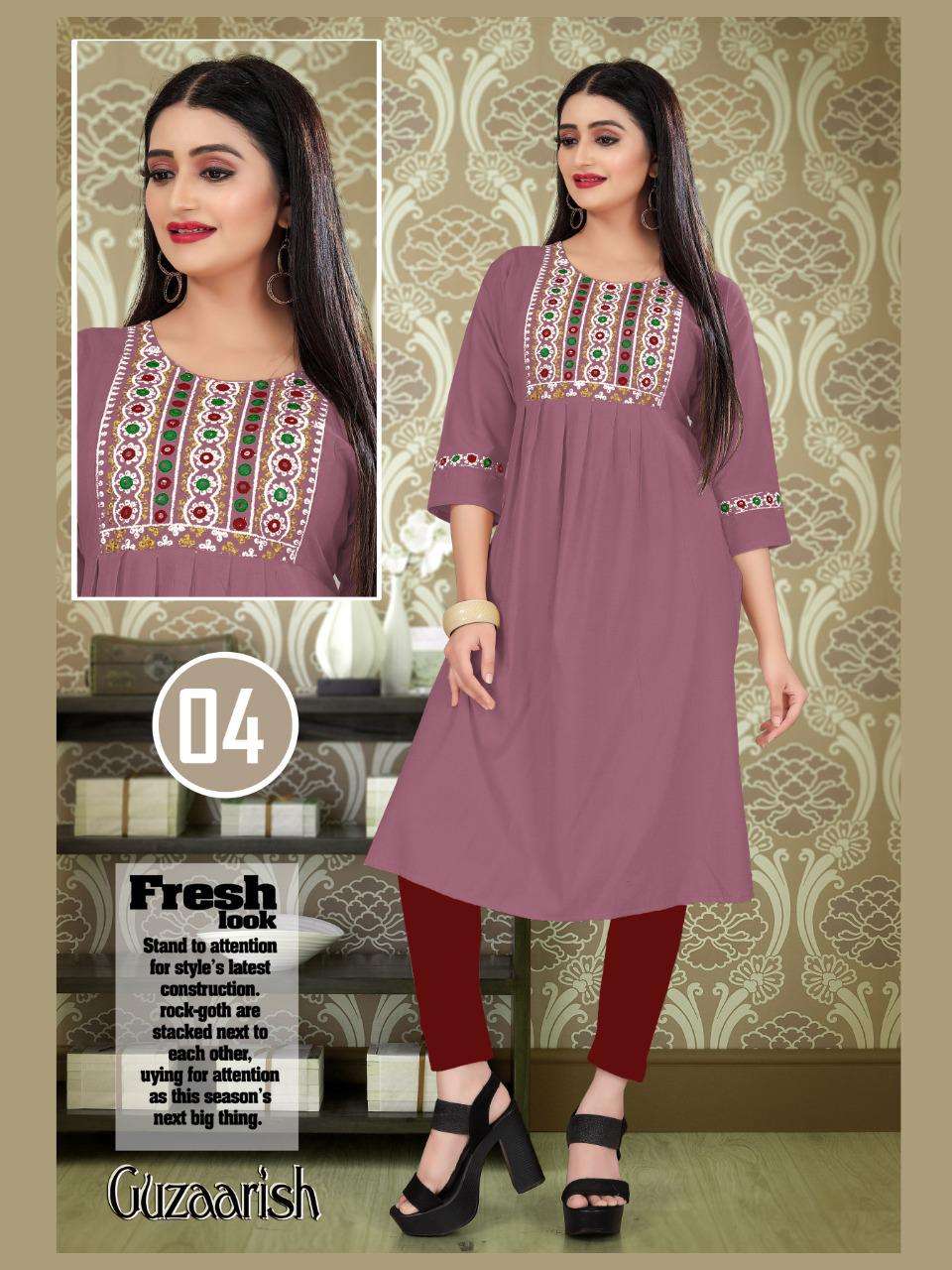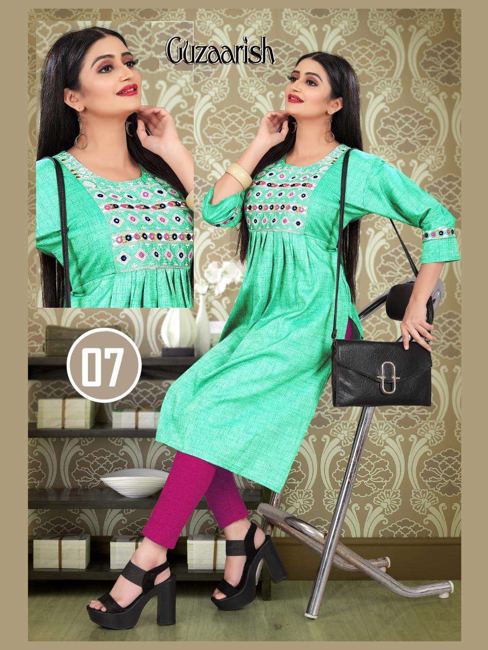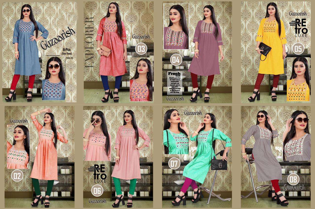 GUZAARISH VOL.3 HEAVY Rayon Two Tone Heavy Tikka Work Embroidered Kurti with Sleeve Work KURTI CATALOG WHOLESALER BEST RATE