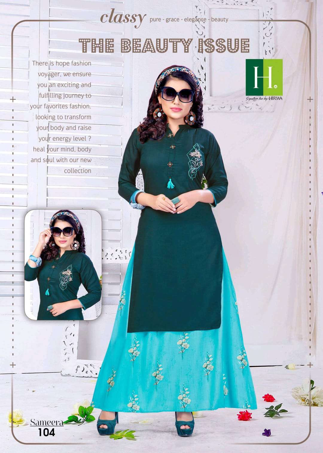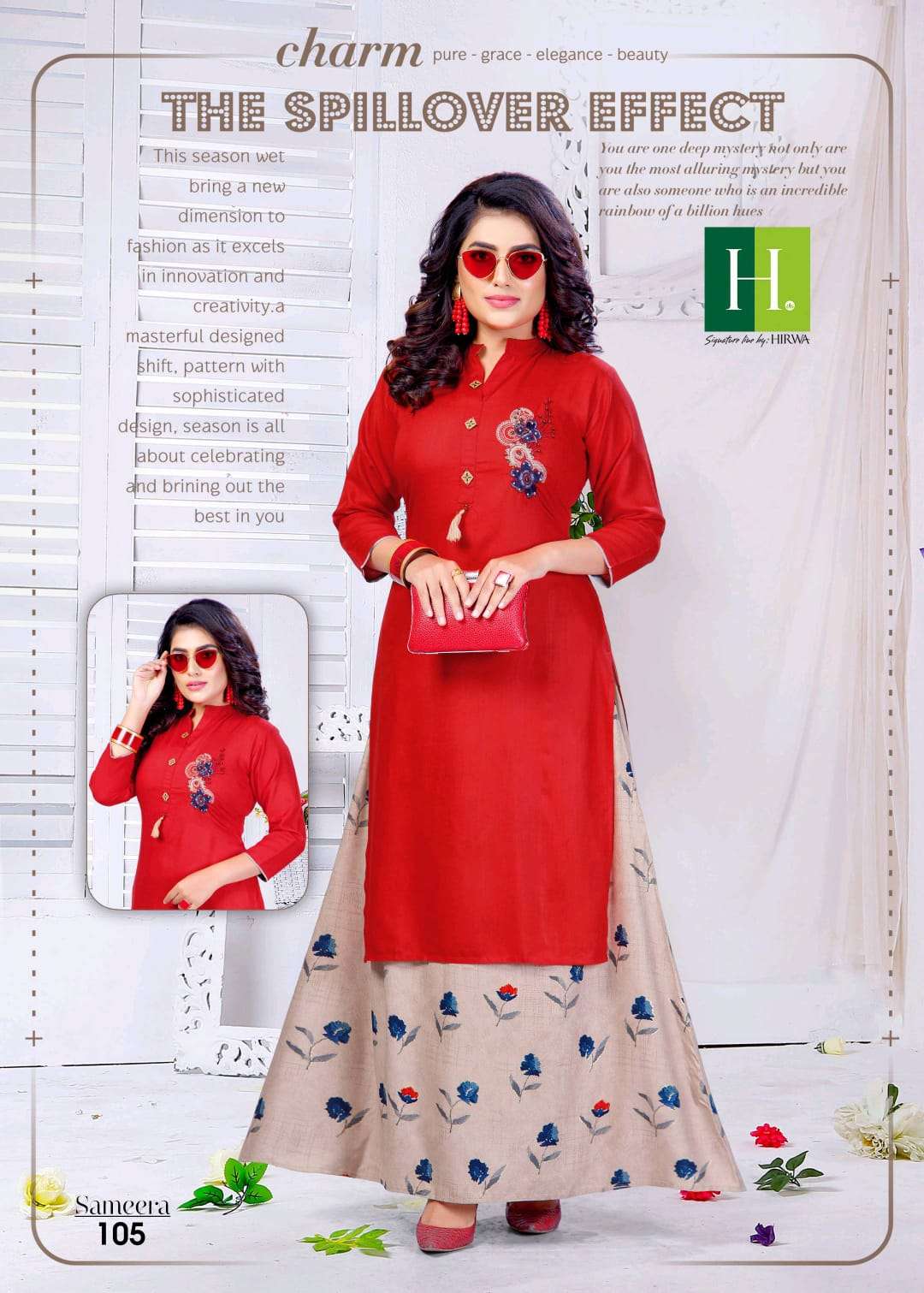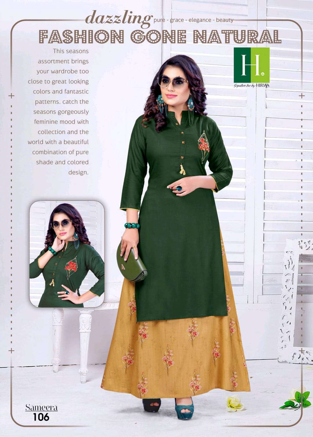 H.DOT FROM HIRWA PRESENTS 📒NAME: SAMEERA 👗TOP RAYON SLUB WITH HAND WORK 👖BOTTOM: RAYON GOLD FOIL PRINT( SKIRT) ✅CONCEPT: STRAIGHT TOP WITH SKIRT 👗LENGTH: 44" ⚜️DESIGN: 6 SIZE: M,L, XL, XXL 💲RATE: 695/- |