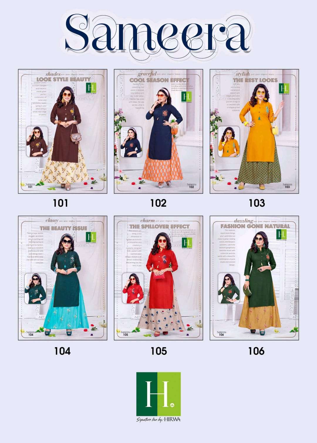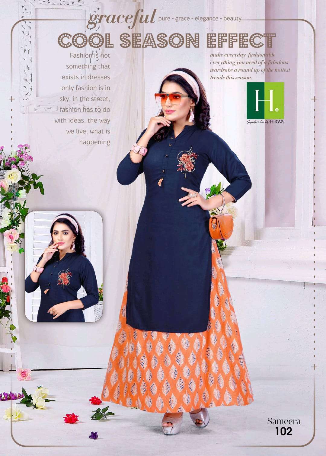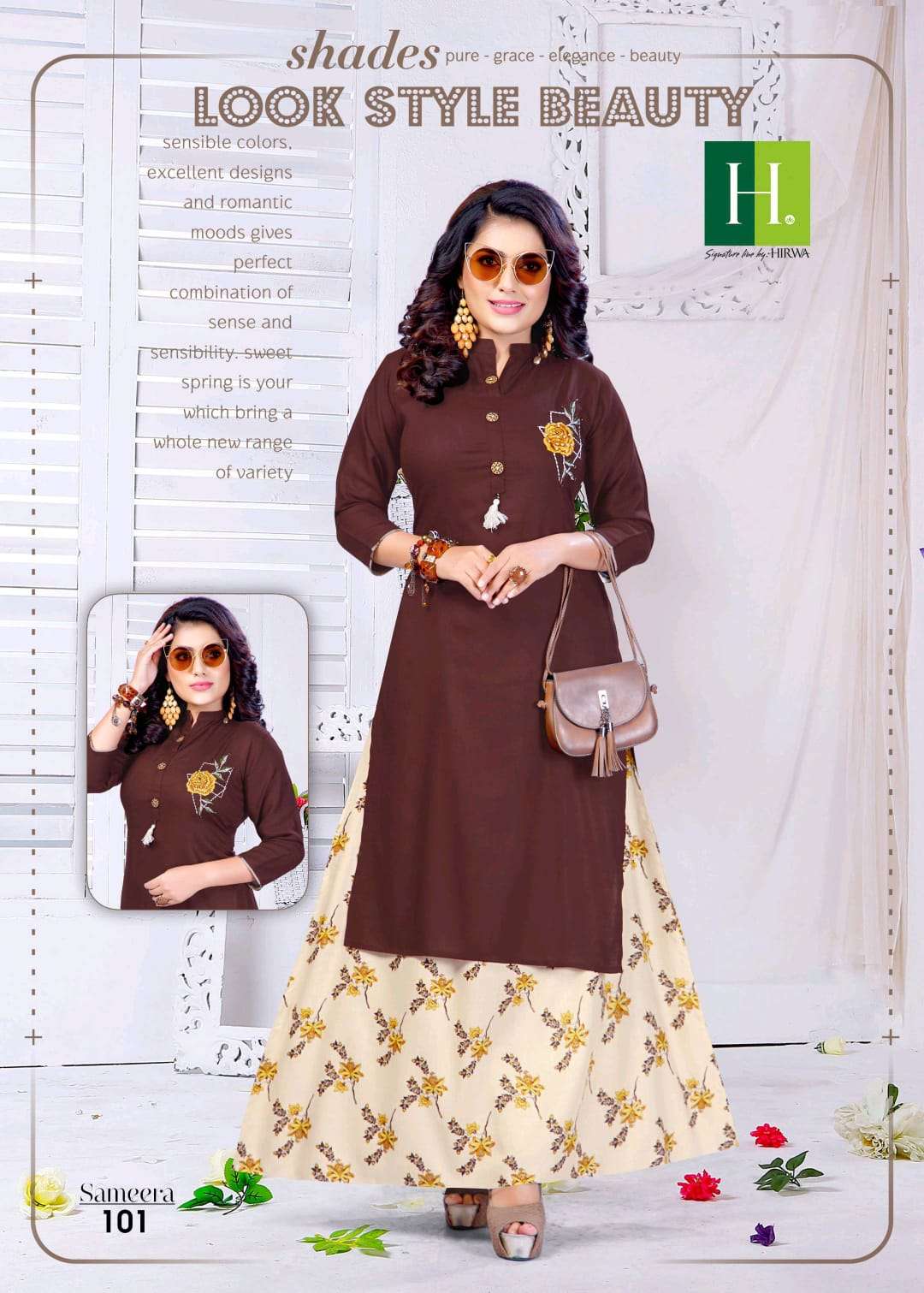 H.DOT FROM HIRWA PRESENTS 📒NAME: SAMEERA 👗TOP RAYON SLUB WITH HAND WORK 👖BOTTOM: RAYON GOLD FOIL PRINT( SKIRT) ✅CONCEPT: STRAIGHT TOP WITH SKIRT 👗LENGTH: 44" ⚜️DESIGN: 6 SIZE: M,L, XL, XXL 💲RATE: 695/- |