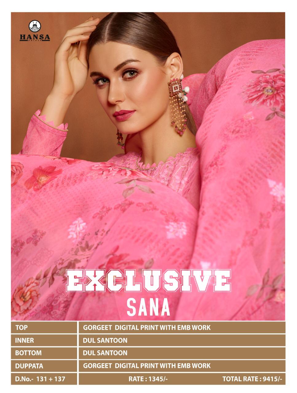 Catlog name - Exclusive Sana. Rate - 1345 per Pcs . Set to set. GST 5 Percent Extra. Delivery from today |