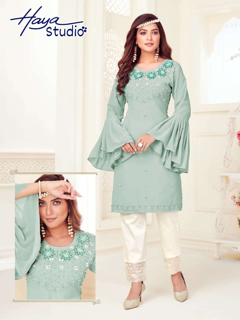 NEW LAUNCHING  Luxurey Preet  EDITION Look Classy Style Hand Work and Stylish petern Slive & glamorous pearl work in Pant in our new Designer collection      Launch BY      Haya Studio      (Vol :- 1007) Description  Designer Luxerey preet Tunic With beautiful classy paired  with designer Handwork kurti & Stylish petern in Sliv & paired with  Designer Cigarette Strachable Pant With Pearls Details Top:- Pure Georgette With Inner Santoon Bottom :-pure Cotton Strachable Colour :-       (1)Ice Green       (2)  Dusty Piech       (3) java gray            Measurements       Top L Size Chest(38) Bottom L size (28-34)     Top xl size chest (42)     Top Length (38)        Bottom xl size (36-42)         RATE :- 1150/- Full Sat (101% premium quality ) |