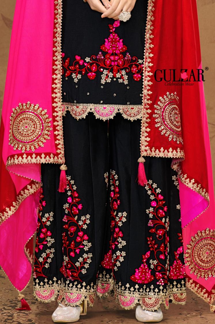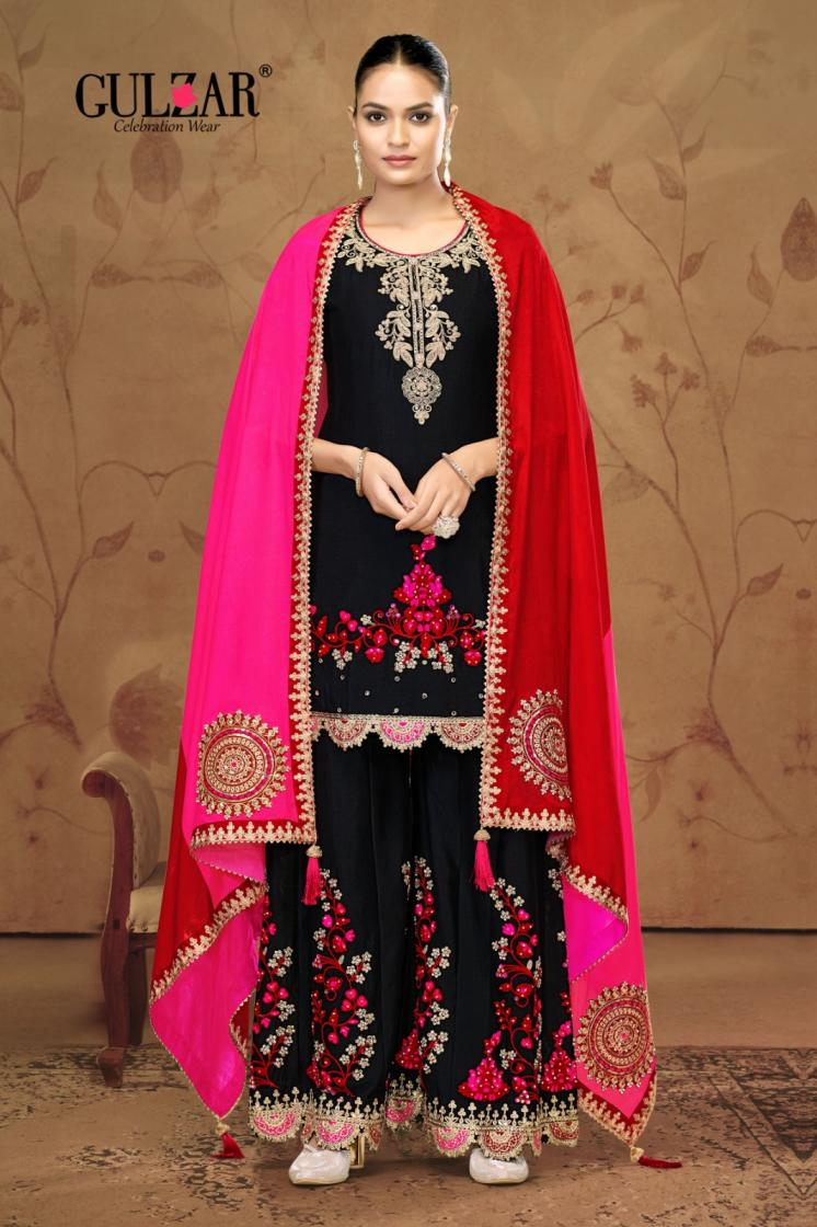 Hazariphool by Gulzar D.No. 2141-2142 2 COLOUR PER SET FREESIZE Readymade Inside Marging Upto 48 inch size Fabric Top : Premium Fiber Chinnon with Applique style thread and handmade mirror work embroidery Dupatta : Premium Chinnon with Fine Digital Print and Fourside dabka Dori Border and Applique work Pant :FREESIZE embroidered Kalidar Palzo with Embrodery Lace and mirror work