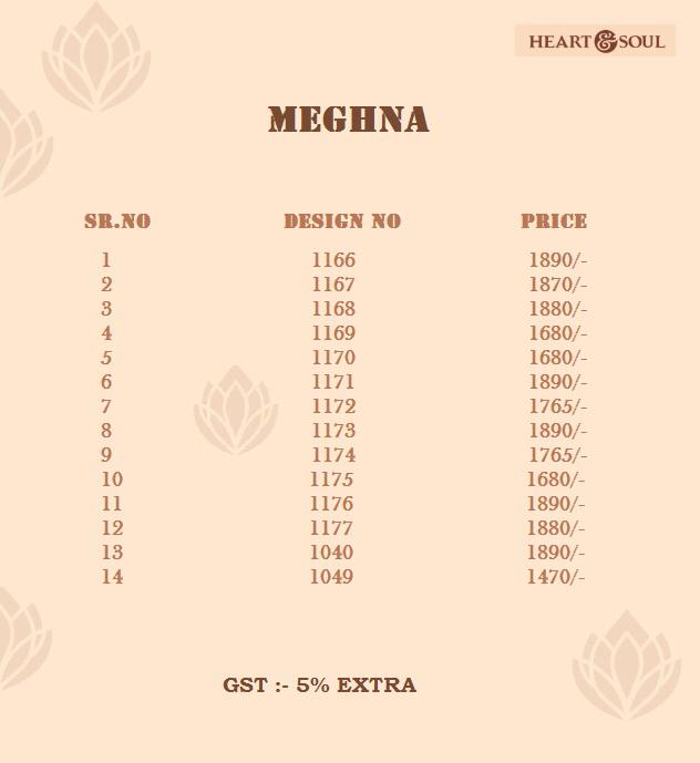 Brand - Heart & soul . Catlog name - MEGHNA. Series -1166 to 1177. SET TO SET PRICE LIST HAS ATTACHED GST 5 Percent Extra. All Fancy Fabric with Heavy blouse . Delivery from today |
