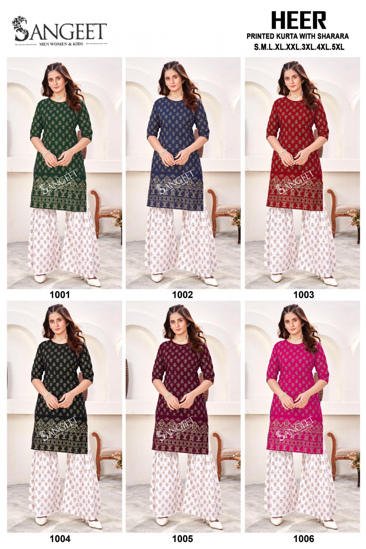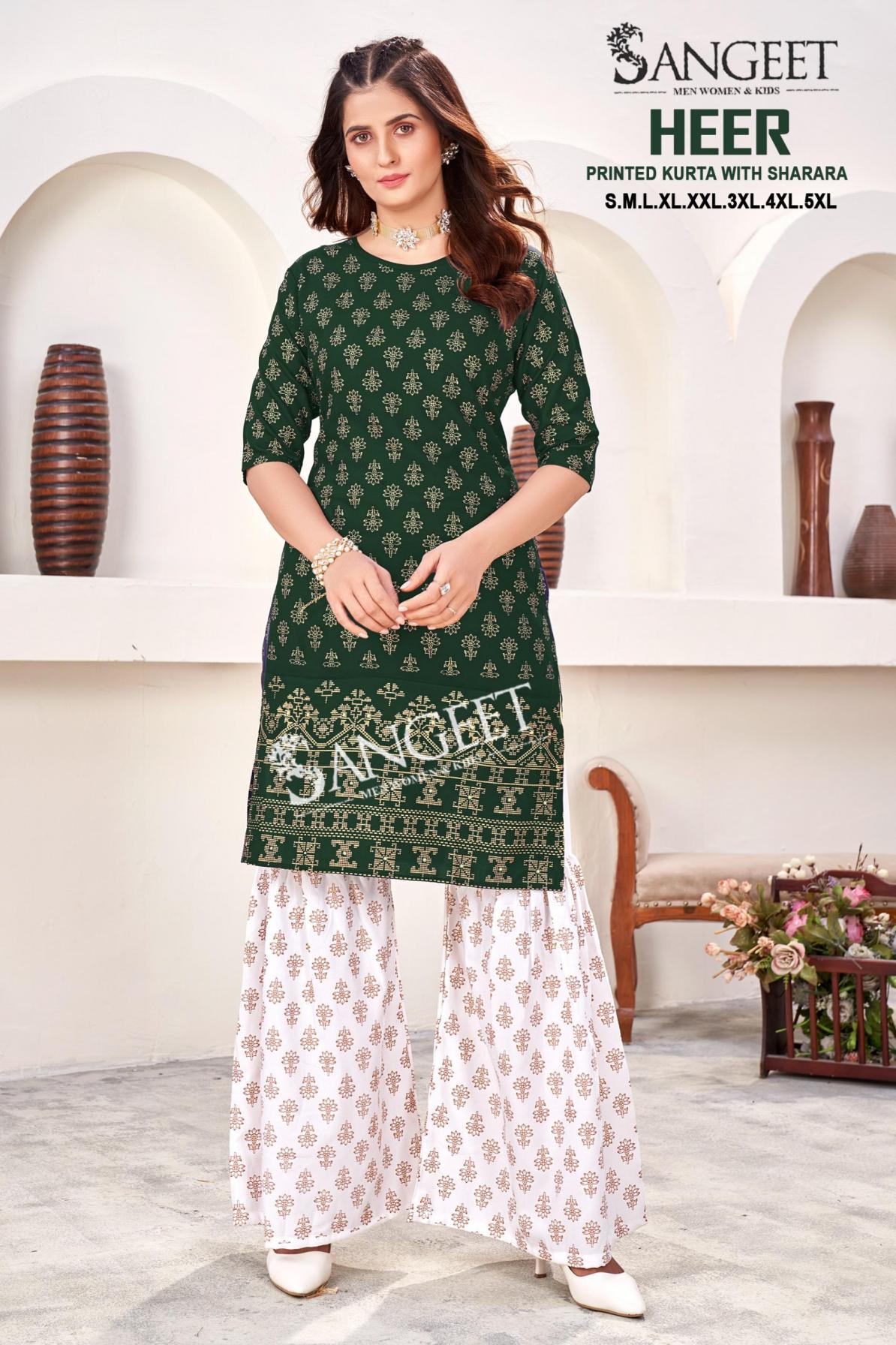HEER RAYON GOLD PRINTED KURTI WITH SHARARA PLAZZO SIZES RATE- 500/- per pcs |