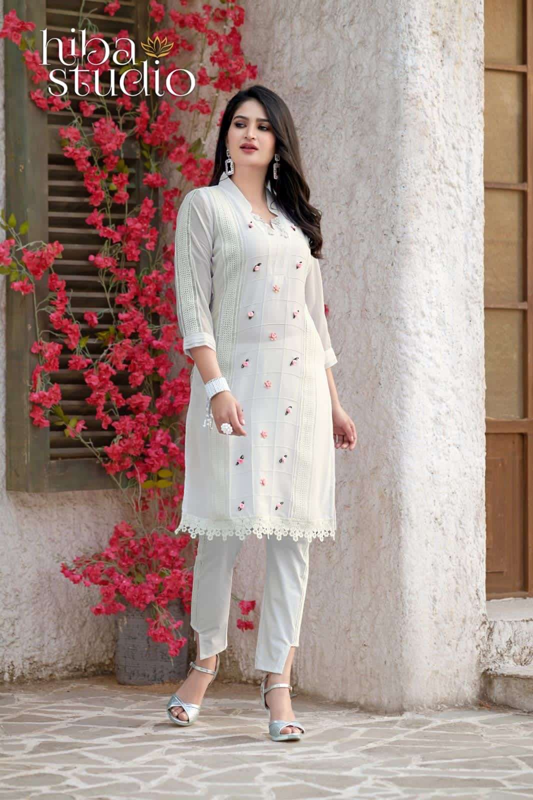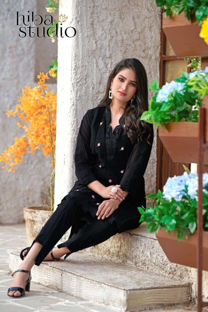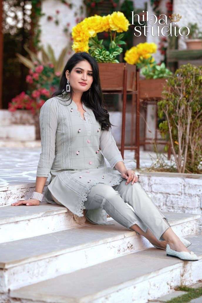 Gorgeous vibes LPC-37  BY HIBA STUDIO ⦠Description⦠A mesmerizing tunic with symmetrical stitched pattern in front coupled with Embellishment of flowers and brooch on collar to enhance your looks. It can be paired with modern style cigarette pants DETAILS Top:- Pure Georgette Fabric Bottom :- Pure Cotton  Stretchable Colour Onix Black, Smoke White, Porcelain Grey            Size Chart Top L size chest (40) Bottom L size (28-34) Top XL size chest (42) Bottom XL size (36-42) Top XXL size chest (44) Bottom XXL size (42-46) Rate 1450/-each         Full Set Available (Full Set contains 3 color in 3 sizes.. Total 9 pic)              Colors May slightly very Due to Light Effect Ready to Ship |