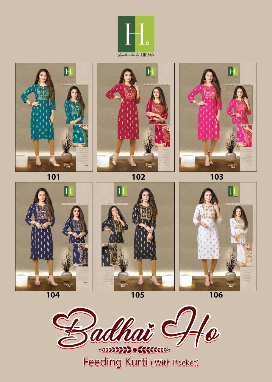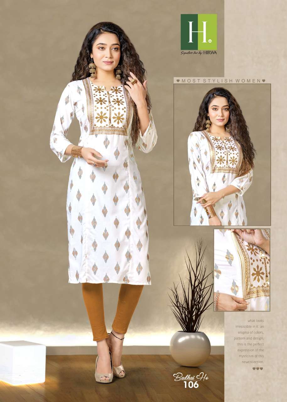 H.DOT by HIRWA PRESENTS NAME: BADHAI HO FABRIC RAYON PRINT CONCEPT: FEEDING STRAIGHT KURTI LENGTH: 45” DESIGN: 6 SIZE: L, XL & XXL RATE: 480/- |