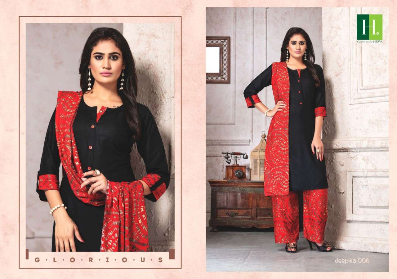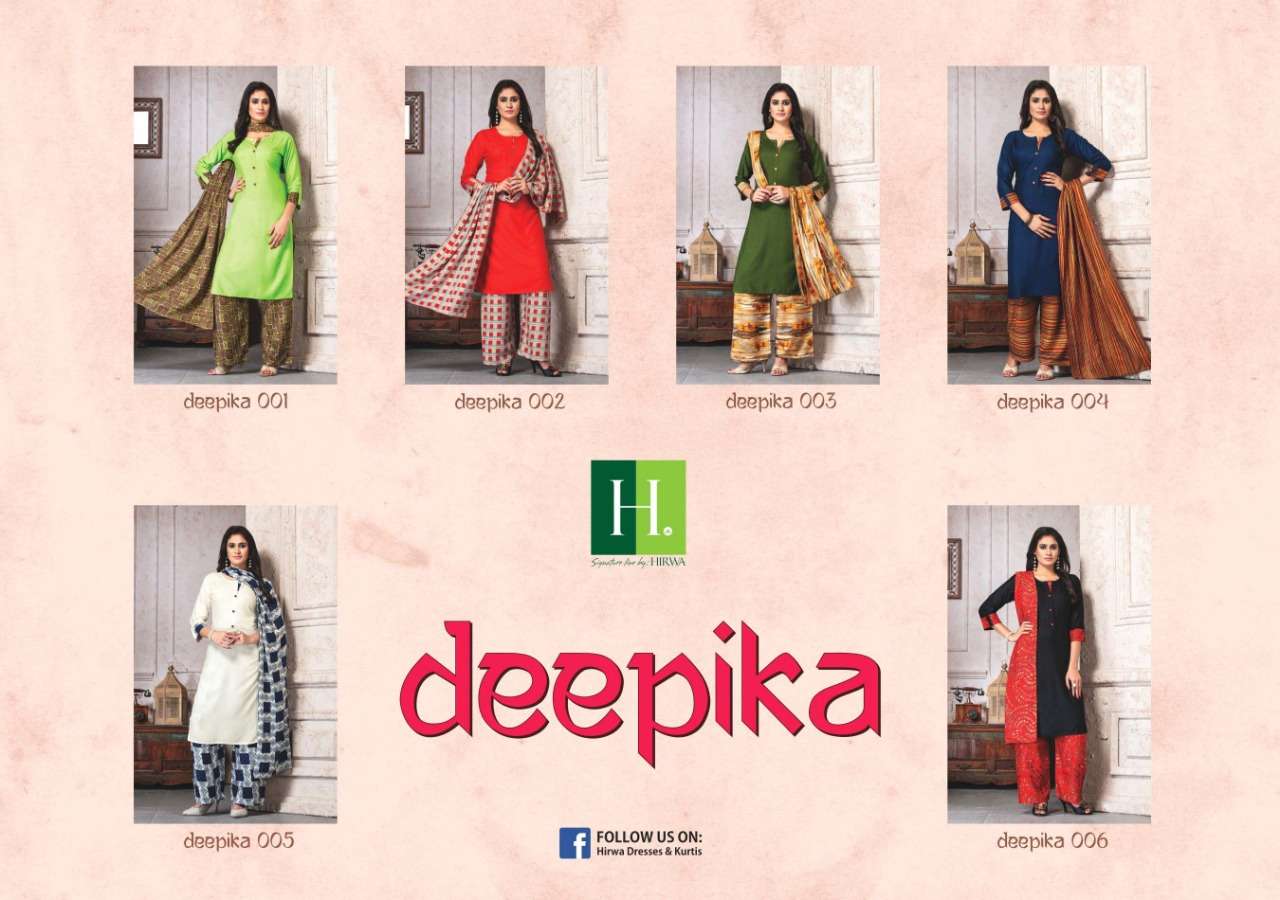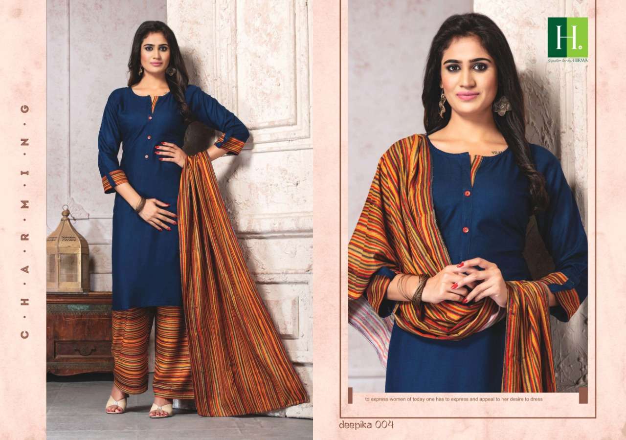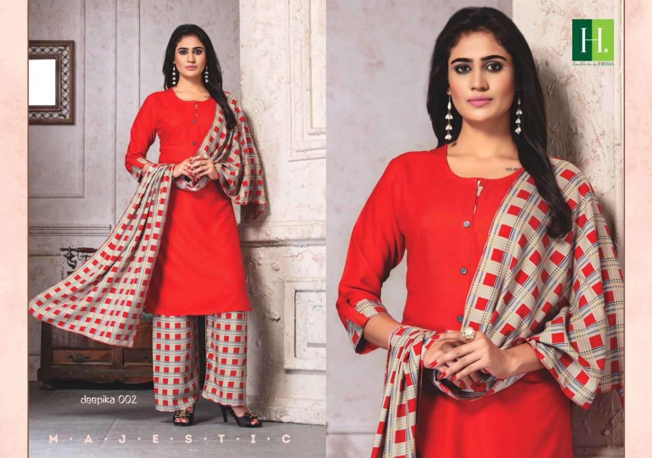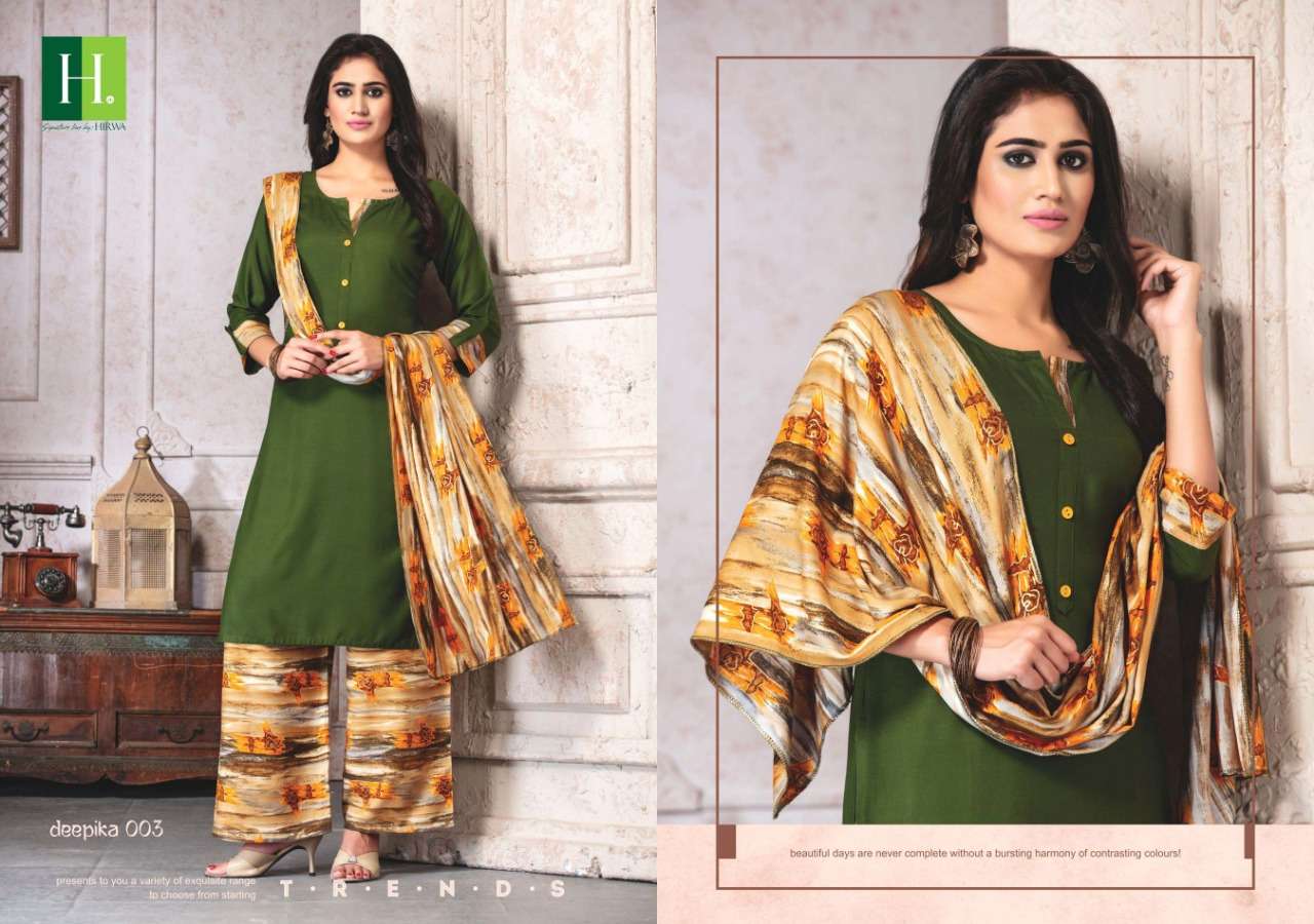 HIRWA PRESENTSÂ NAME: DEEPIKA TOP: *RAYON * BOTTOM RAYON PRINT DUPATTA RAYON PRINT CONCEPT: TOP WITH PLAZO AND DUPATTA LENGTH: 42" DESIGN: 6 SIZE: Â M,L, XL, XXL, 3XL Â |
