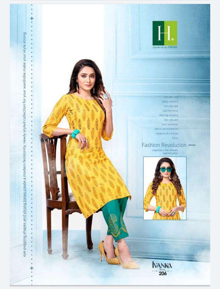 HIRWA PRESENTSÂ NAME: IVANKA WITH PANT TOP: RAYON PRINT WITH HAND WORK BOTTOM: RAYON GOLD PRINT (With pocket)Â CONCEPT: STRAIGHT TOP WITH PANT LENGTH: 44" DESIGN: 6 SIZE: Â M,L, XL, XXL |
