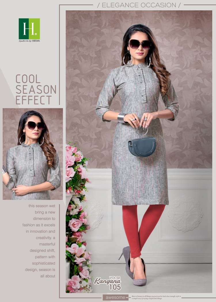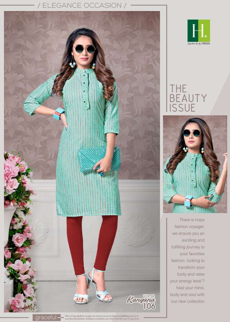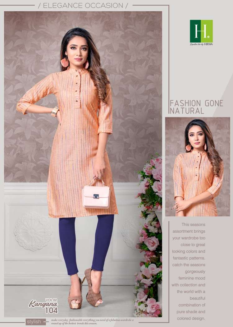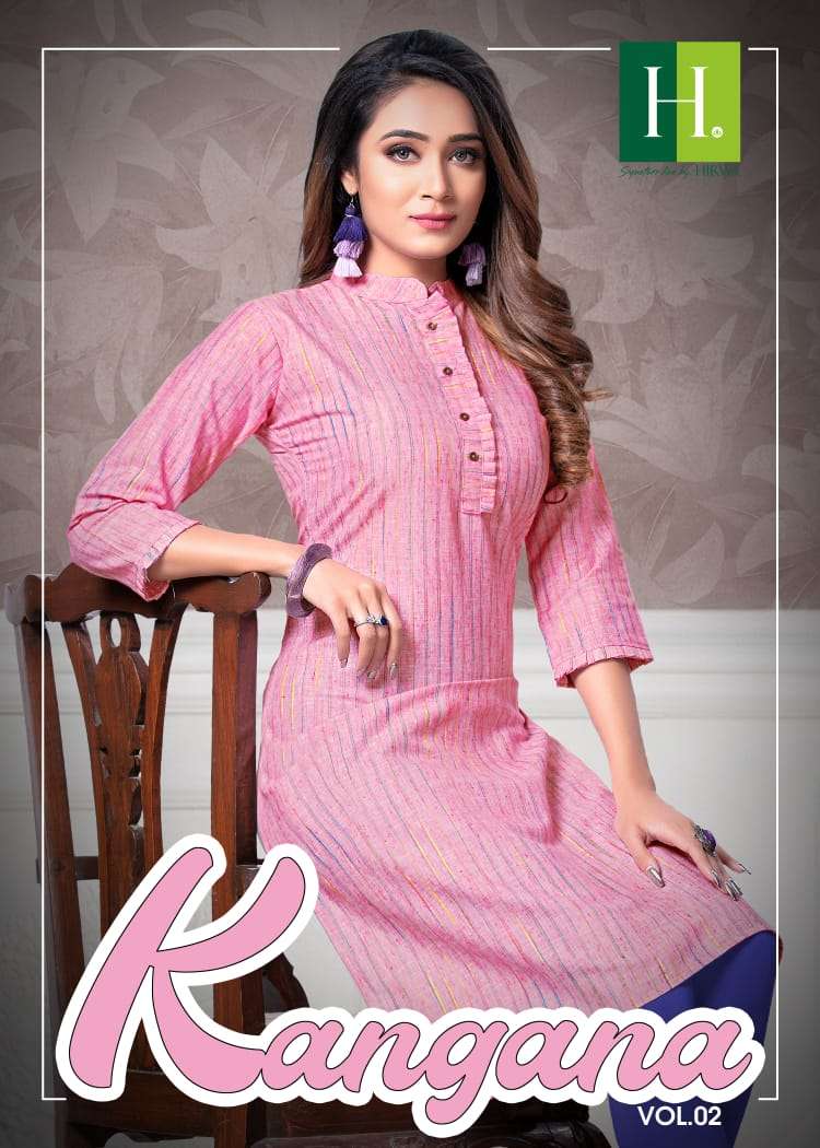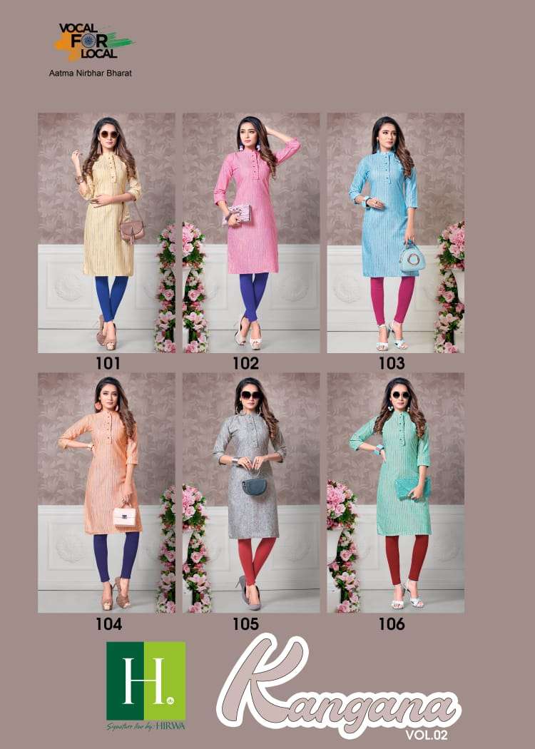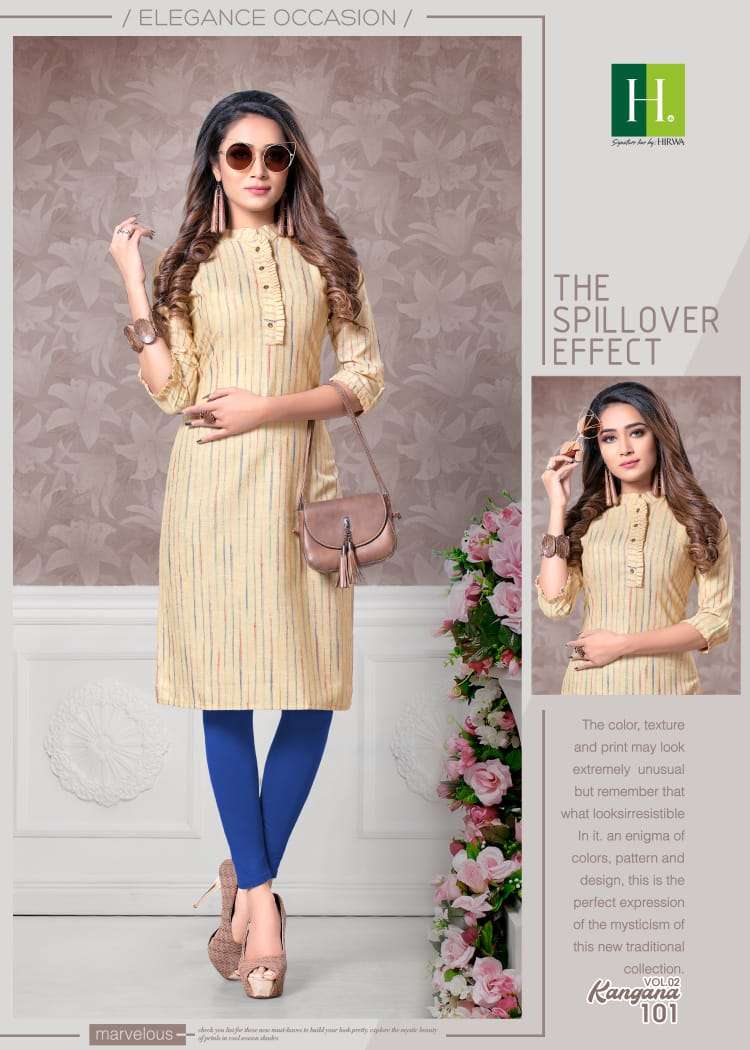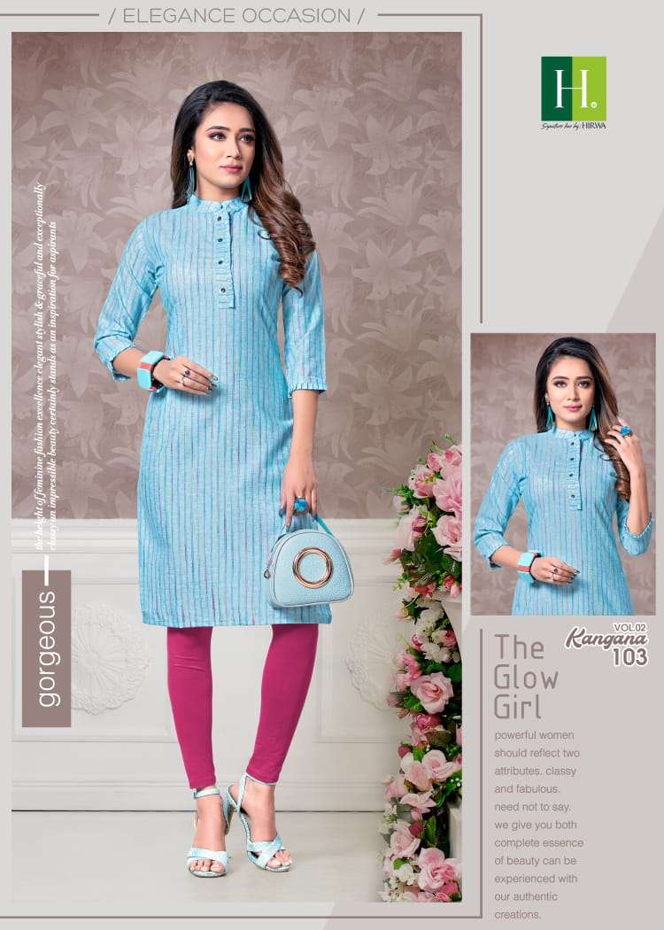 HIRWA presents its latest pleated daily wear kurti catalog Kangana (vol.2) Fabric: Heavy Cambric Cotton with weaving stripes. 6 pcs only. Sizes - M, L and XL |