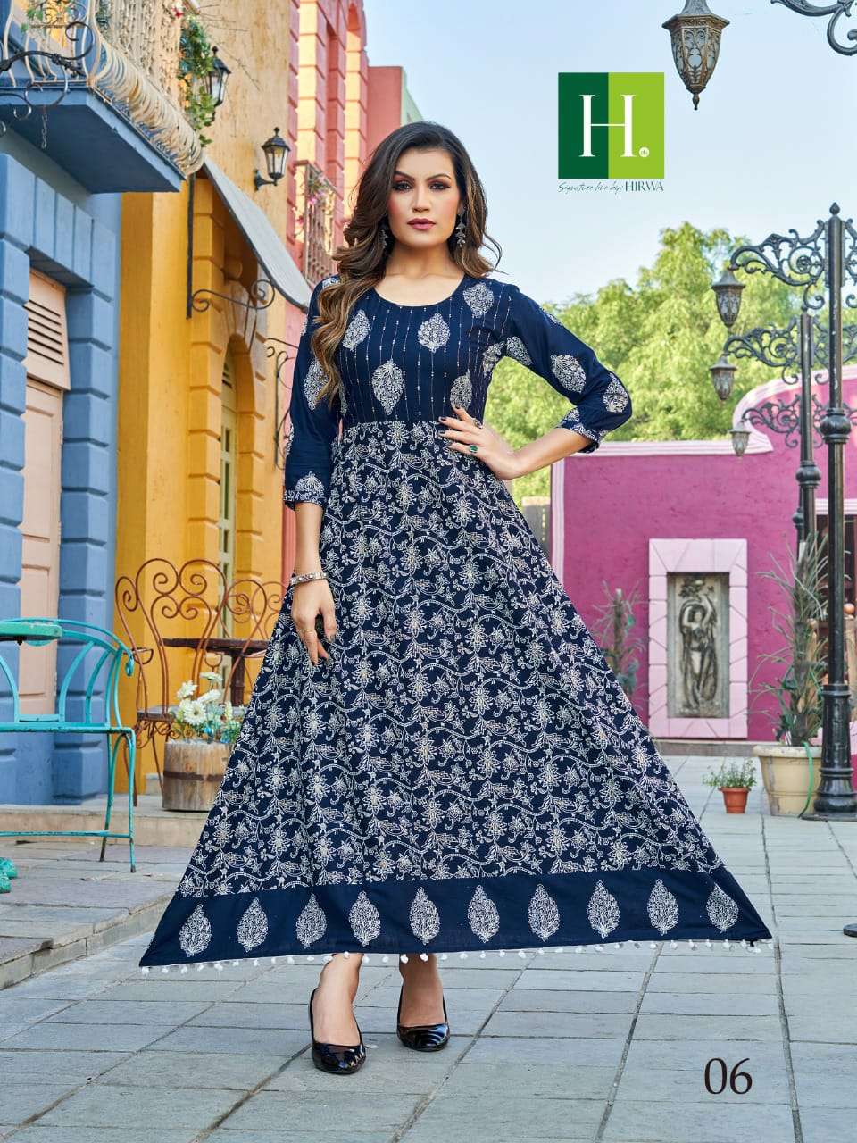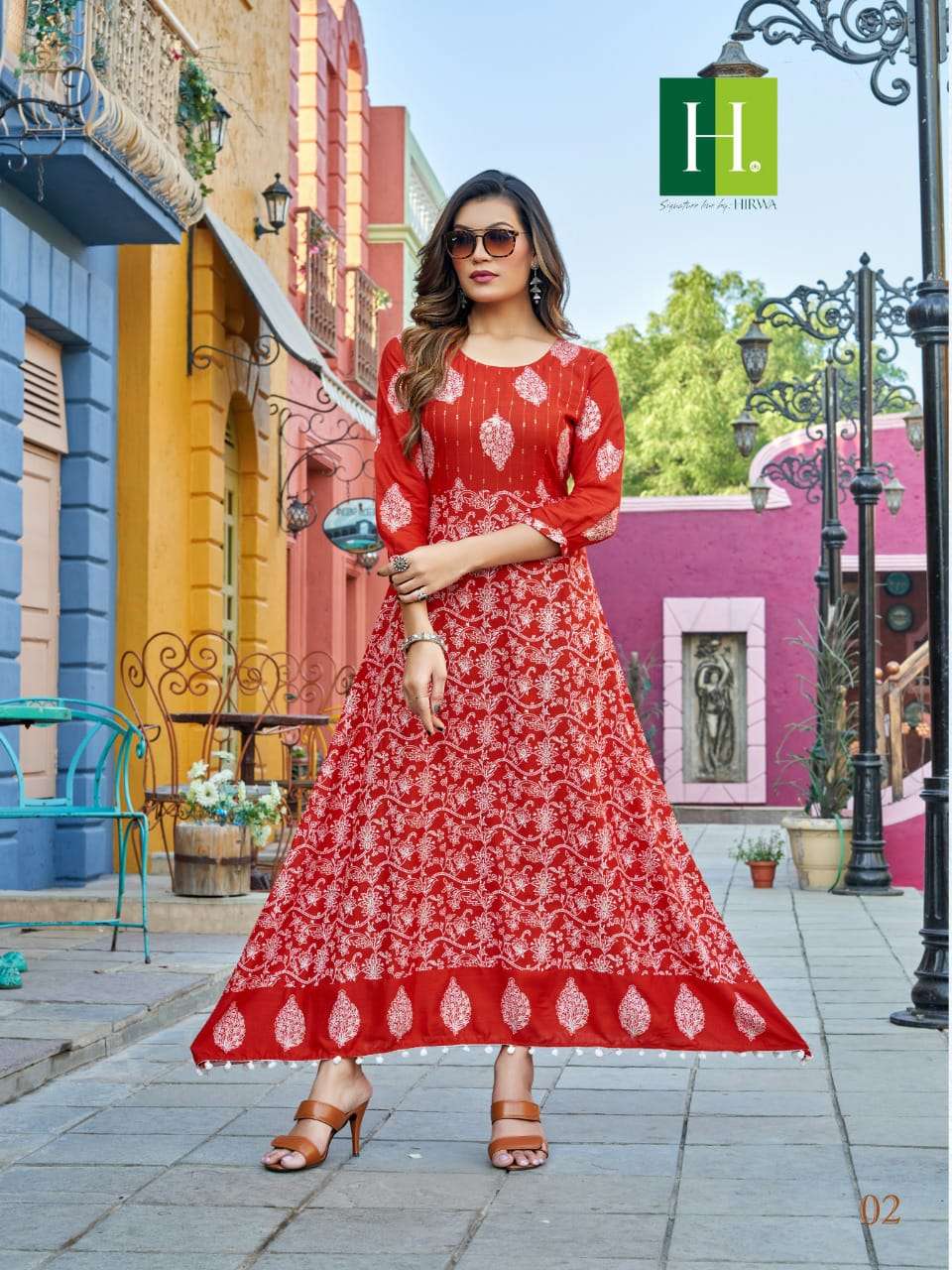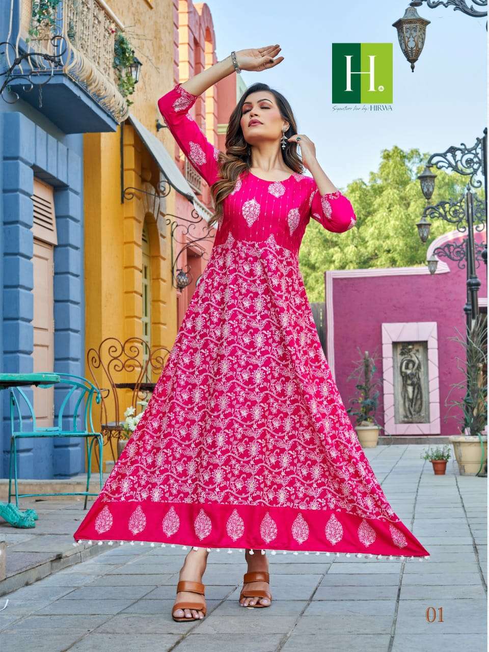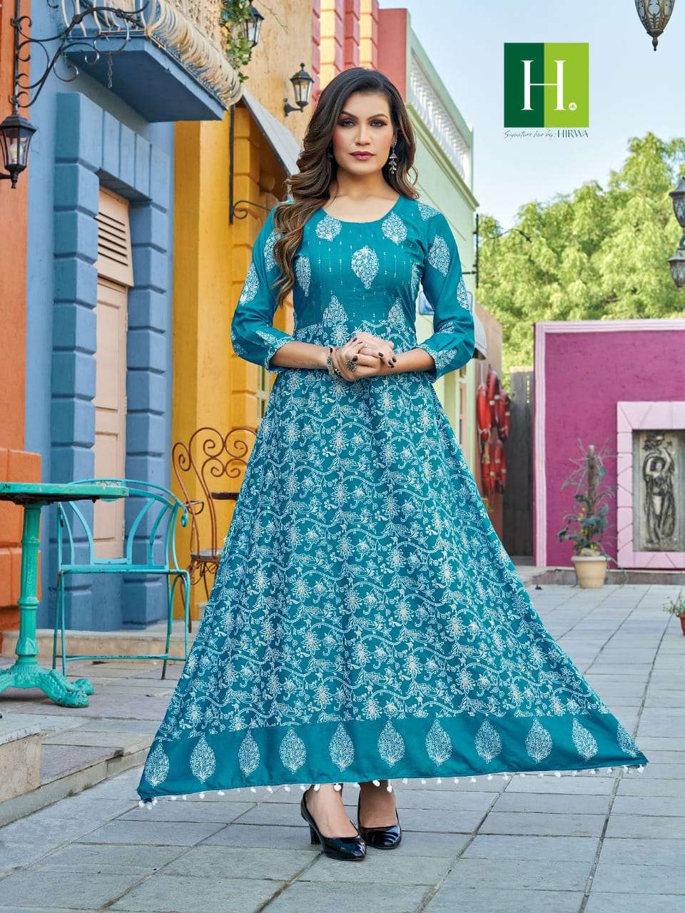 hirwa karishma rayon printed long gown kurtis with sequence work