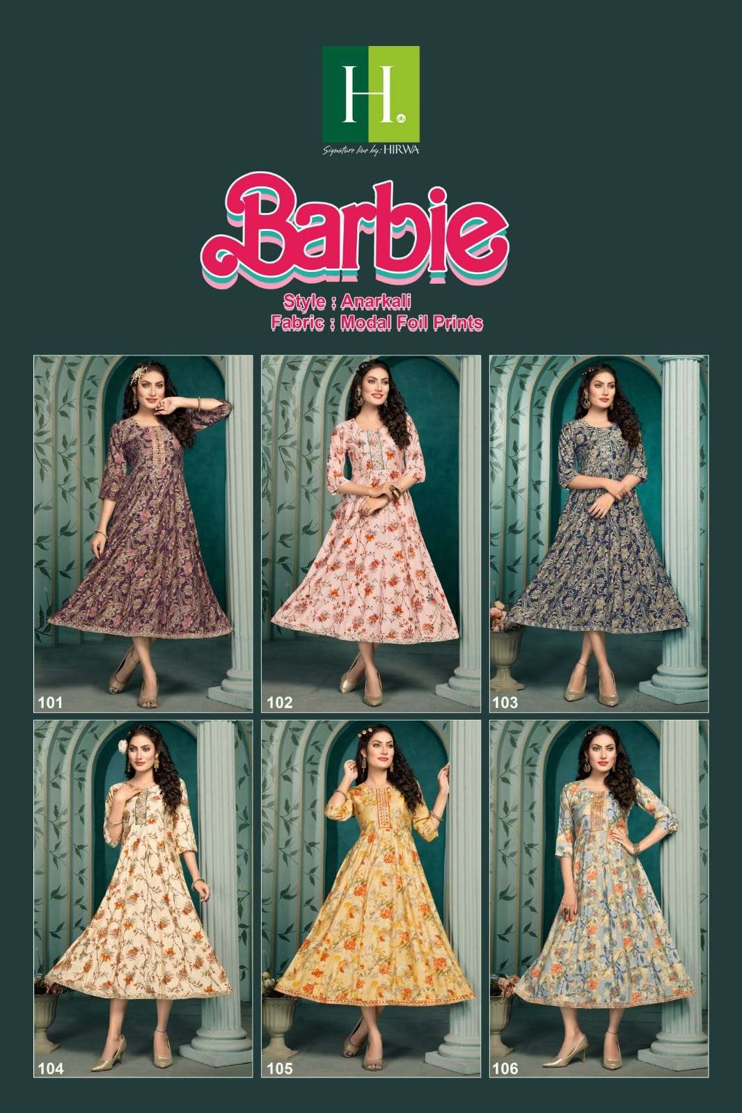 🔥 Modal Anarkali 🔥 H.DOT by HIRWA presents its latest Anarkali Catalog 📒NAME: Barbie 👗 Fabric: Heavy Modal Foil Prints 👉DESIGNS: 6 SIZES: S, M, L, XL & XXL RATE: 659/- |