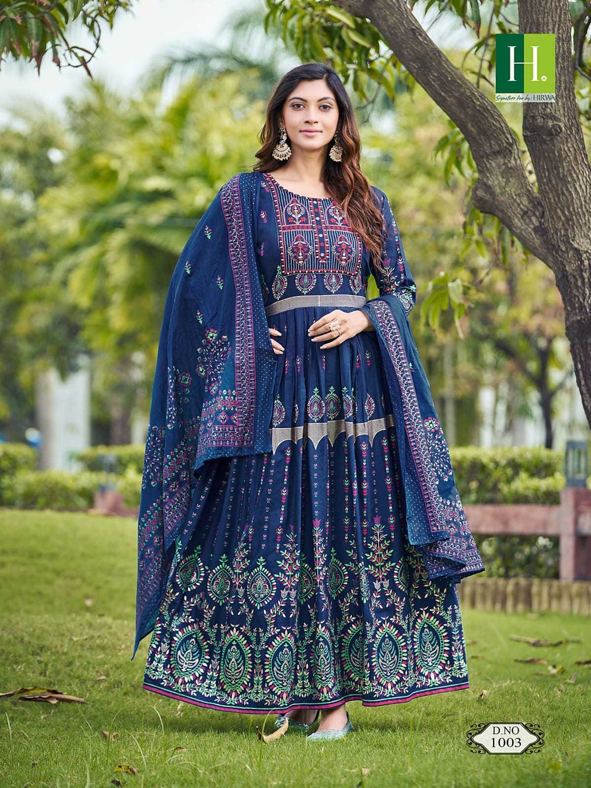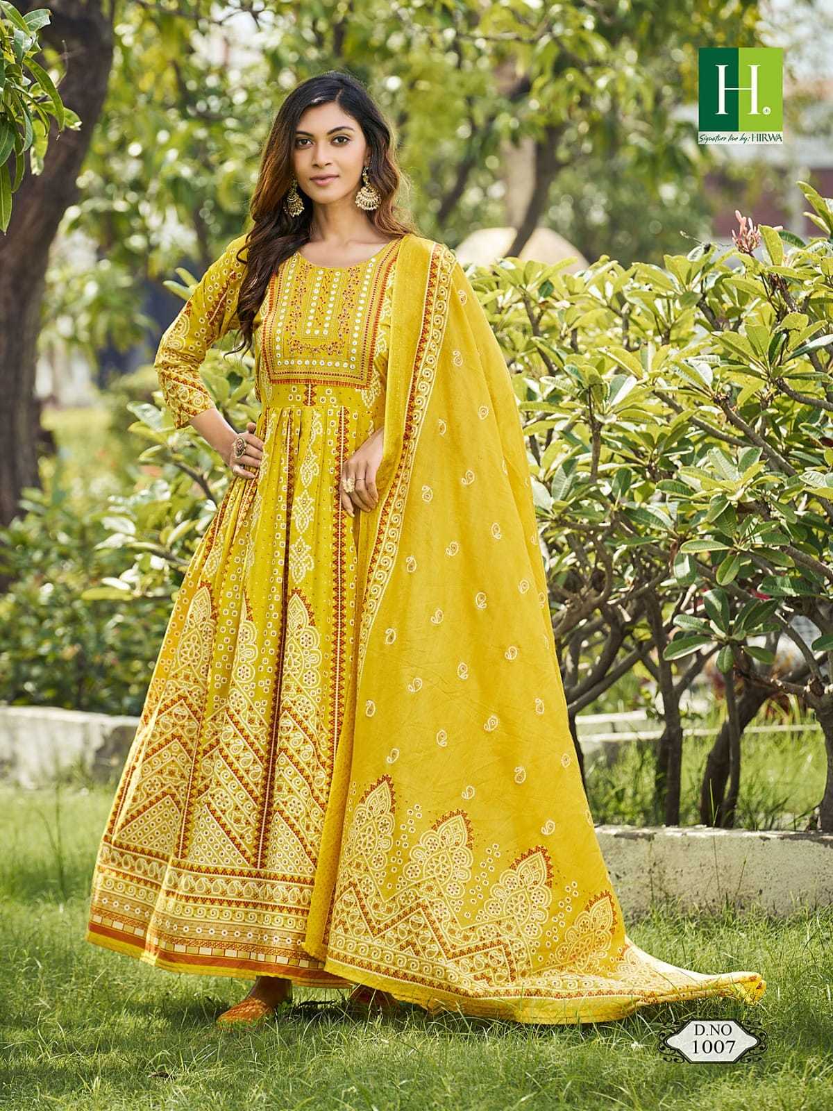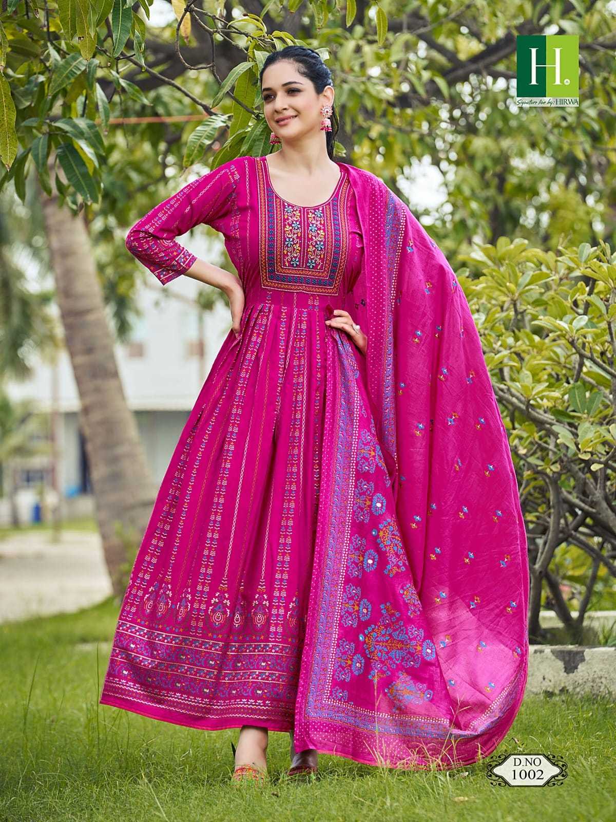H DOT by HIRWA is launching its new long gown catalog with dupatta Kumari Fabric :- Heavy Rayon Foil Prints Concept :- Floor Length Ghera with Neck Embroidery & Dupatta Dupatta:- Cotton Mul Box Print Length: 50+ 8 Designs SIZES :- L, XXL, 4XL, 5XL Rate: 840/- |