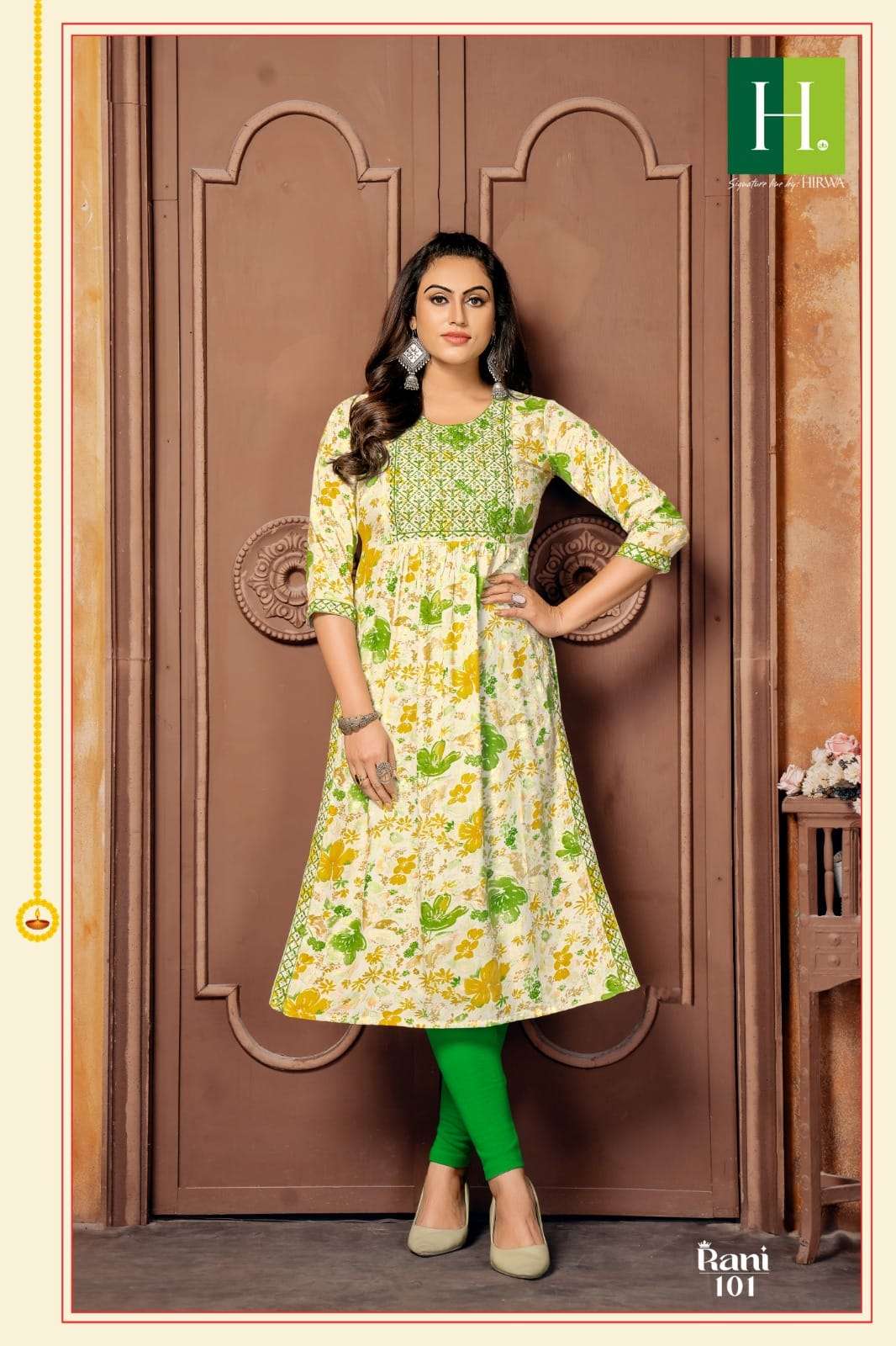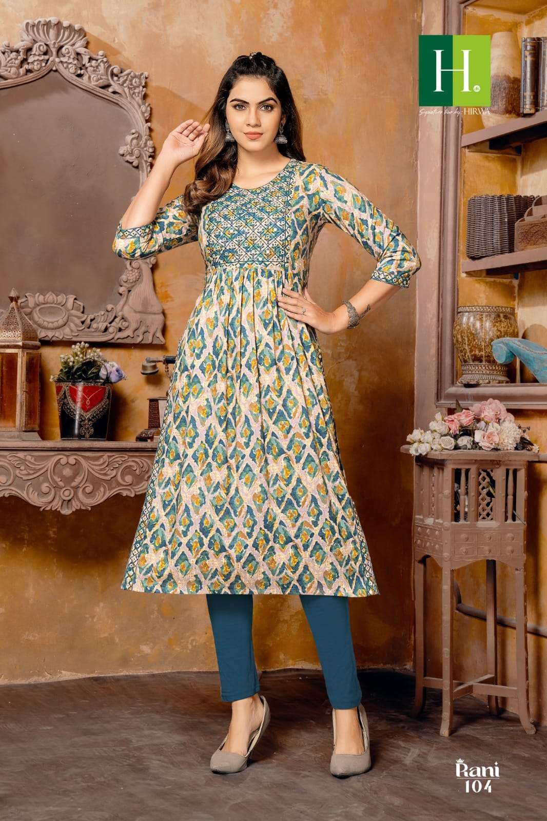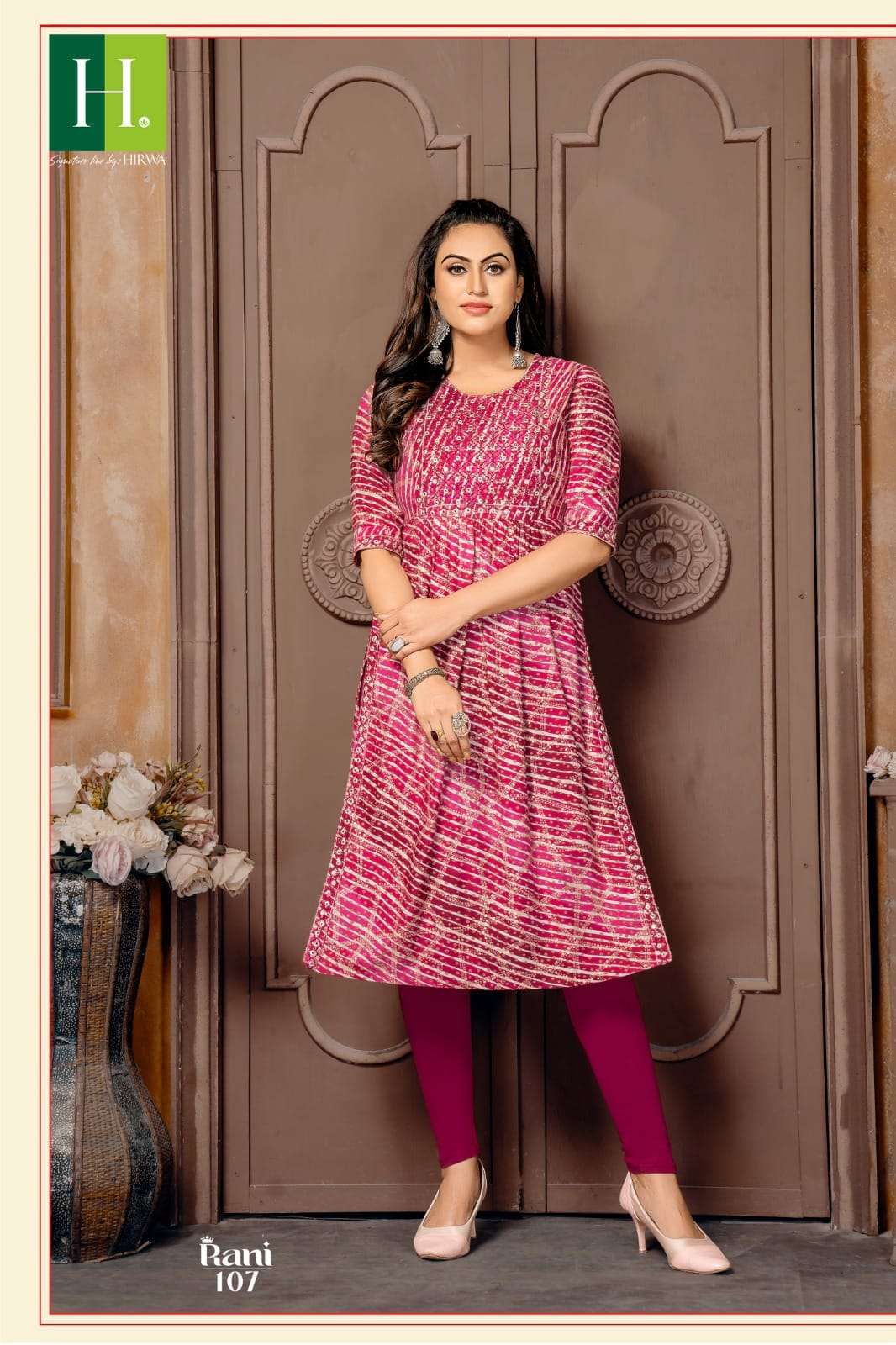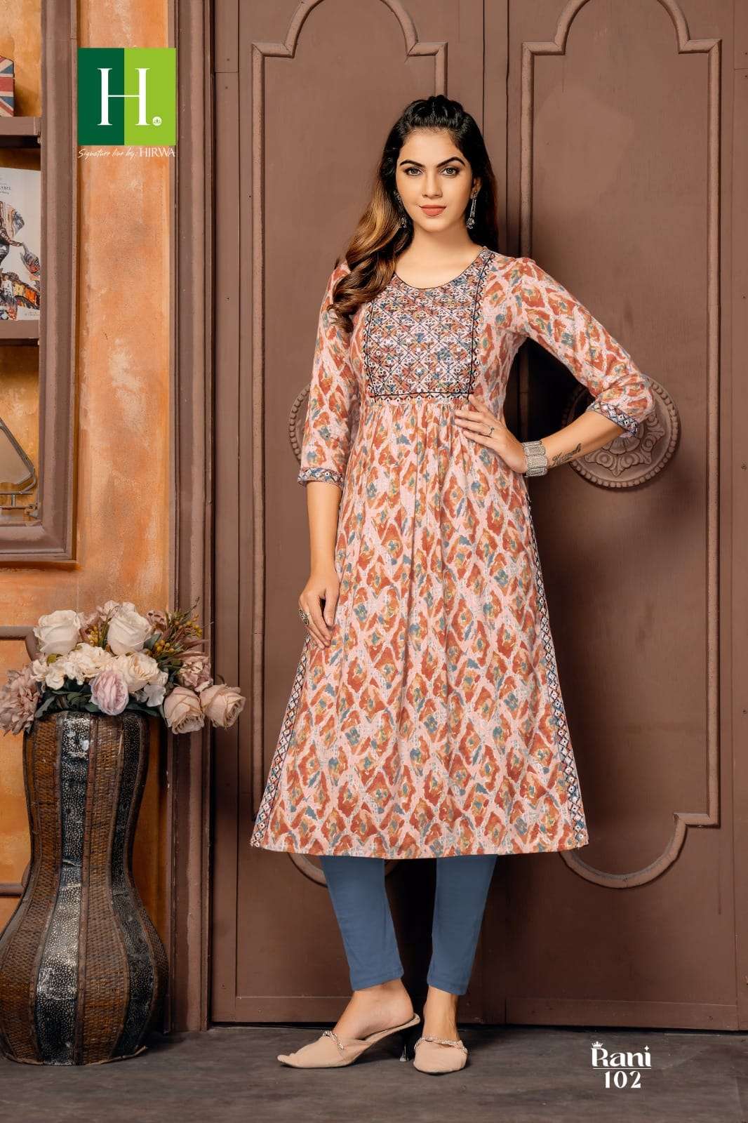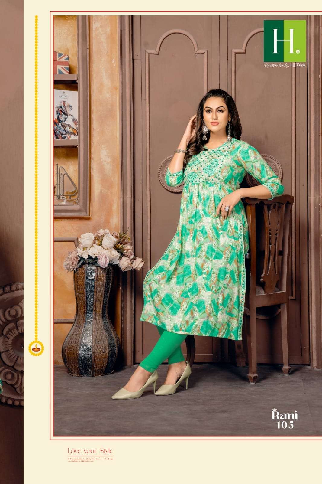 hirwa present rani rayon nayra cut fancy stitch kurtis supplier