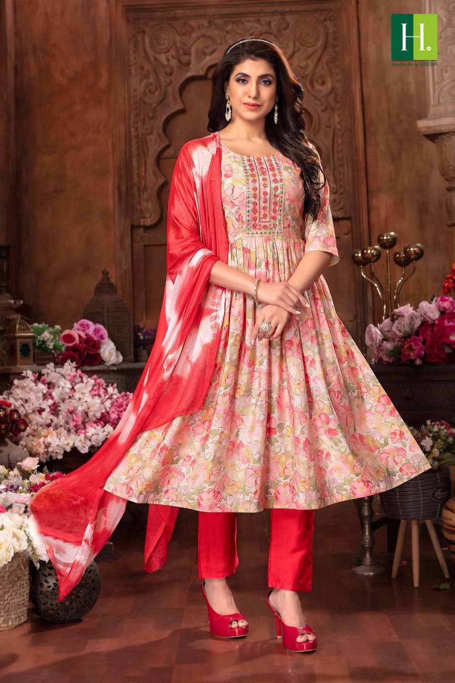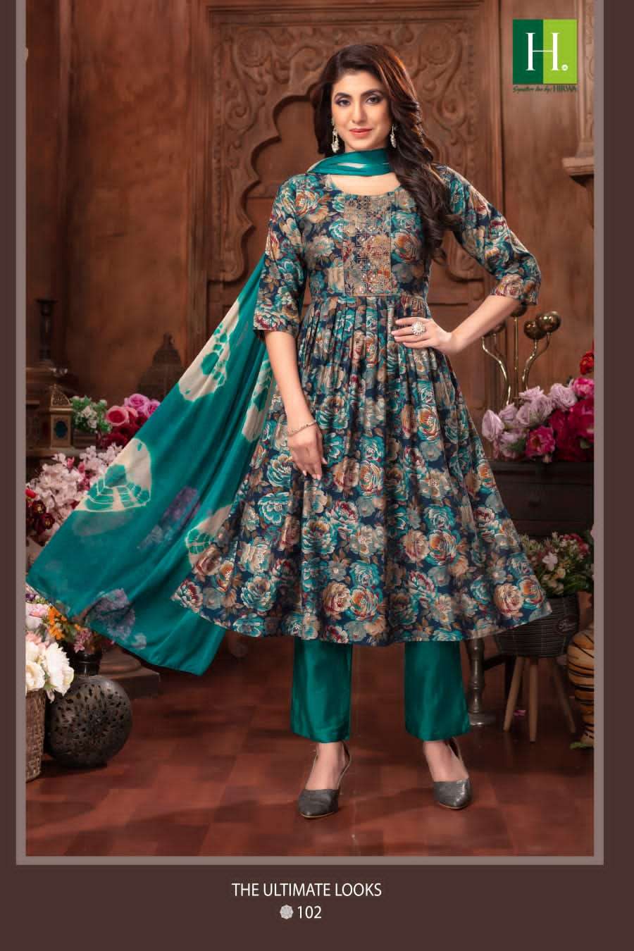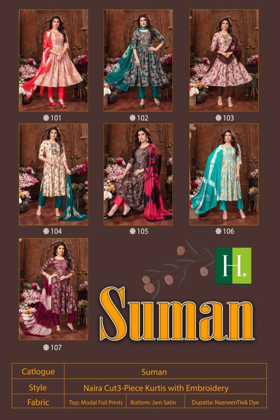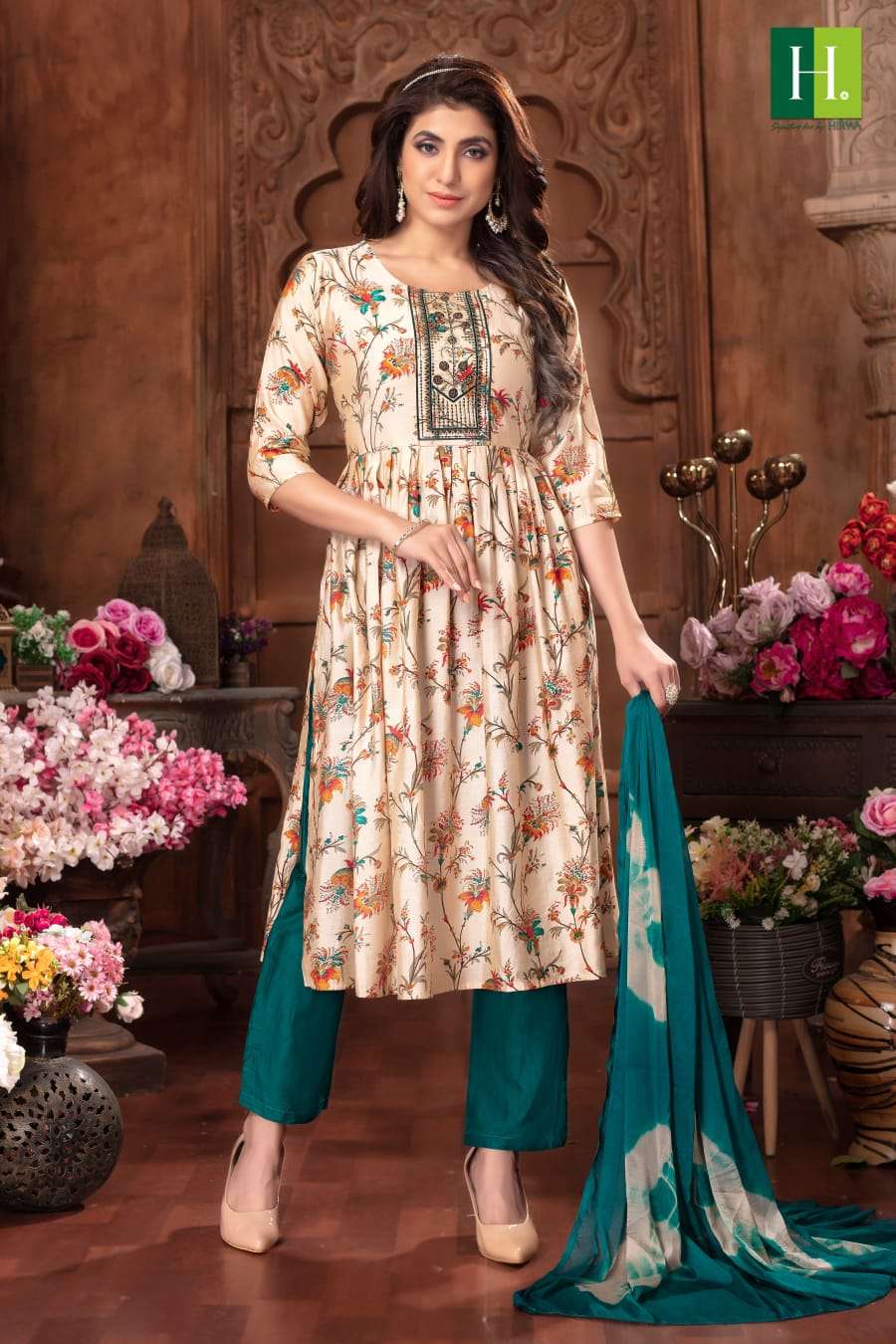 hirwa present suman fancy embroidery nayra cut kurti with pant nazneen dupatta catalog