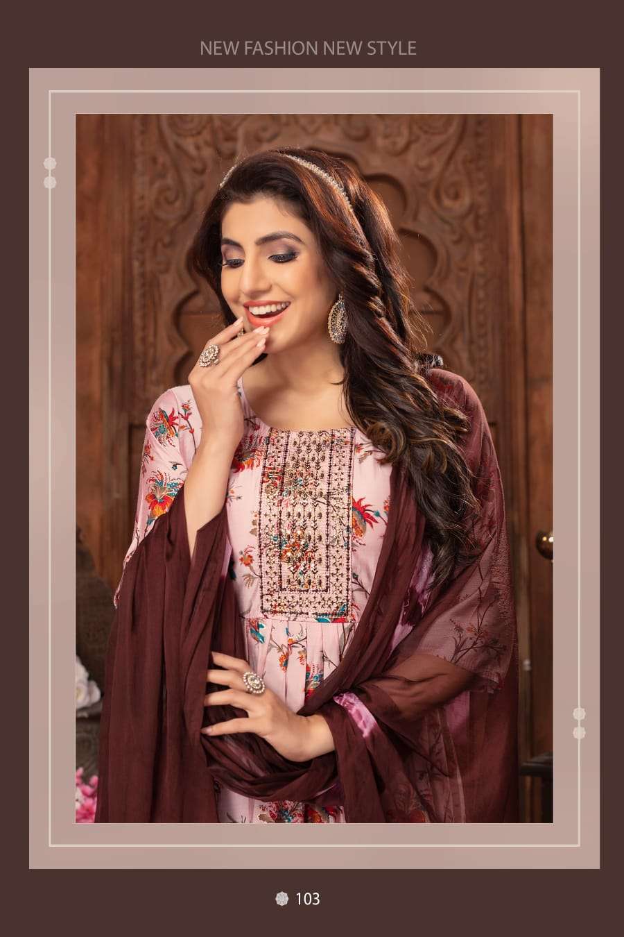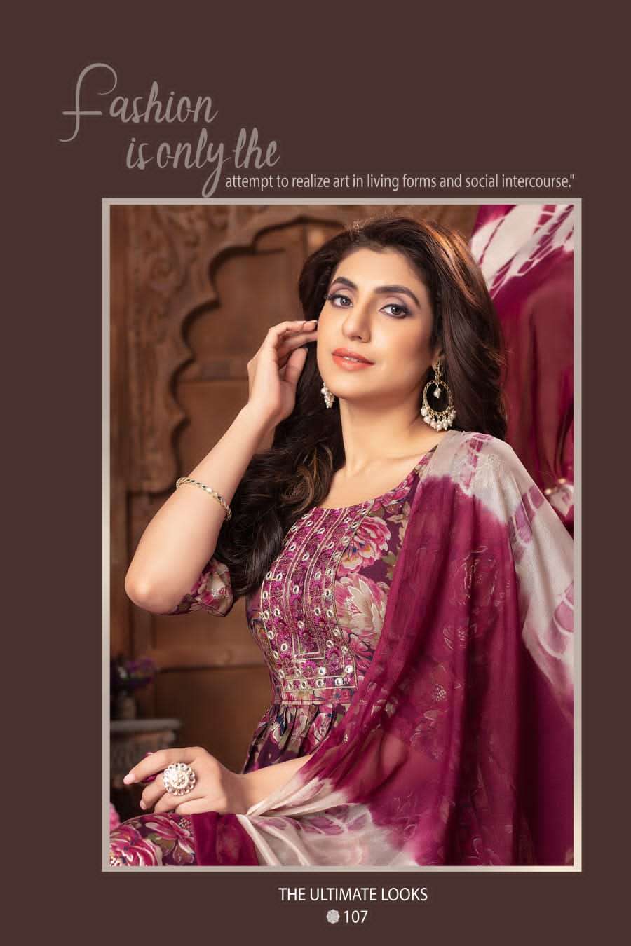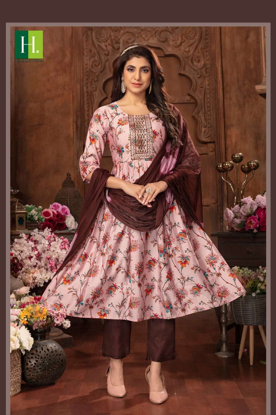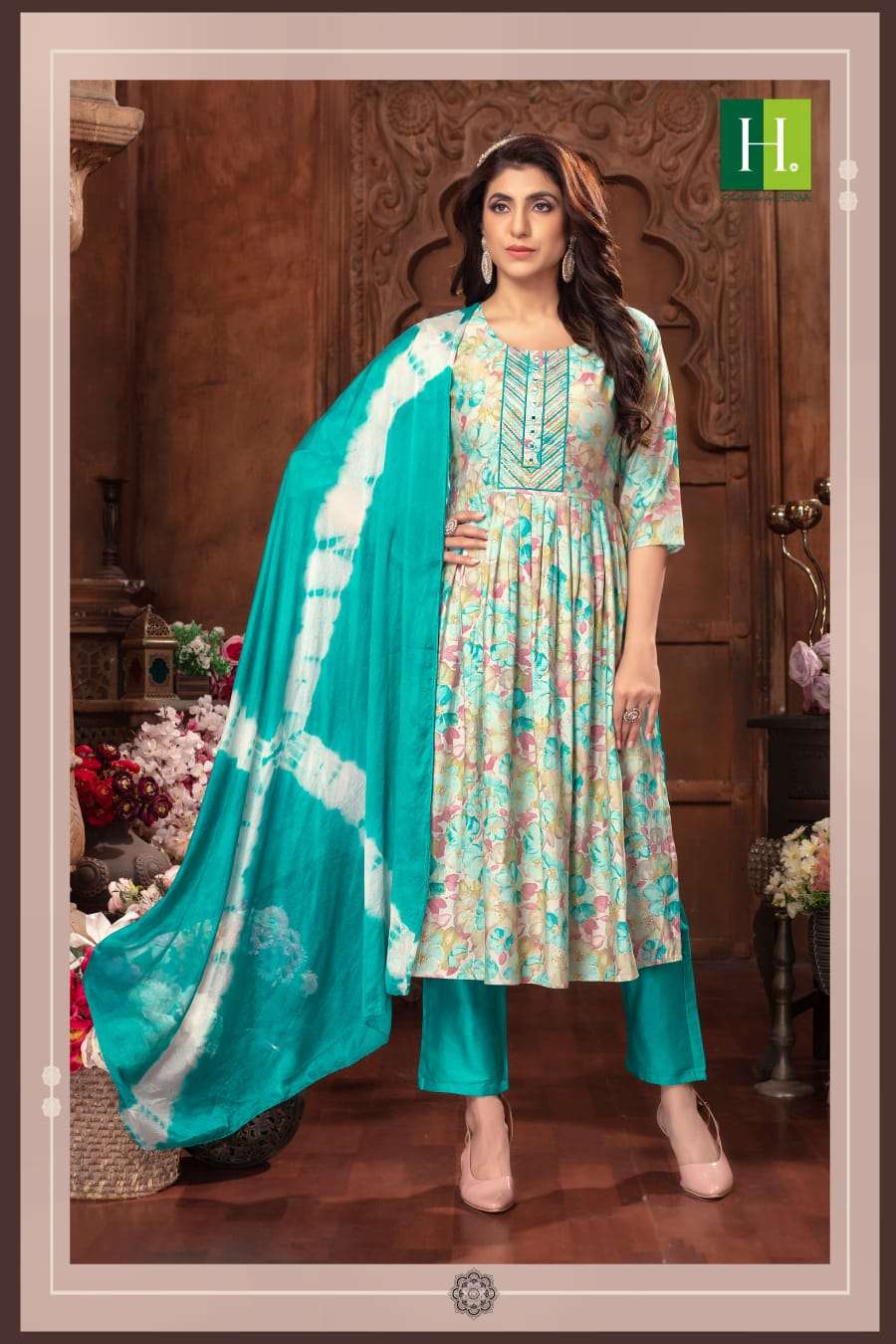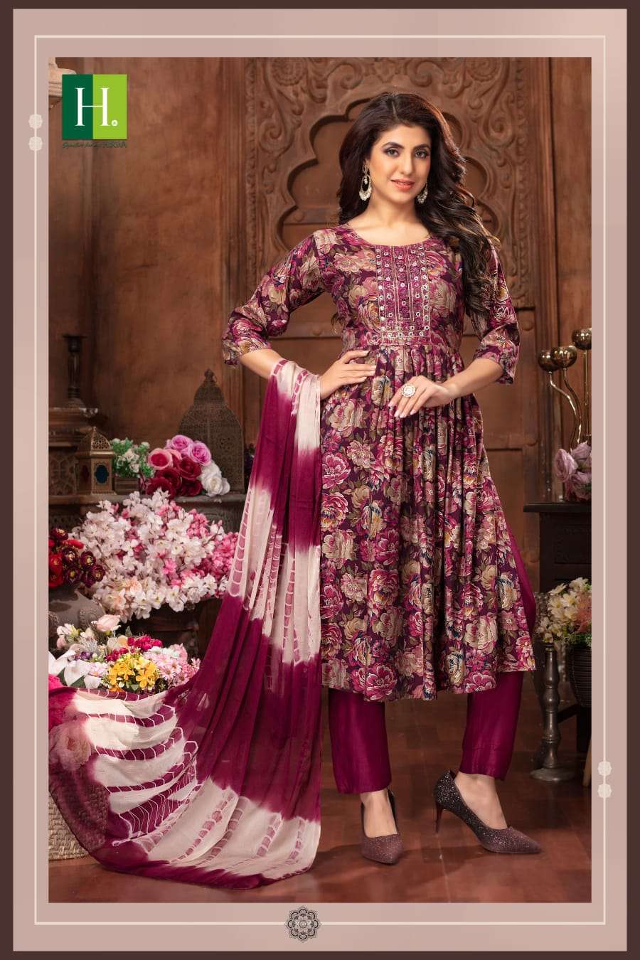 hirwa present suman fancy embroidery nayra cut kurti with pant nazneen dupatta catalog