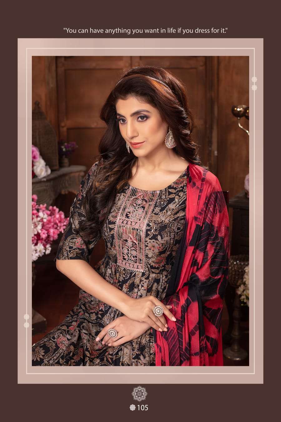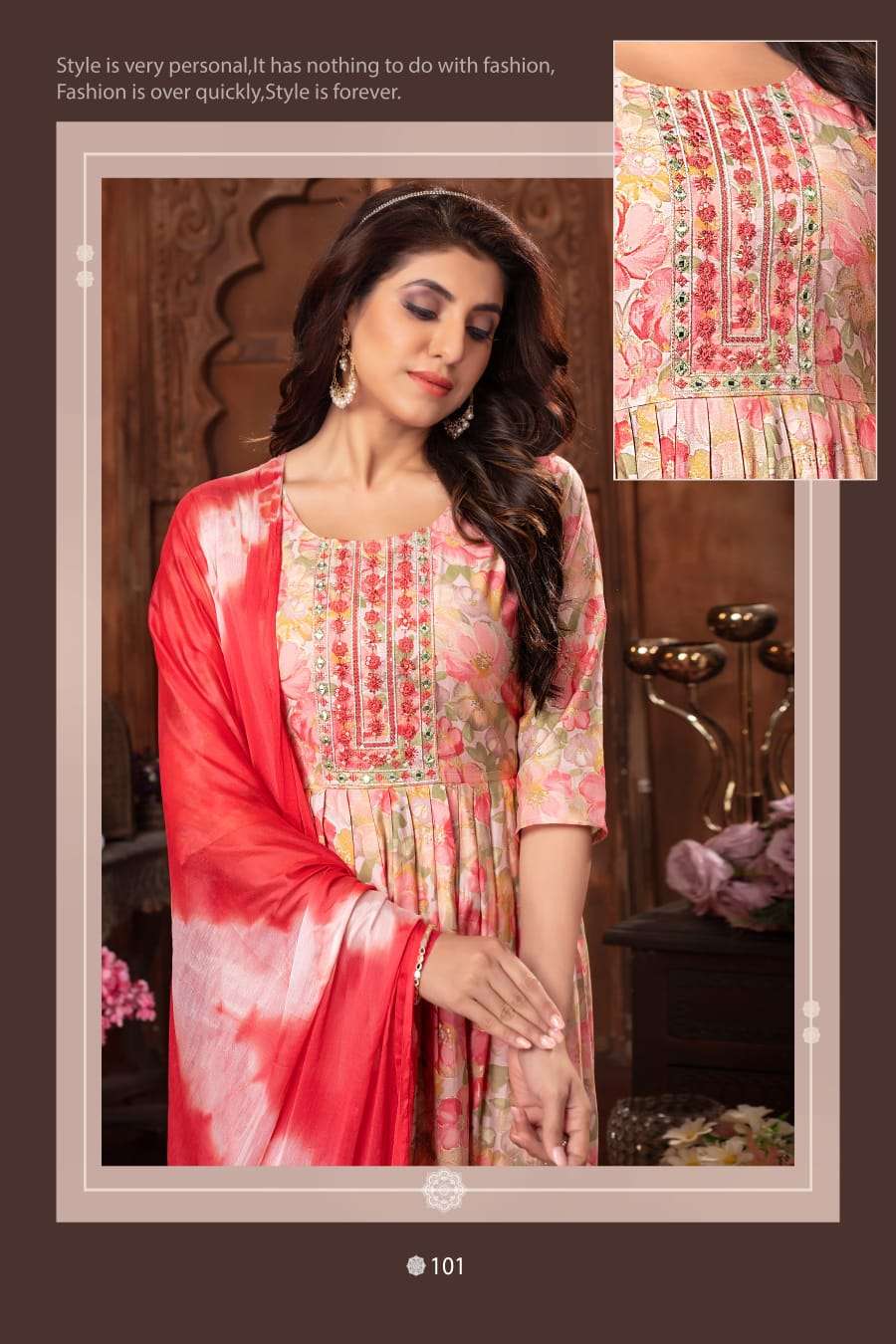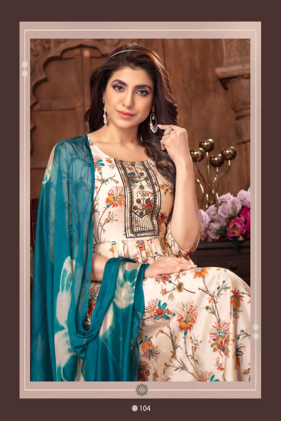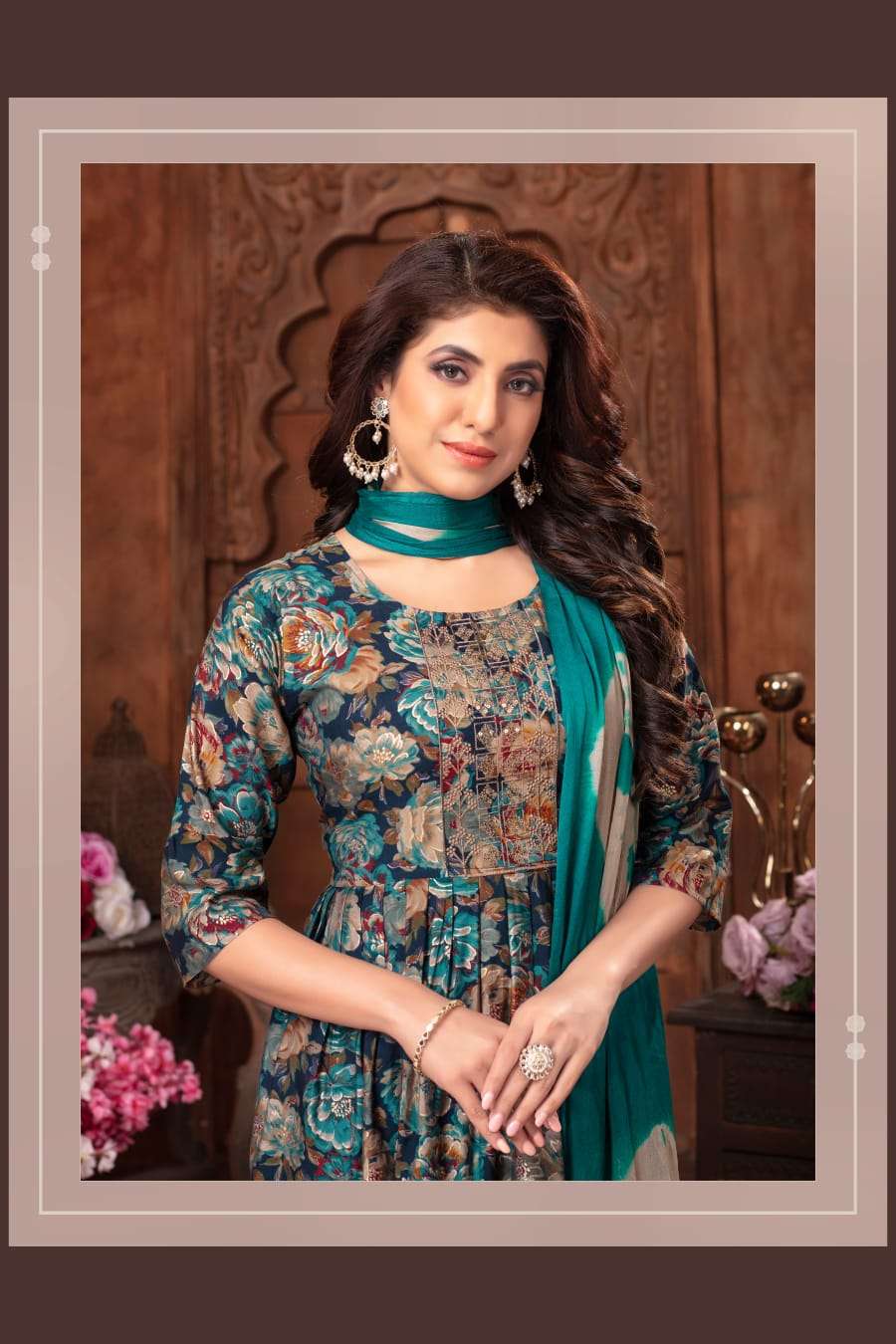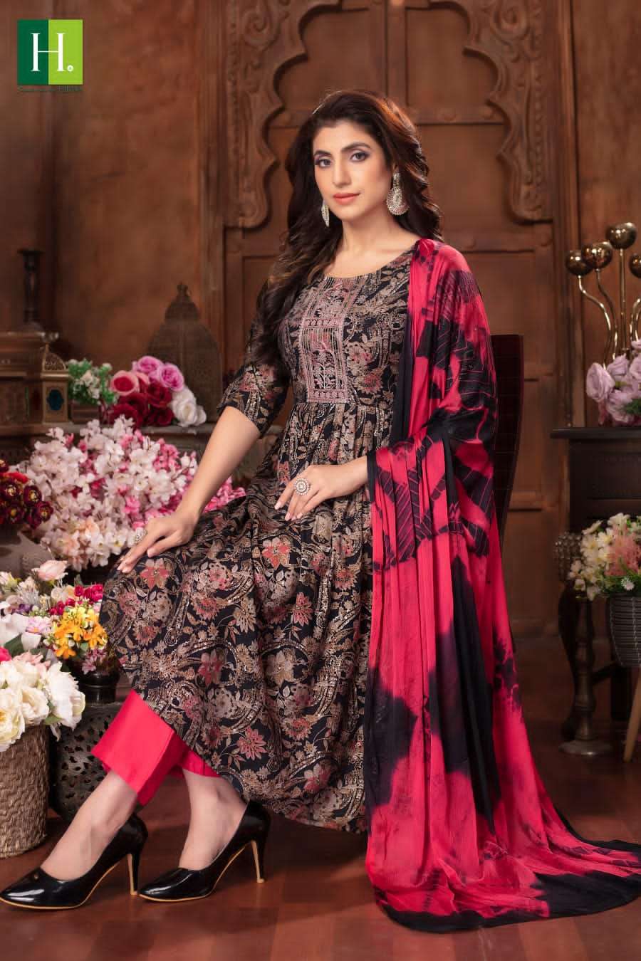 H.DOT by HIRWA presents its latest Naira cut 3-Piece catalog 📒NAME: SUMAN 👗 FABRICS: 👇 Kurti - Heavy Modal Foil Prints Pant - Heavy Jam Satin Dupatta - Nazneen Tie & Dye ✨ CONCEPT: 3-Piece (Top + Pant + Dupatta) Naira Cut Festive wear Kurtis with Embroidery Work ✨ LENGTH: 45"+ ✨ DESIGNS: 7 ✨ SIZES: S, M, L, XL, XXL & 3XL Rate: 950/- per pcs |