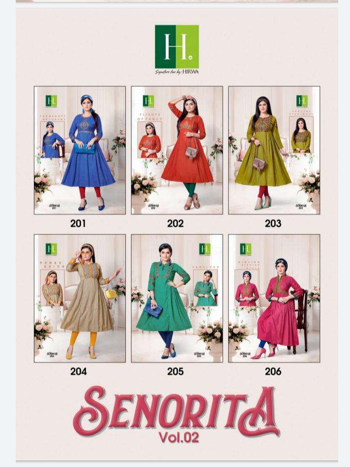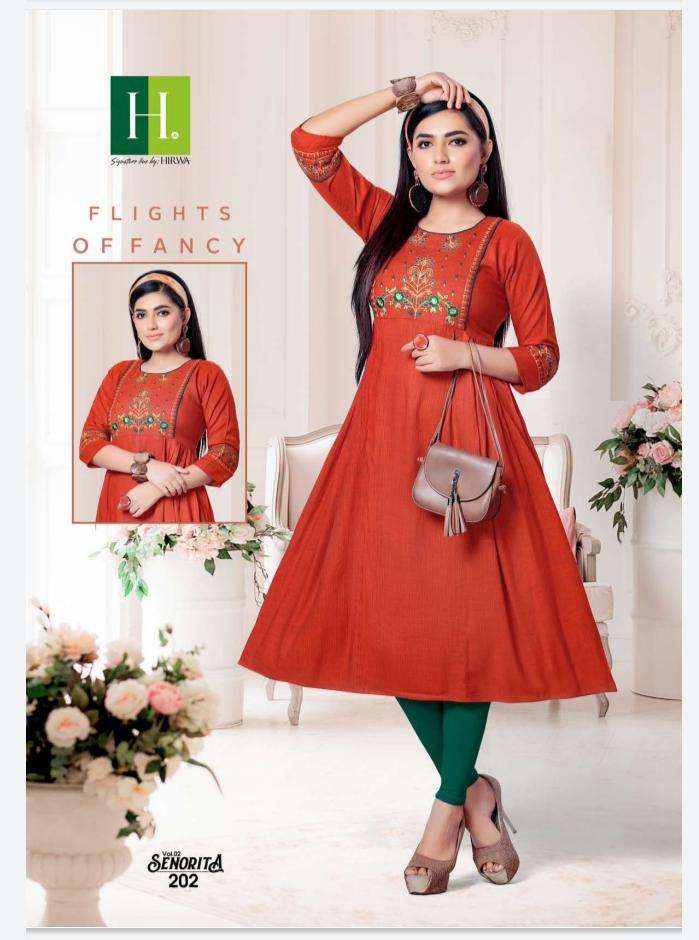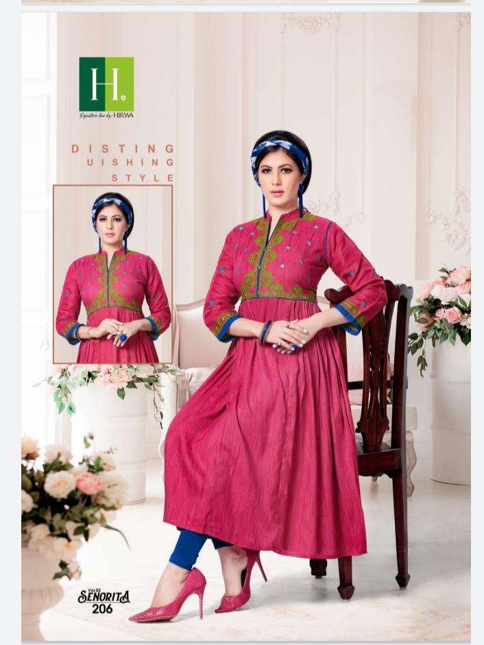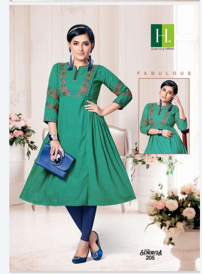 | Other Details | HIRWA presents it's new festive collection Kurti catalog Senorita (vol.2) Fancy Rayon With heavy Embroidery 6 Designs only Sizes: M, L, XL |
