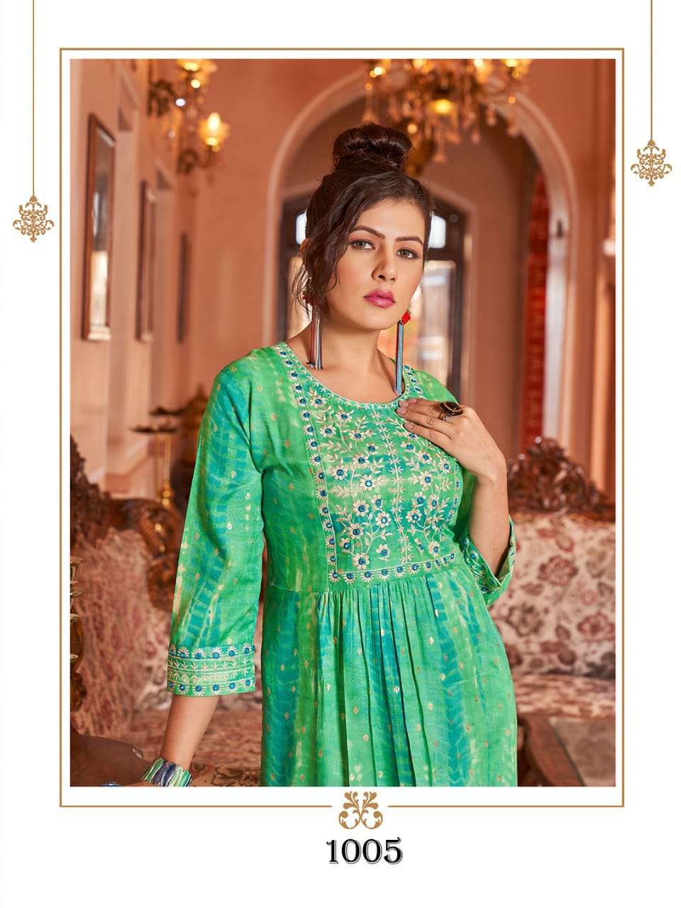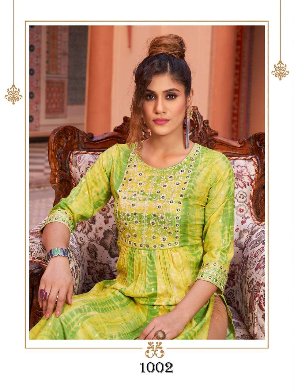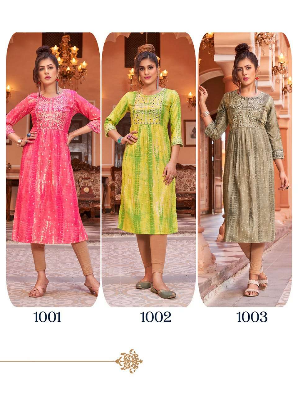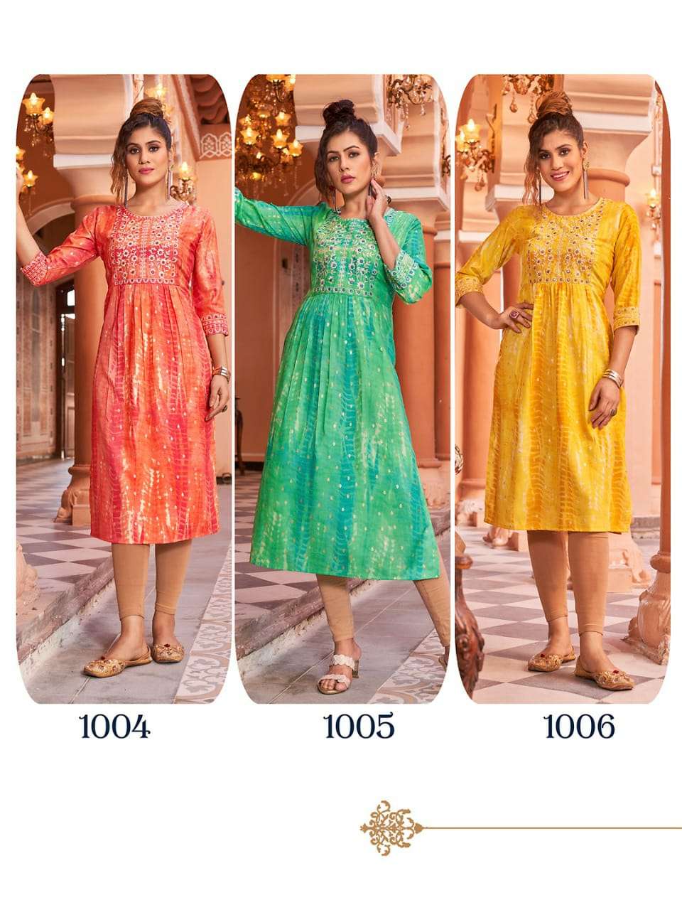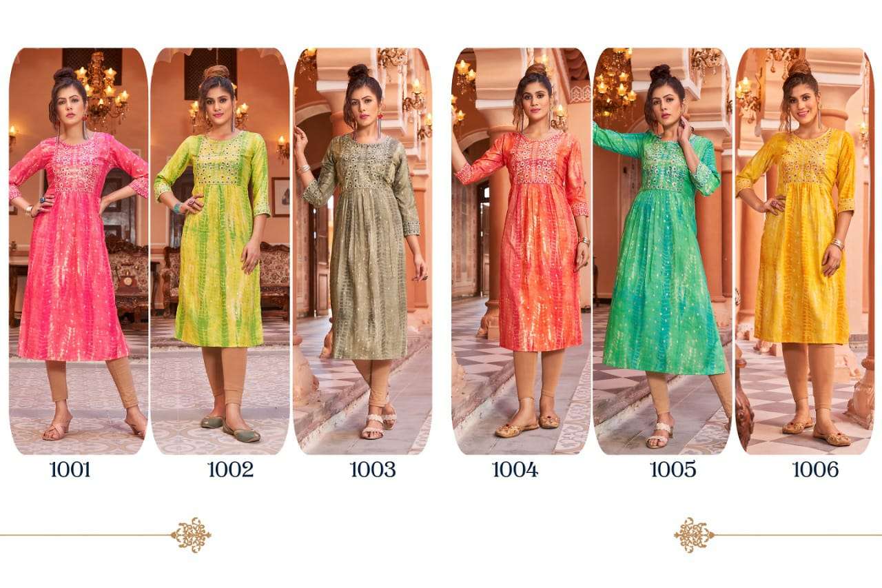 H.DOT FROM HIRWA PRESENTS its latest Catalog 📒NAME: SHIBORI 👗 Fabric: Heavy RAYON SHIBORI FOIL Prints Concept: Naira Cut Festive wear Kurtis with Embroidery Work 👗LENGTH: 45"+ ⚜️DESIGNS: 6 SIZES: S, M, L, XL, XXL & 3XL, 4XL & 5XL Rate: 550/- |
