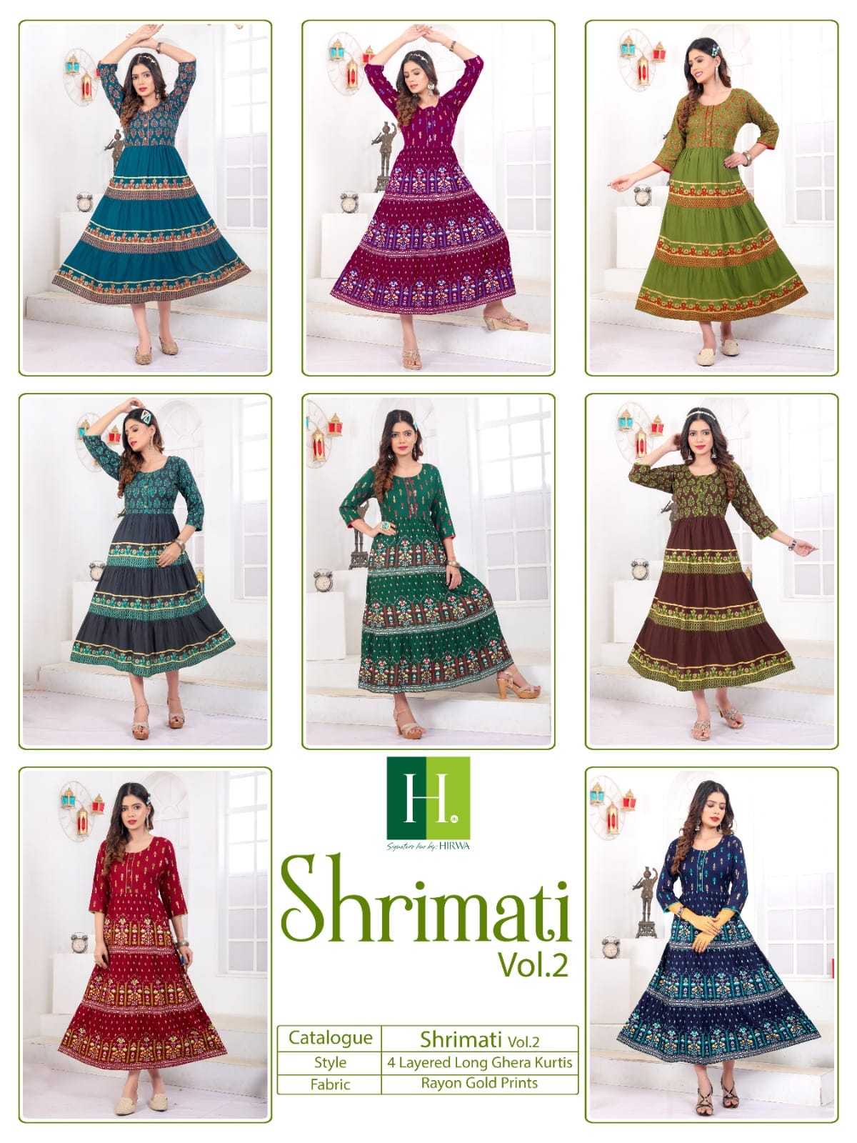 H.DOT FROM HIRWA PRESENTS its latest Ghera Catalog 📒NAME: SHRIMATI VOL-2 👗 Fabric: Heavy Rayon Print Concept: Ghera Kurtis ⚜️DESIGNs: 8 SIZEs: M, L, XL, XXL Rate: 465/- |