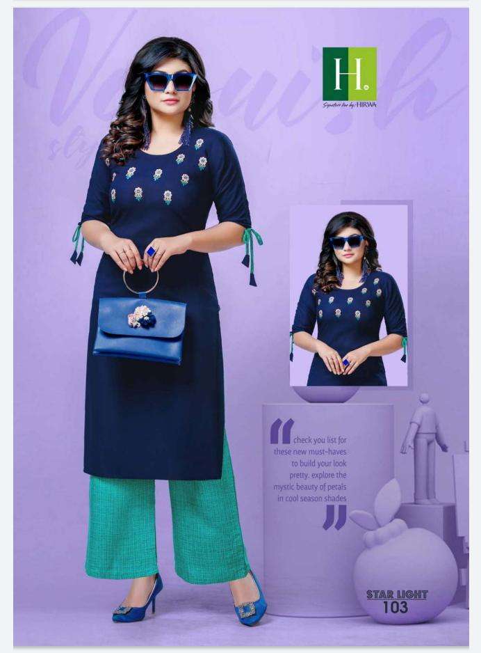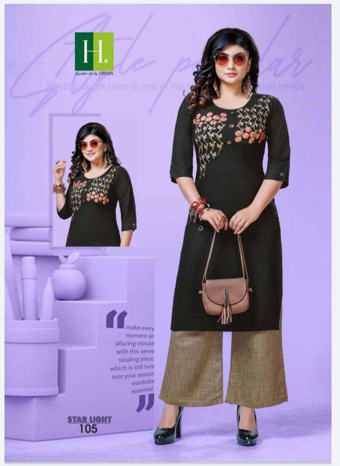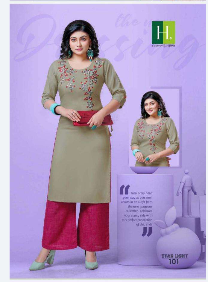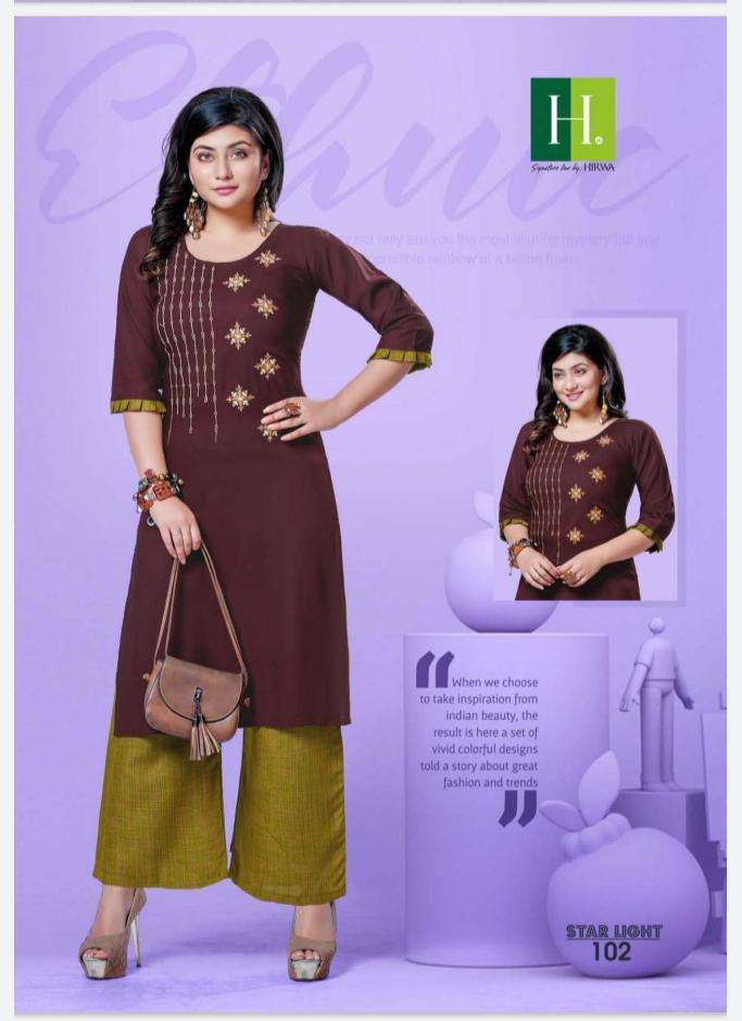 HIRWA PRESENTSÂ NAME: STARLIGHT TOP: RAYON Â WITH EMBROIDERY WORK BOTTOM: RAYON PRINT (With pocket)Â CONCEPT: STRAIGHT TOP WITH PLAZZO LENGTH: 44" DESIGN: 6 SIZE: Â S,M,L, XL, XXL |