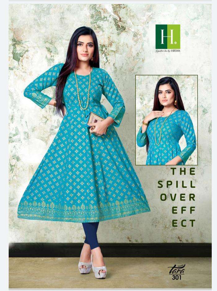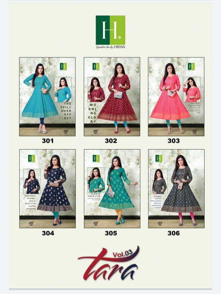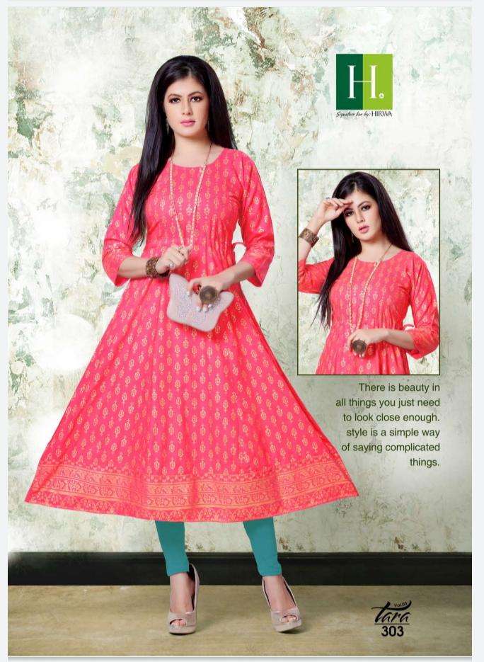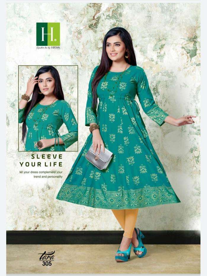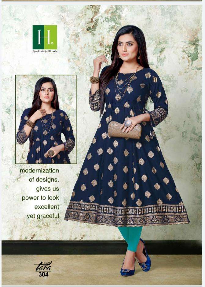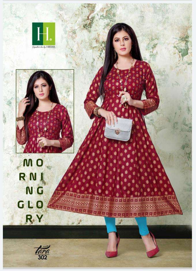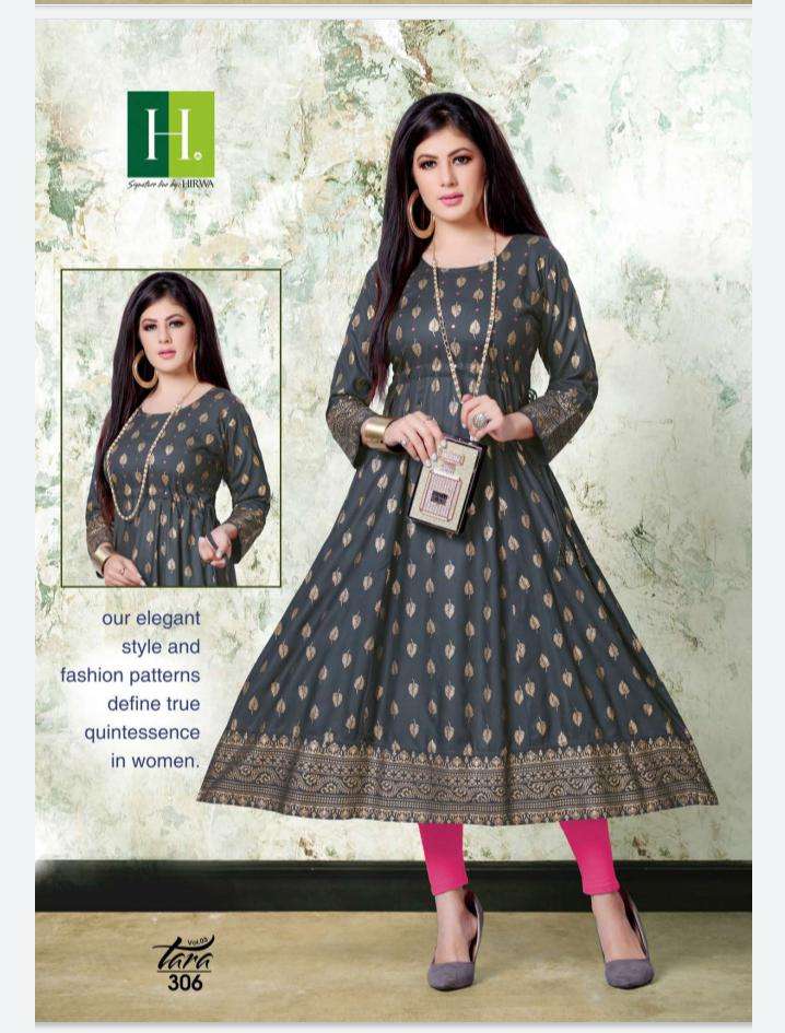 HIRWA presents its latest anarkali kurti catalog Tara-3 Heavy Quality Rayon Gold prints with mirror work Interlock on every kali. 45+" Length. 6 Designs. Sizes available: , M, L, XL, XXL Â |
