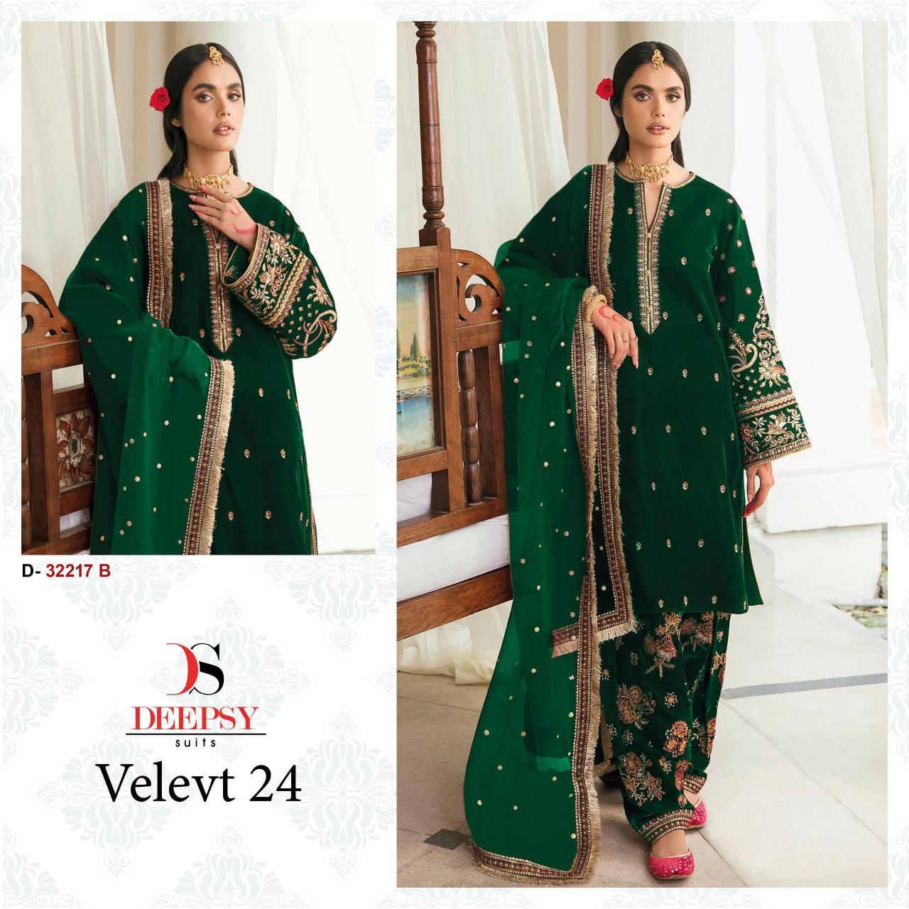 HIT DEISGN OF VELVET-24 by DEEPSY SUITS Top -Velvet with heavy embroidery Bot - Velevt with heavy embroidery Dup - organza with heavy embroidery Pcs: 4 *Rate - 1499+Gst |