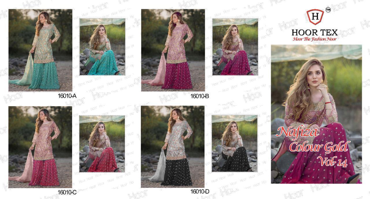 Nafiza Colour Gold vol-14 16010-A-B-C-D Fabric details Top : HEAVY NET (WITH WORK + STONE WORK) Bottom :HEAVY GEORGETTE (WITH WORK) inner : SANTOON Dupatta : HEAVY NET (WITH MOTI WORK) Price : 1299/- GST 5 Percent Extra Size - Can stich Up to 52. DISPATCHING DATE:-13-02-2020 (THURSDAY) PREE BOOKING ONLY Hurry up... LIMITED STOCK book your order fast Limited stock REGARD HOOR TEX |
