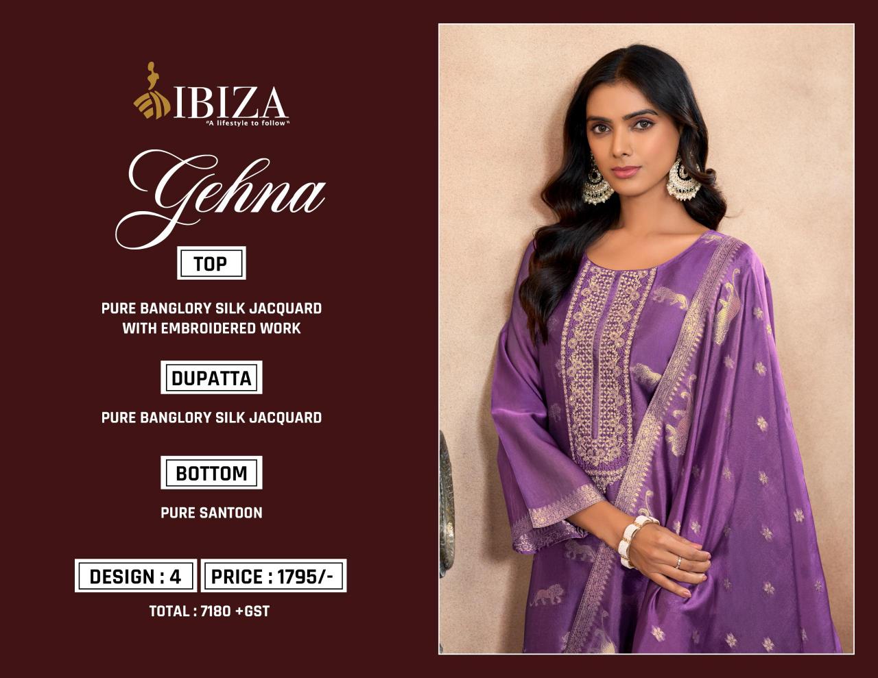 🙏🙏🙏IBIZA🙏🙏🙏 NEW SERIES ✌🏻GEHNA✌🏻 👊Fabric Details👊 👗Top:-PURE BANGLORY SILK JACQUARD WITH EMBROIDERED WORK 👖Bottom:-PURE SANTOON 🔻Designs:- 4 PCS Rate:- 1795/- Regards |