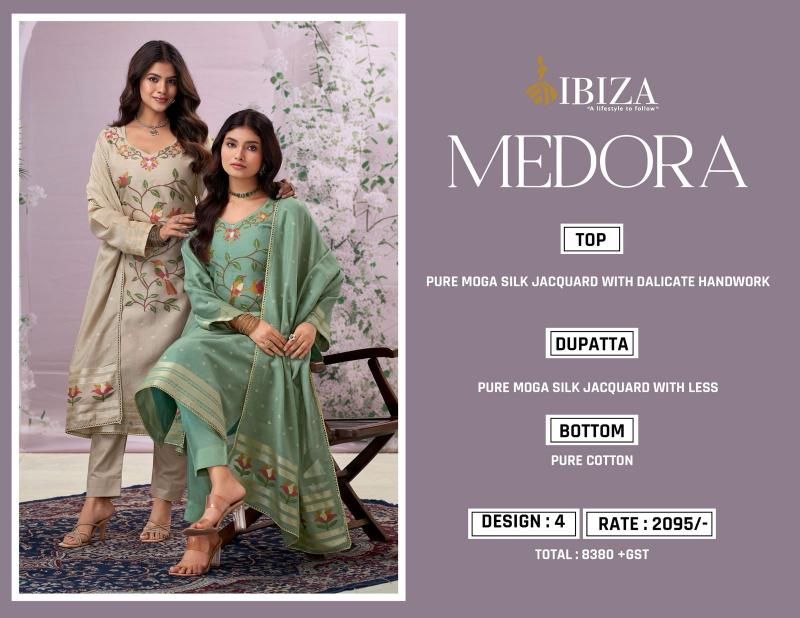 🙏🙏🙏IBIZA 🙏🙏🙏 NEW SERIES ✌🏻MEDORA✌🏻 👊Fabric Details👊 👗Top:-PURE MOGA SILK JACQUARD WITH DALICATE HANDWORK 👖BOTTOM:PURE COTTON 🔻Designs: 4 PCS Rate:-2095 |