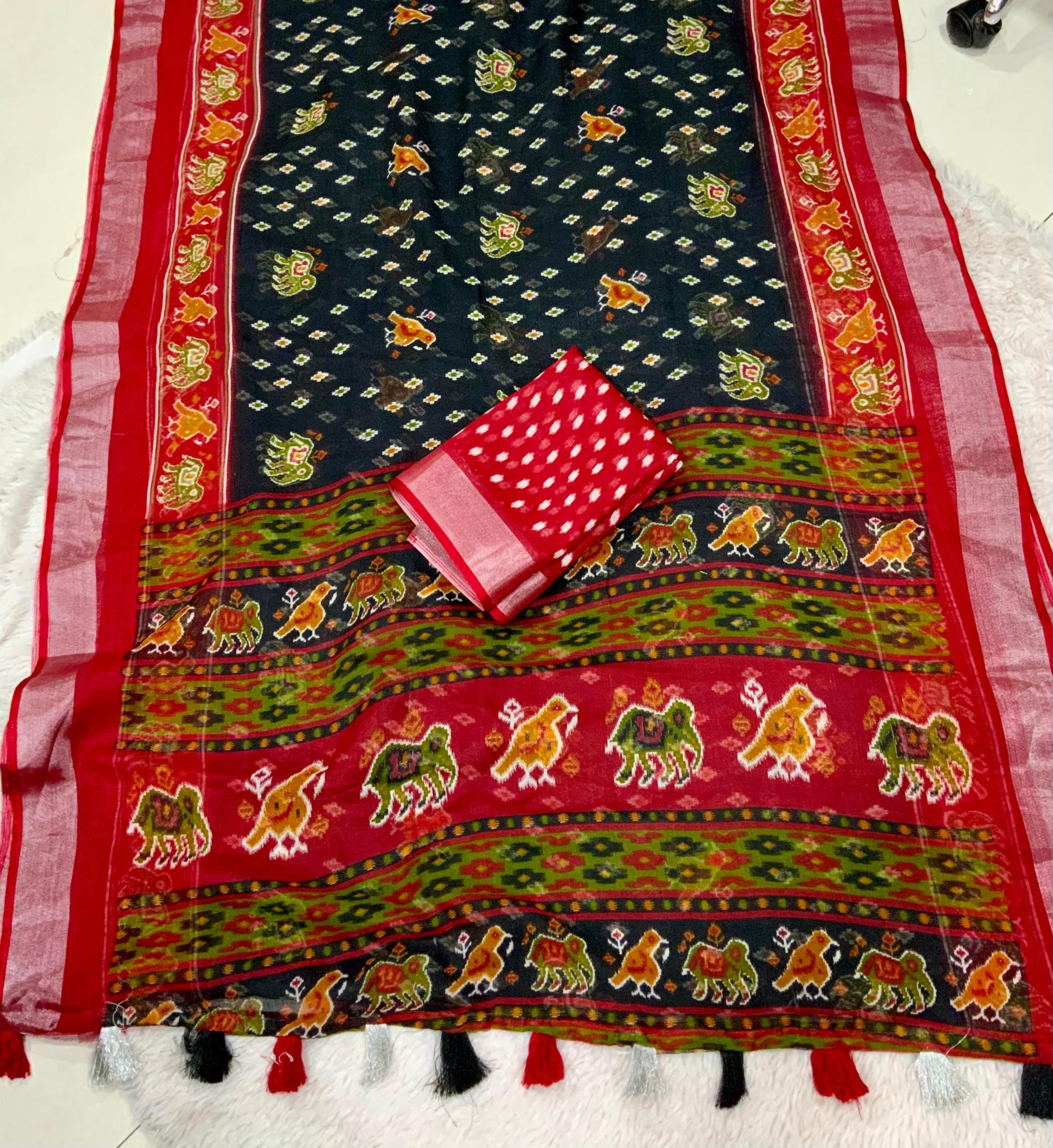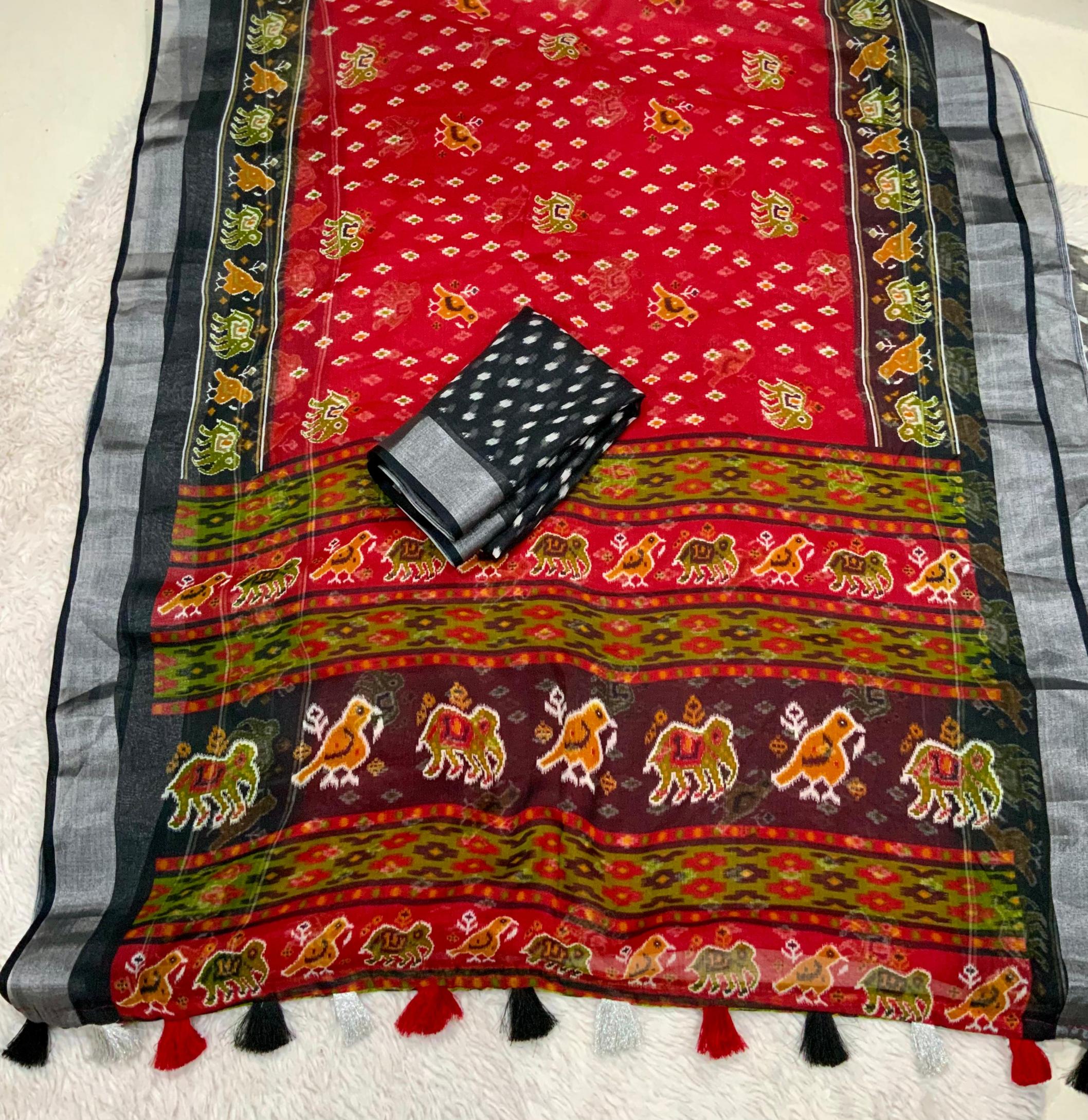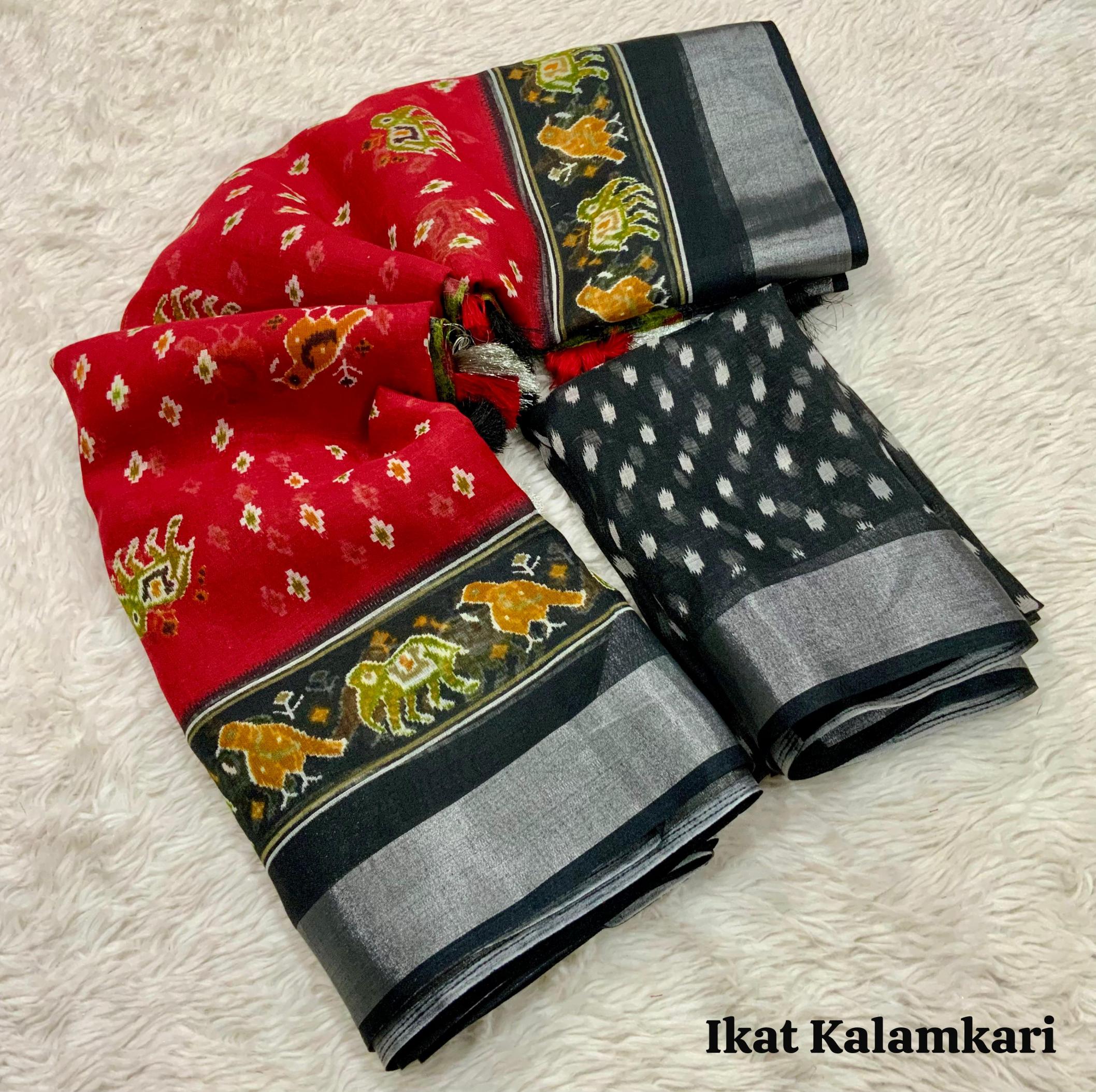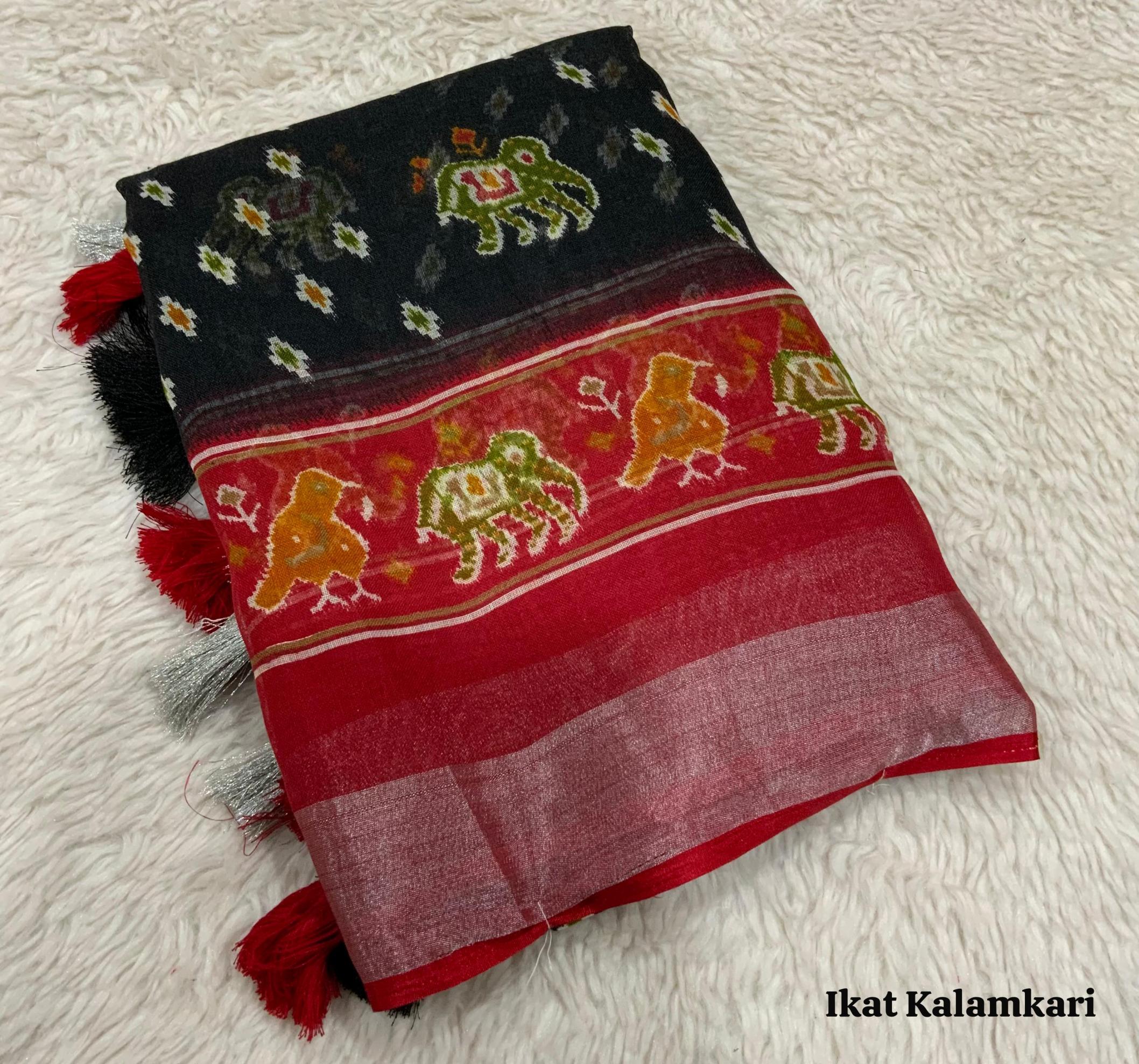 ”ikat print Design” New Red Black colour Edition From AND. Quality - Soft Linen Cotton Saree With silver Jari Border & ikat prints all over saree. Cotton Tassles on pallu. Blouse - ikat print Running Blouse. Rate - 550+ship Top premium quality |
