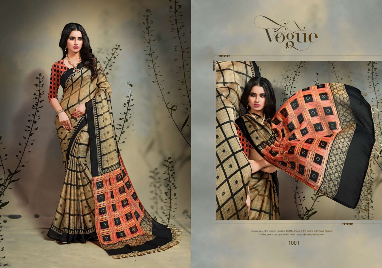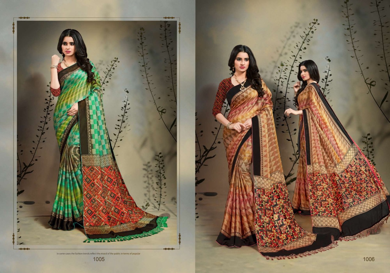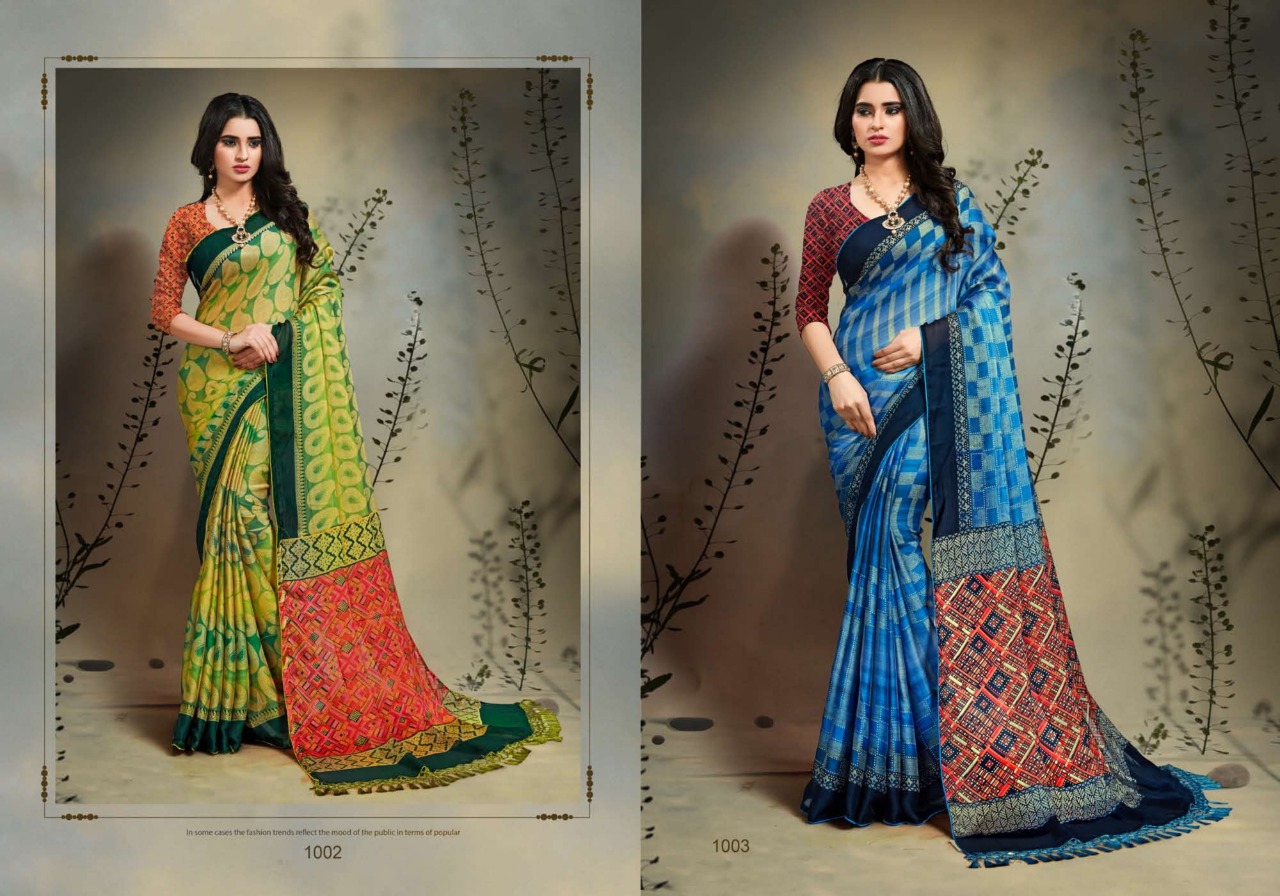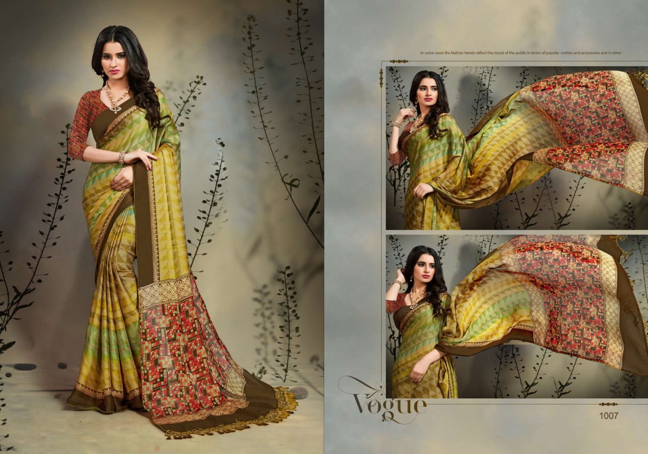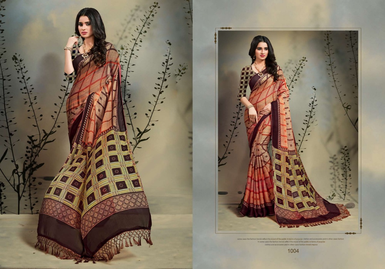 Inaya Vol.1 _Brand:- MANSAROVER FASHION Rate:- 499/* _Fabric:- Moss chiffon Regular contrast blouse with Dori piping Jalar Pallu Total Designs:- 08 _Packing pcs :- set to set Matching :- Single COLOR Single Designh Cut :- 6/30mtr |