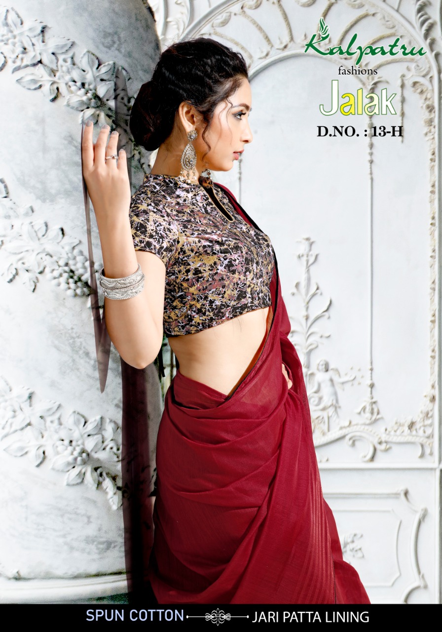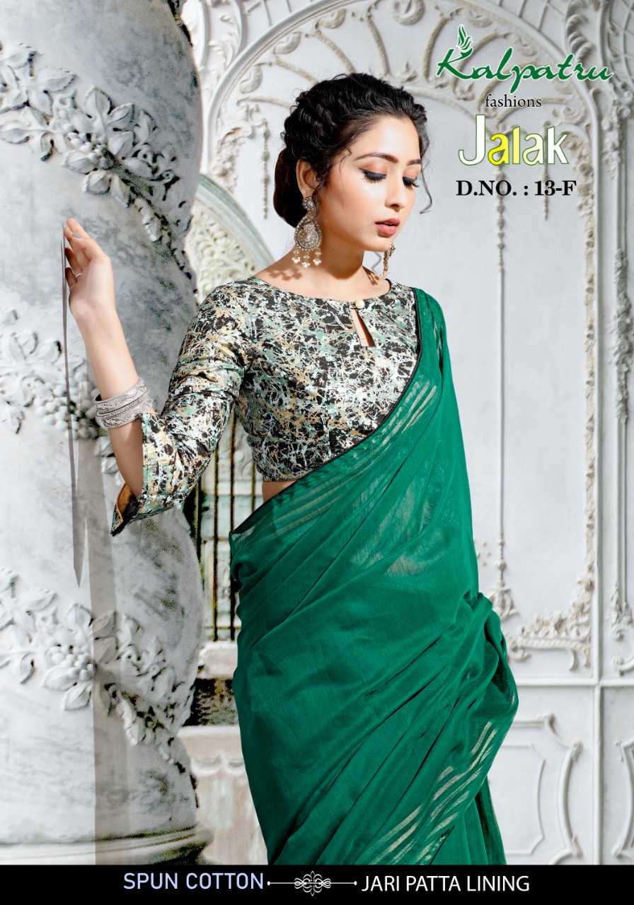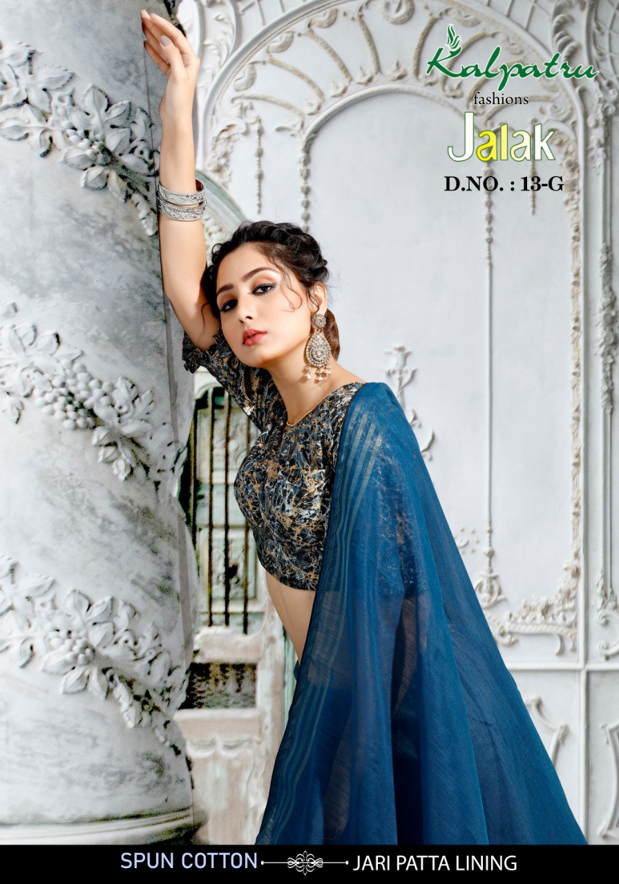 We are launching our new Saree Catalog Brand – KALPATRU FASHION Catalog Name : JALAK Fabrics – Spun Cotton With Jari Patta Lining Cut - 6.30 Mtr * Set to set * Rate 599/- Pc – 03 GST 5 Percent Extra. Book your order now . |