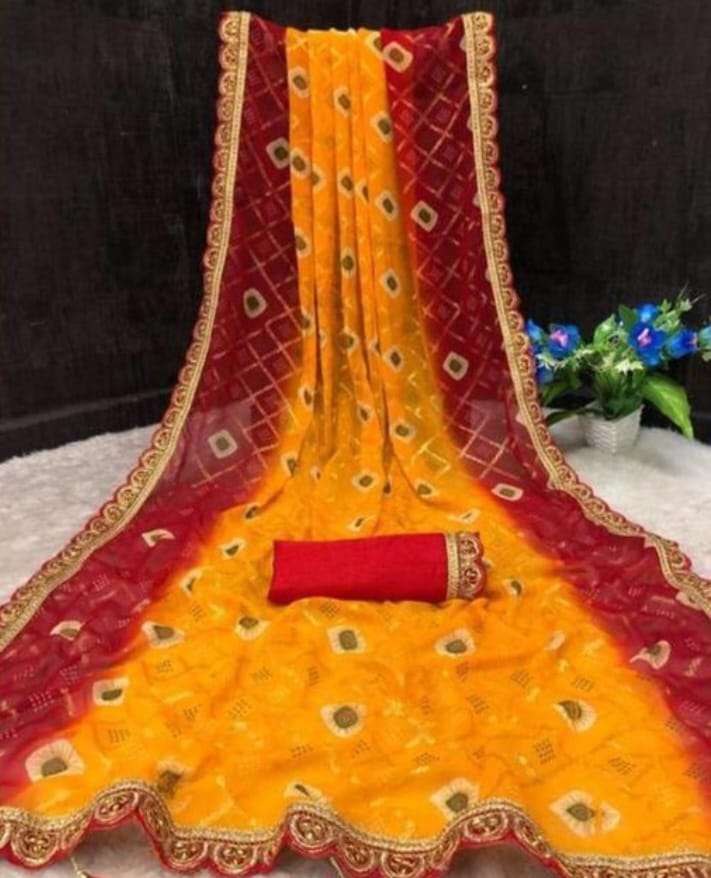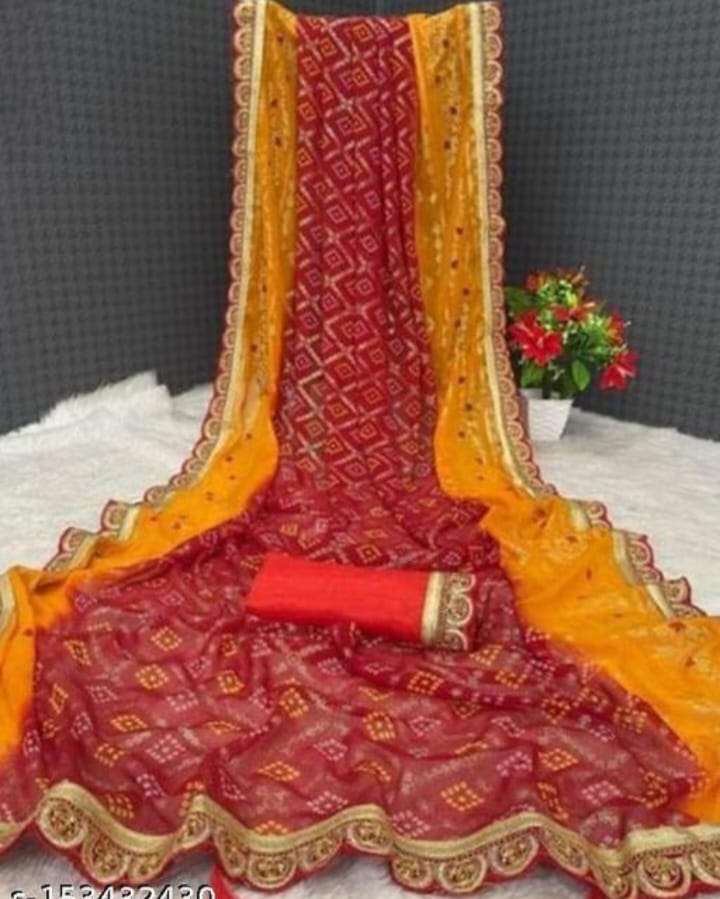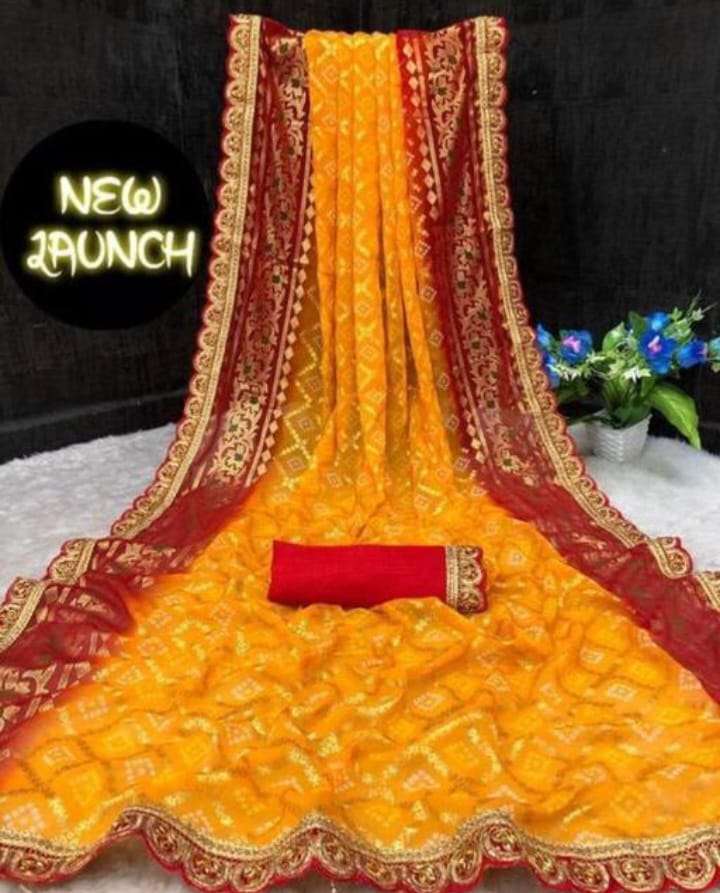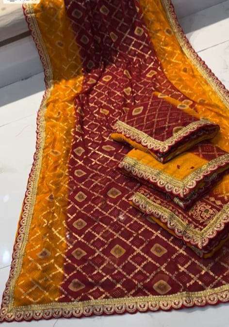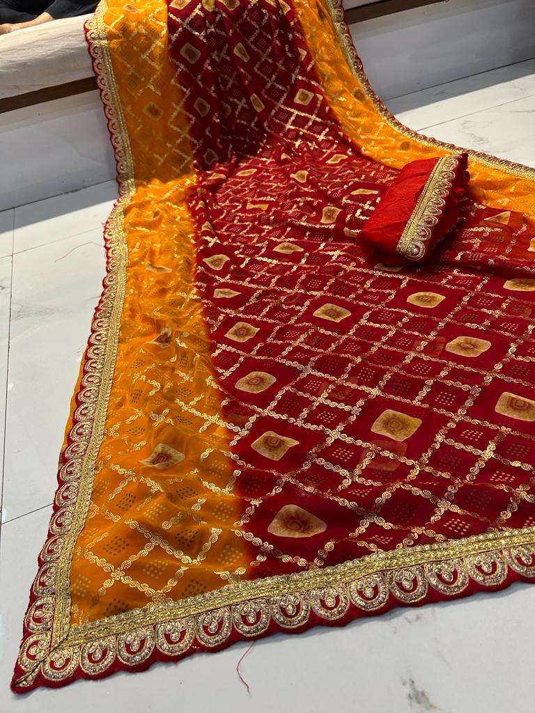 NEW RATEWISE BANDHANI CATALOUGE WITH MILL FOIL & WORK LACE NAME - RUKMANI PCS - 4 PCS FABRIC - GEORGETTE |