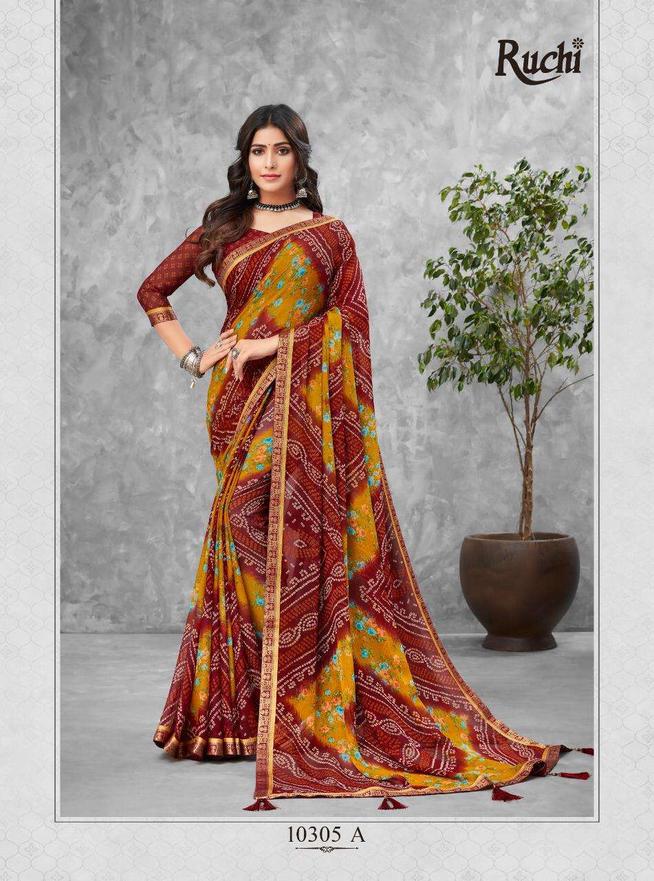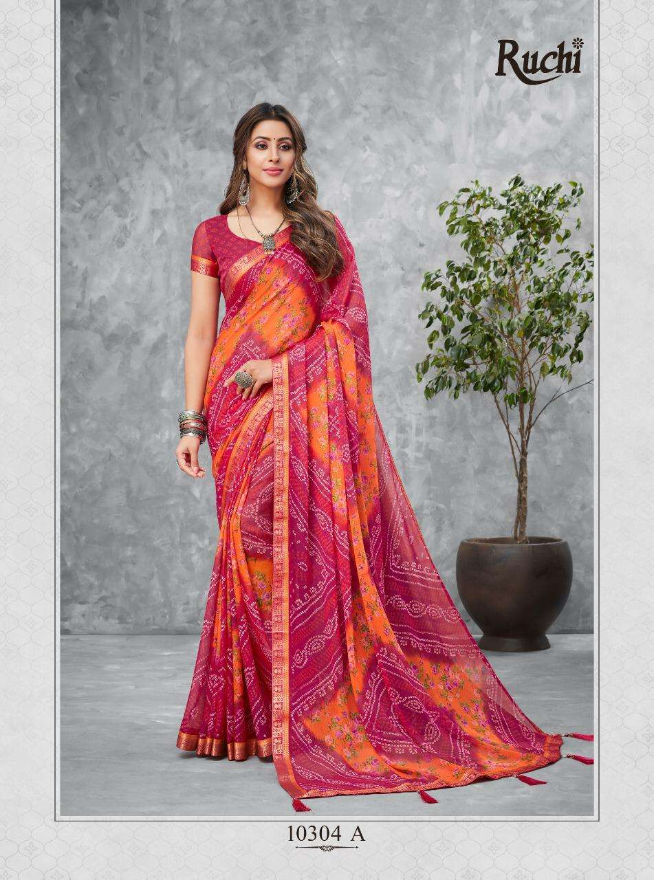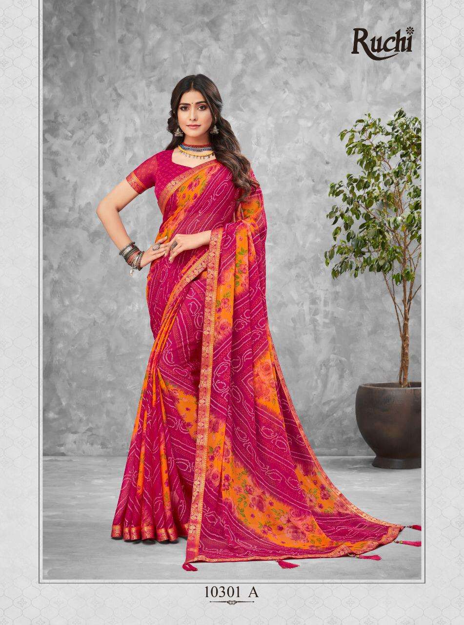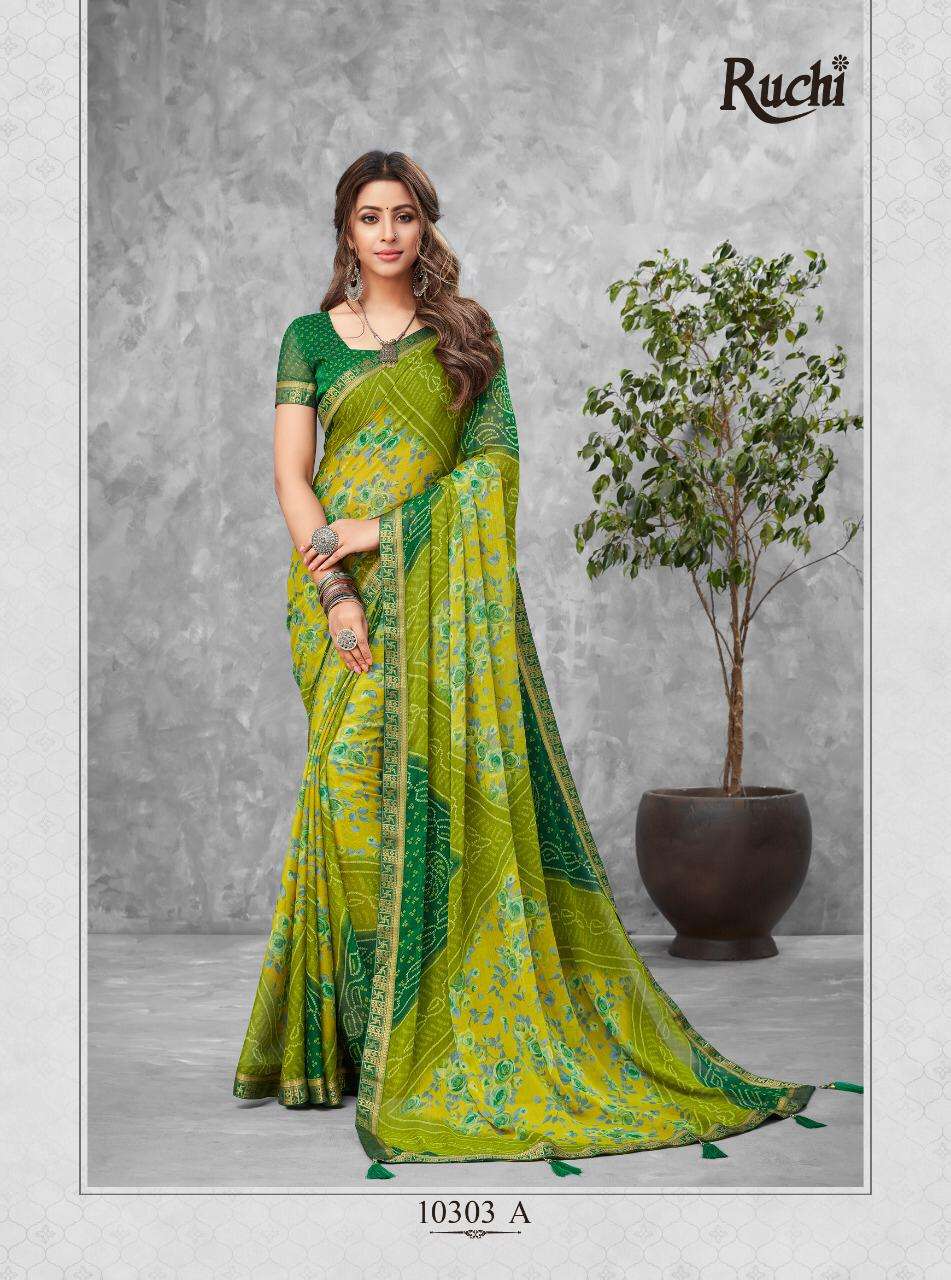 BRAND NAME  :- RUCHI SAREES CATALOG NAME - JALPARI. SERIES â 10301A TO 10306B FABRIC - CHIFFON WITH BORDER & TASSELS. PCS.- 12 WEIGHT - 450 GRAMS APPROX. RATE â 521/- per pcs GST 5% EXTRA |