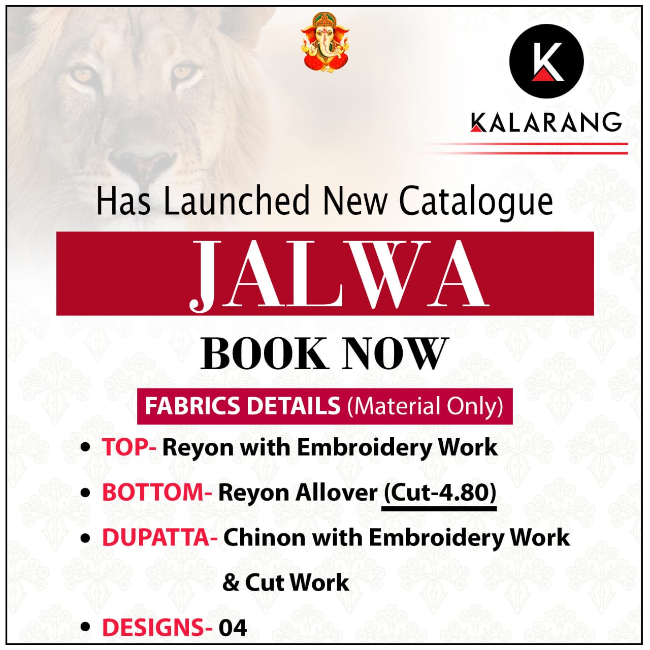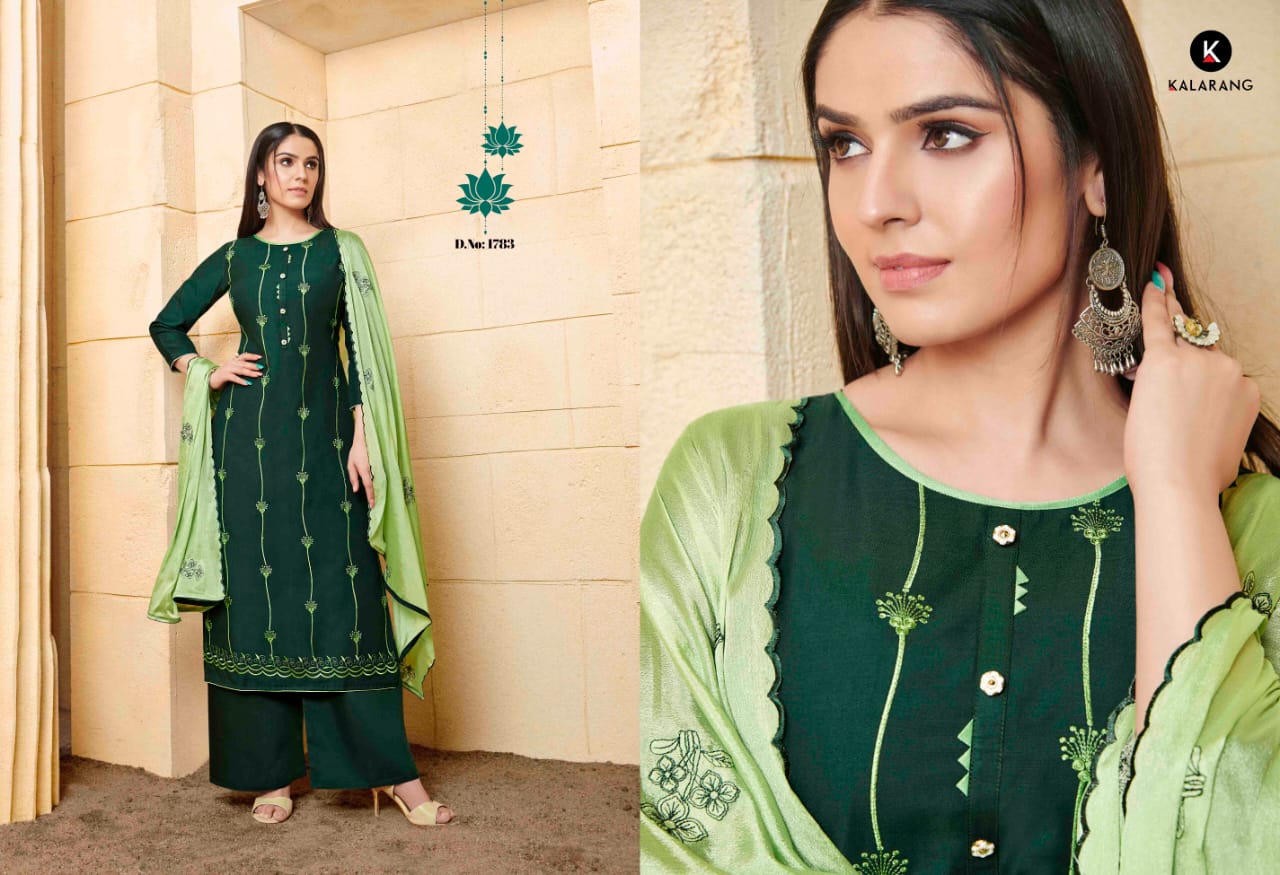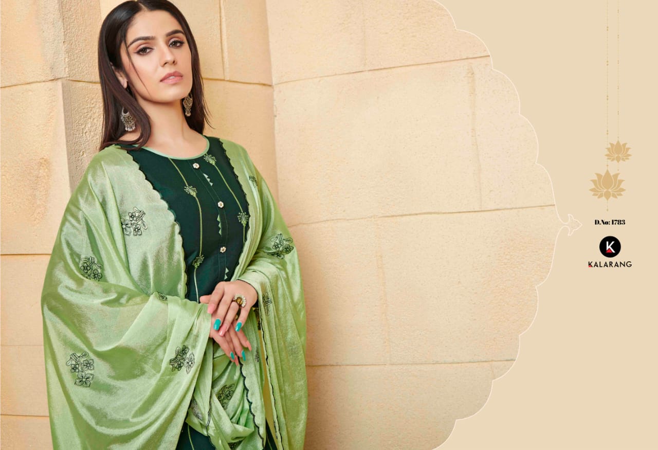 📌 KALARANG has launched Catalog name : * JALWA * 🔸 Fabric Details 🔸 👚Top:- Reyon With Embroidery Work 👖Bottom:- Reyon Allover (Cut-4.80) 🧣Dupatta:- Chinon With Embroidery Work & Cut Work 👜Total Design:- 4 ⏰Dispatching 5 to 6 days later Rate 575 per Pcs. Set to set. GST 5 Percent Extra |