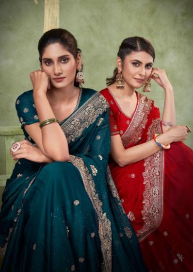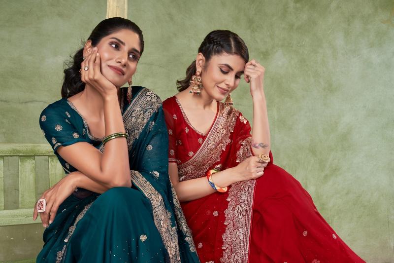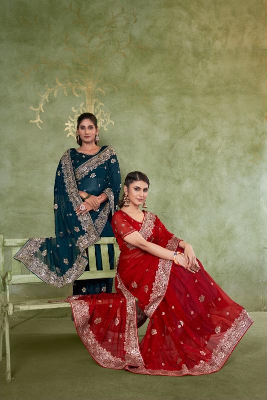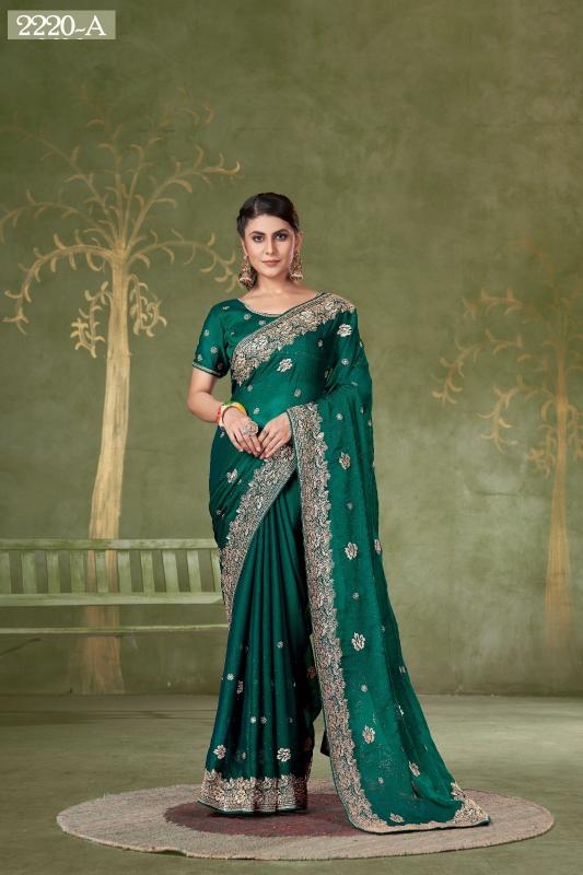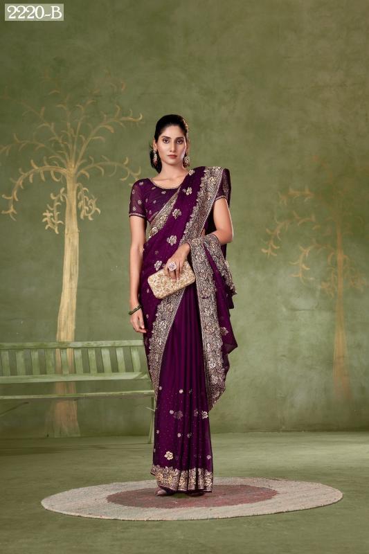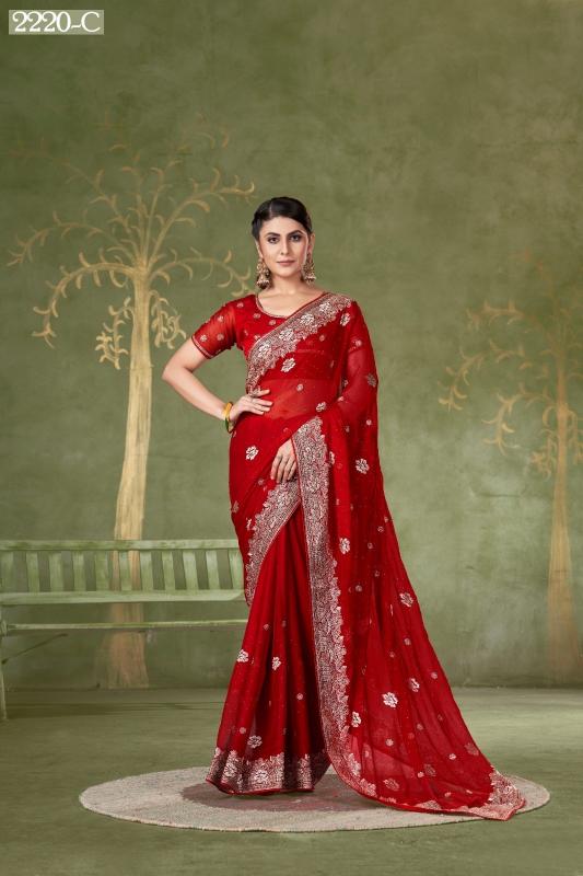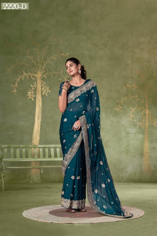Catalog Name -2220 Series Series : 2220A to 2220D Rate : 1245/- +5%GST Fabric: Chiffon With Embroidery Border And Butti Work Blouse: Running With Work Occasion: Party Wear, Festival Wear |