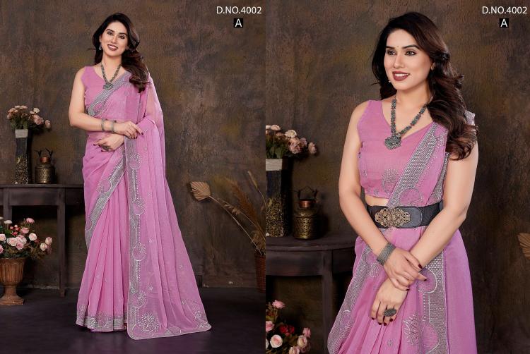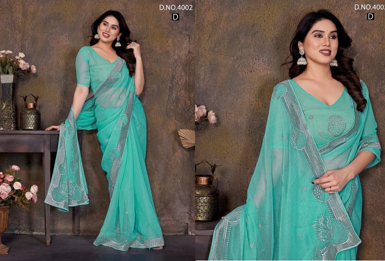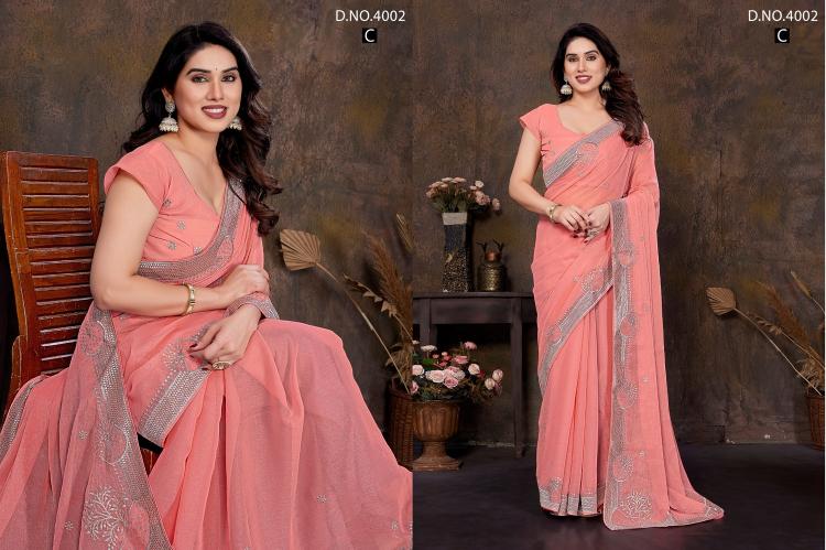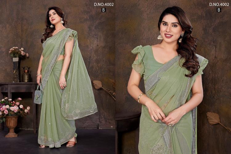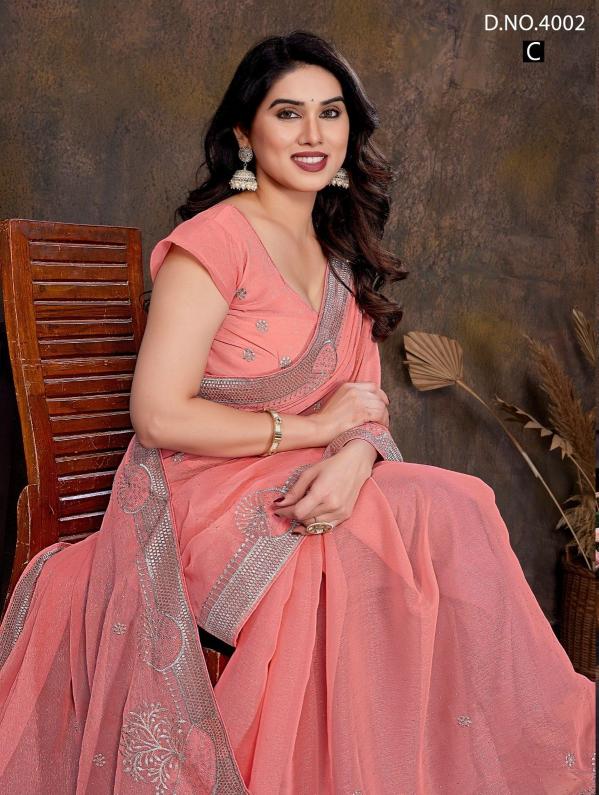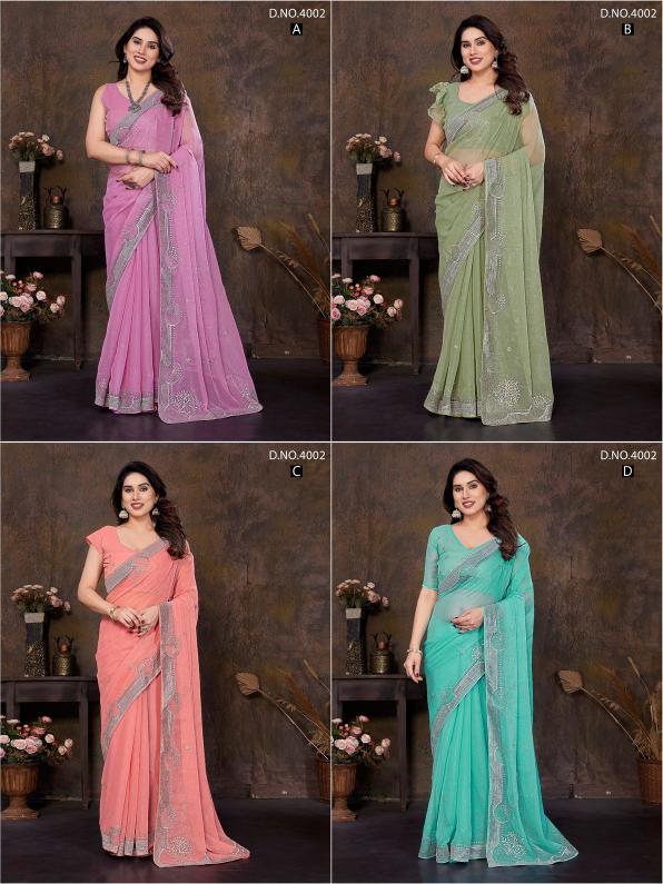 Brand : Jayshree Catalog Name : 4002A to 4002D Saree Fabric : Shimar , Zari & Stone Work Blouse Fabric : Shimar , Zari & Stone Work Rate : 770/- +5% Gst Occasion: Party Wear,Festive Wear |