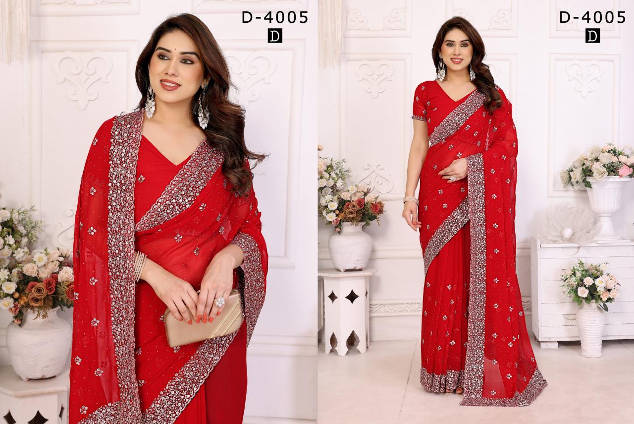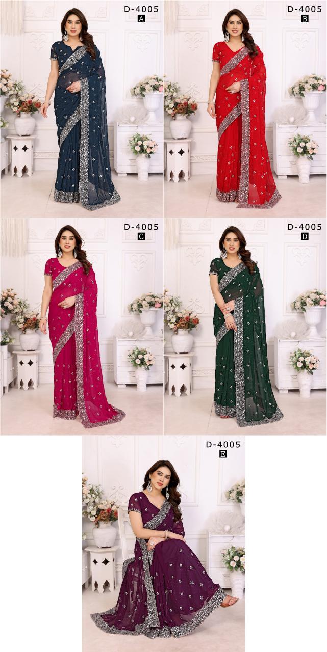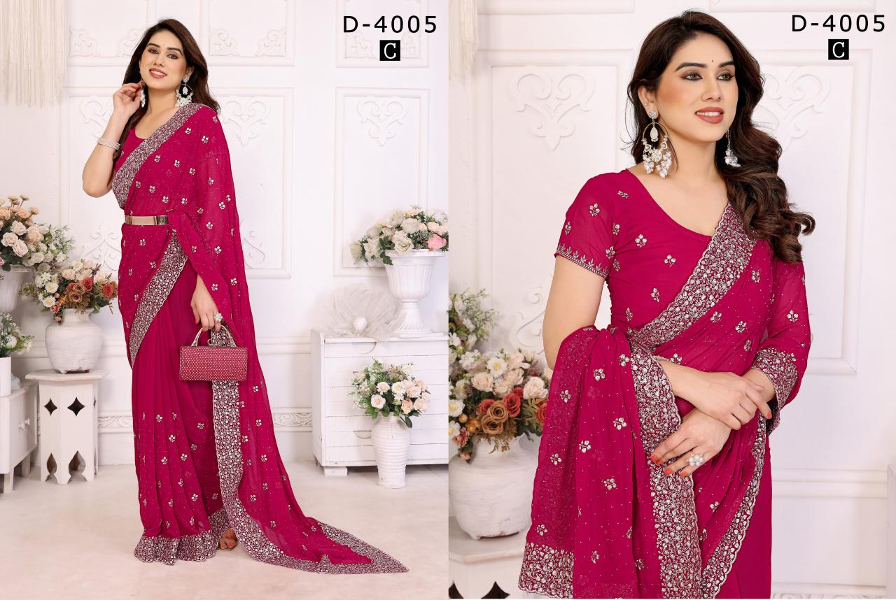 Brand : Jayshree Catalog Name : 4005A to 4005D Saree Fabric : 60 Gram Georgette , Zari & Stone Work Blouse Fabric : 60 Gram Georgette, Zari & Stone Work Rate : 835/-+5% Gst Occasion: Party Wear,Festive Wear |