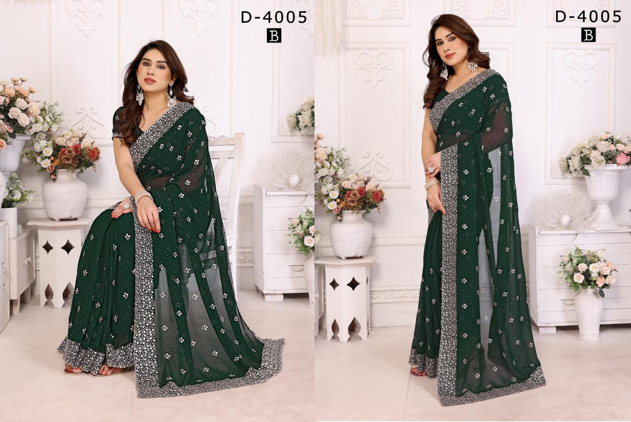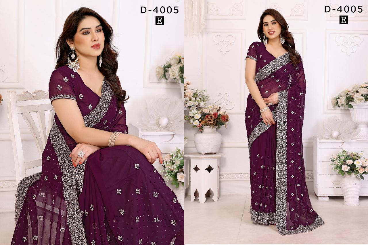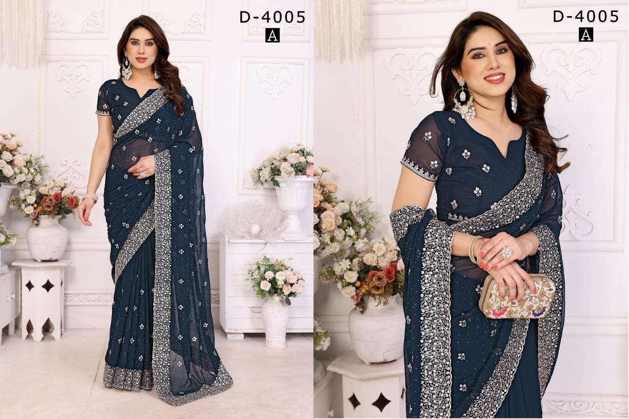 Brand : Jayshree Catalog Name : 4005A to 4005D Saree Fabric : 60 Gram Georgette , Zari & Stone Work Blouse Fabric : 60 Gram Georgette, Zari & Stone Work Rate : 835/-+5% Gst Occasion: Party Wear,Festive Wear |