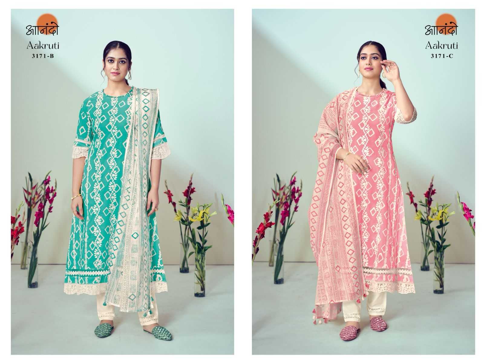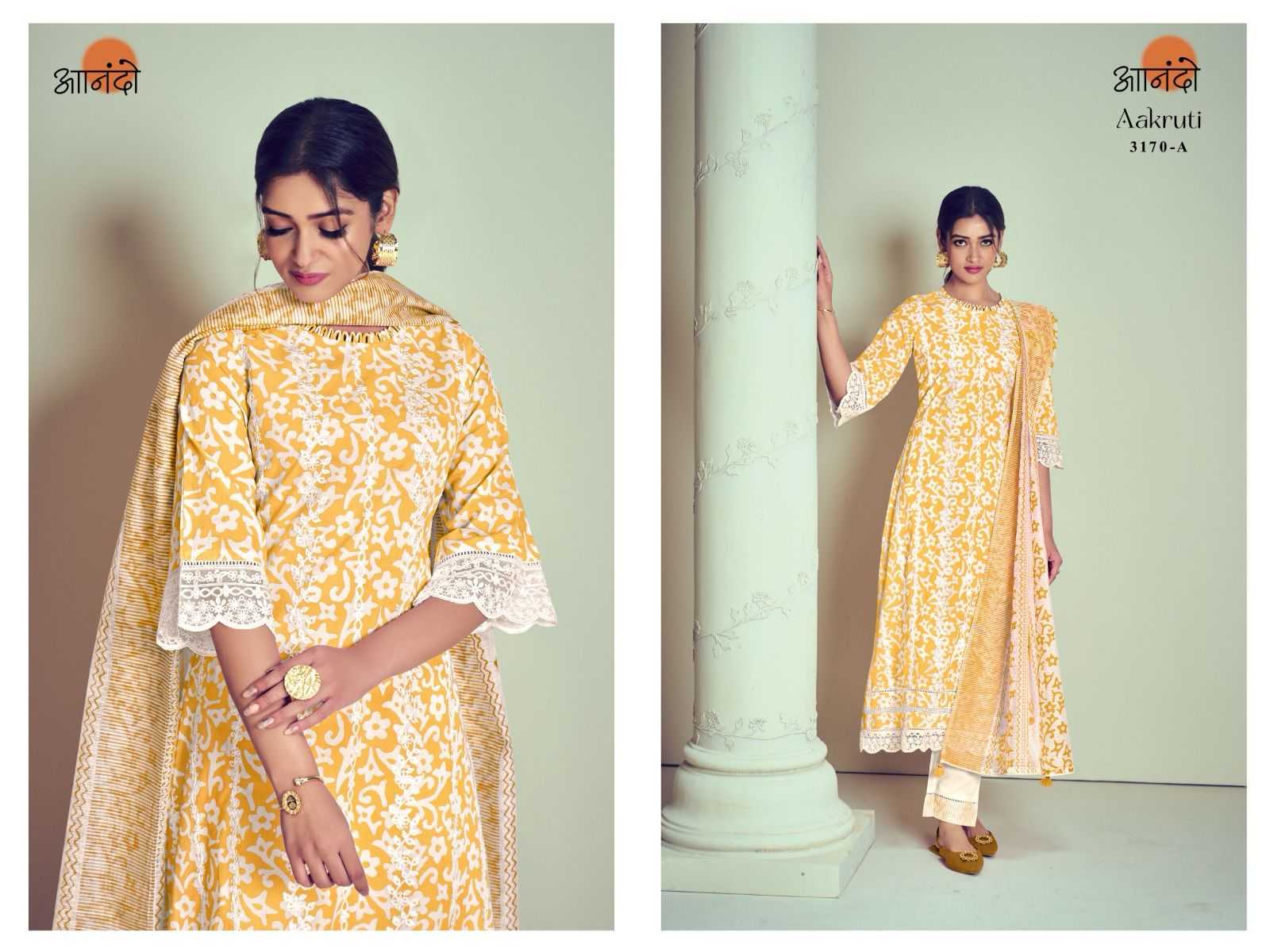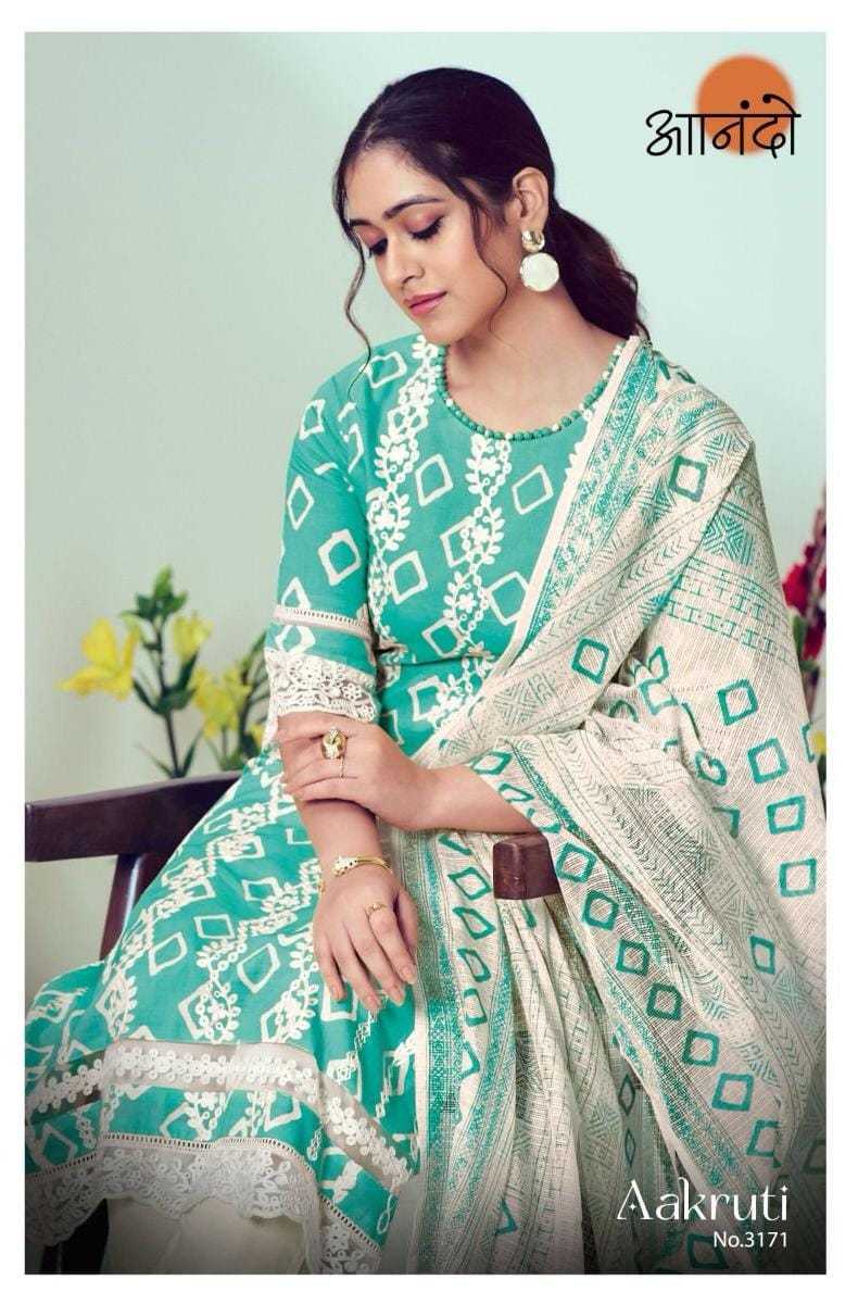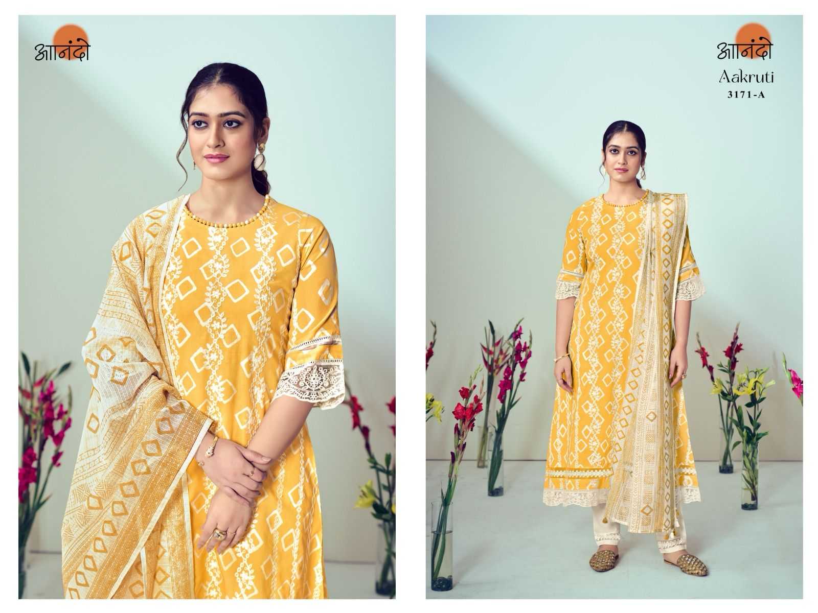 ANANDO BY JAYVIJAY Aakruti 3171 DESCRIPTION : TOP : :BOTTOM: : DUPATTA : RATE : 1290/- per pcs GST EXTRA Set to set |