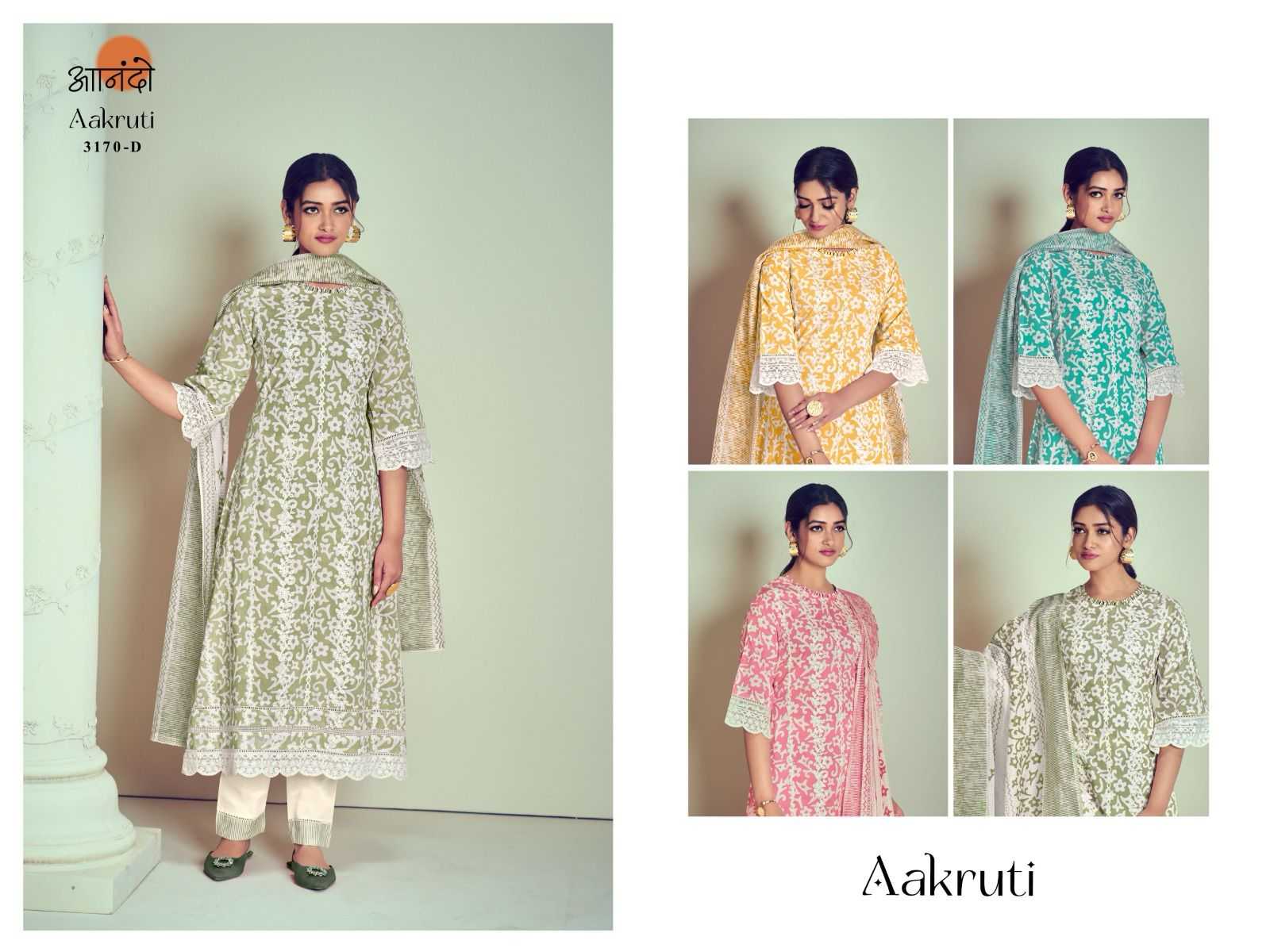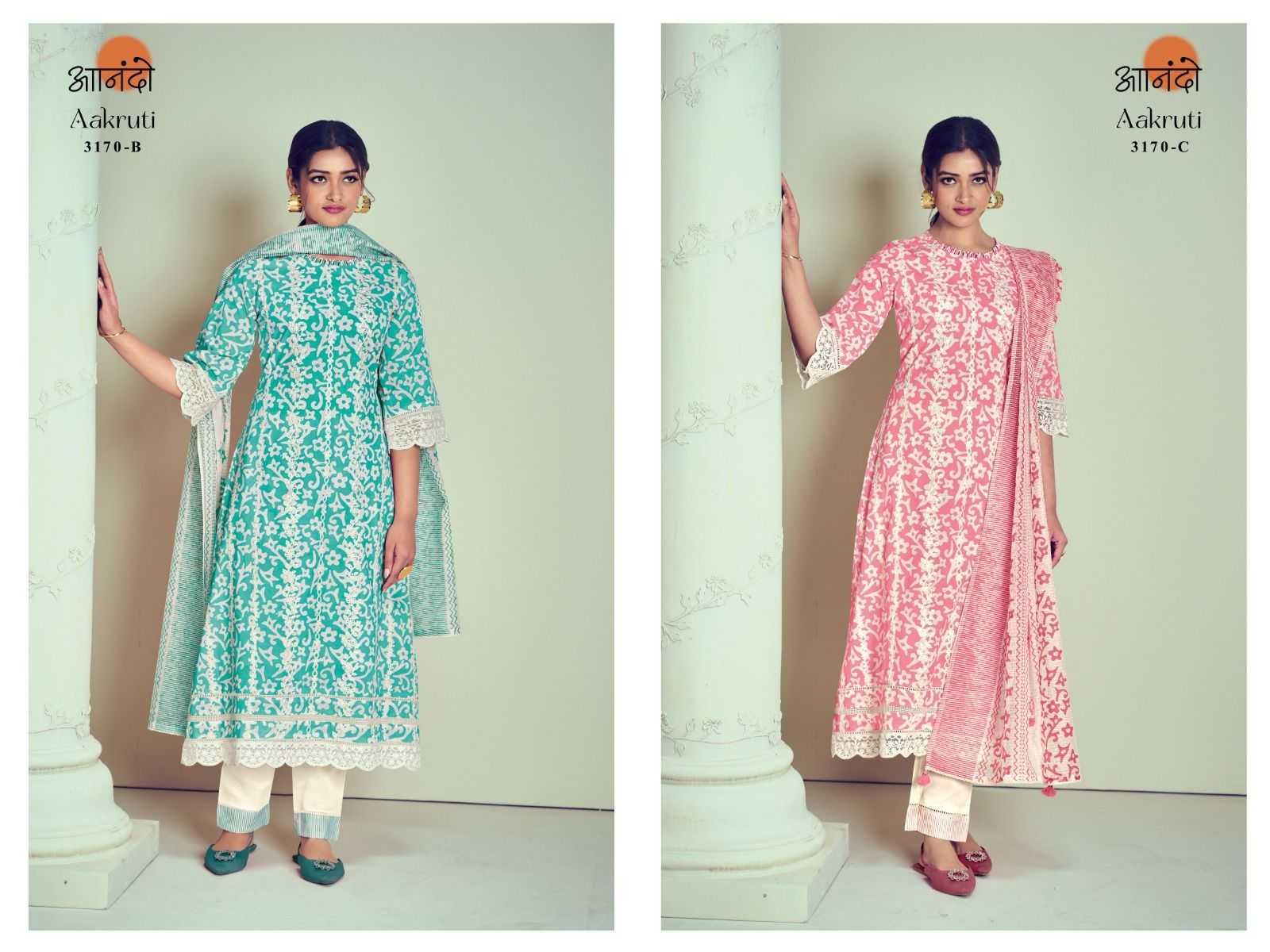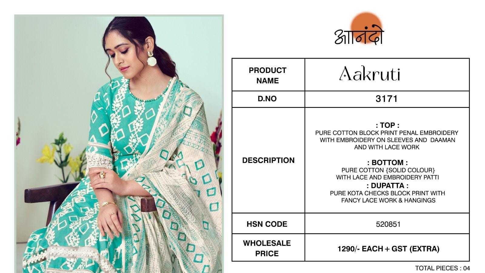 ANANDO BY JAYVIJAY Aakruti 3171 DESCRIPTION : TOP : :BOTTOM: : DUPATTA : RATE : 1290/- per pcs GST EXTRA Set to set |