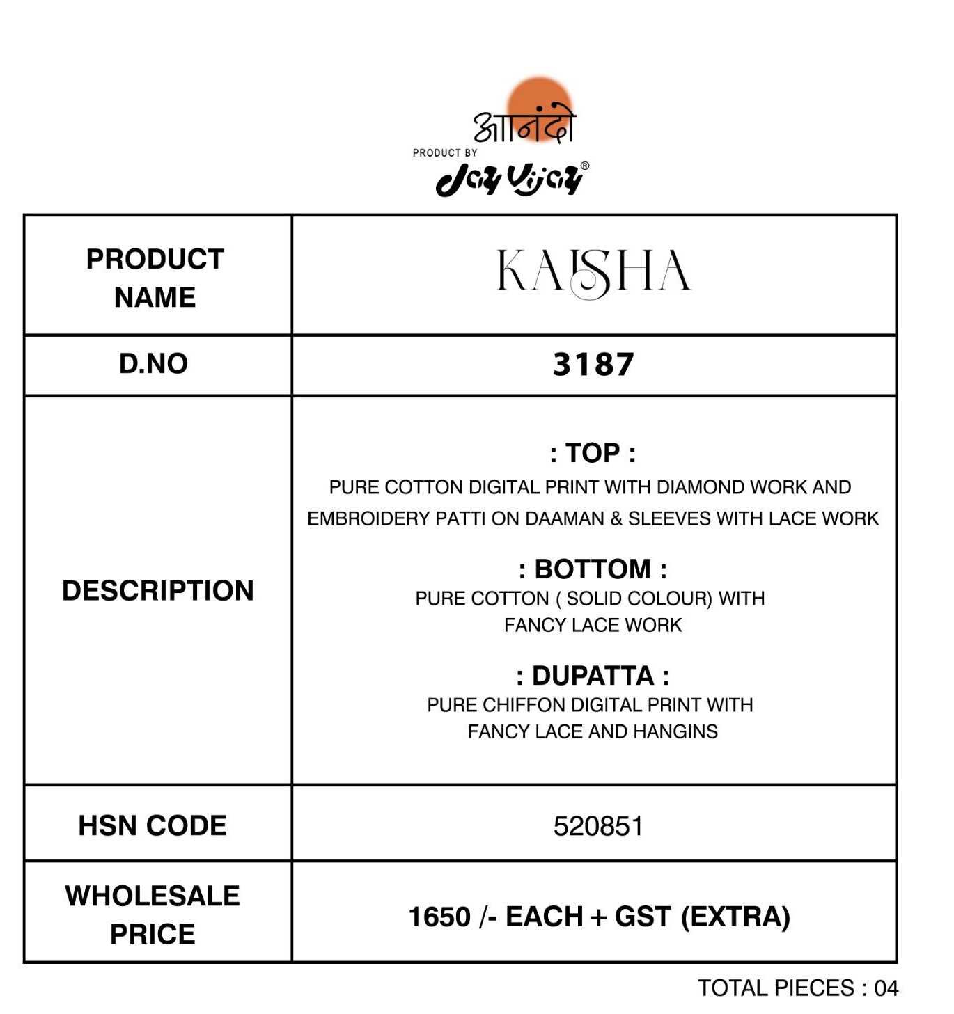 Jay Vijay Presents Latest Collection Launched on 10-04-2024. Presenting Beautiful collection of 4 PCS with Unstitched .