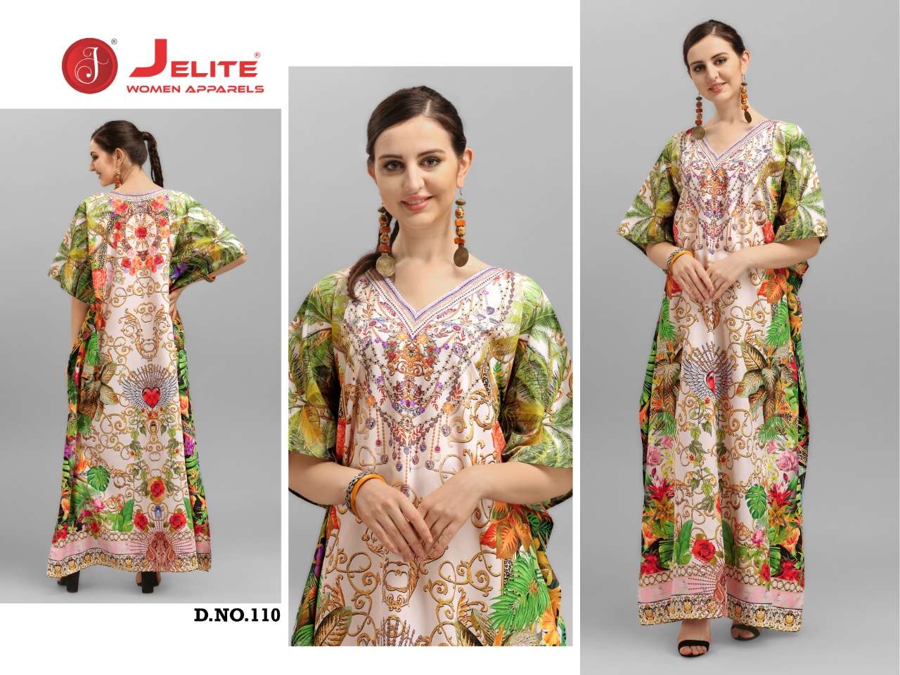 Jelite®  presents AFREEN (Kaftans) Volume 2 Weaved in premium quality Polyester Crepe fabric, these kaftans have extraordinary lustrous,  opaque and soft texture. Its beautiful silhouette and great fall is enhanced by the export level digital printing on it and is available in unique designs with stone work. With a length of 58 inches and a drawstring at the waist, it empowers you to customize it to fit you perfectly. This season, grab this absolute comfortable wear and stay versatile. Fabric - Polyester Crepe Size - Free Size (fits up to 5Xl) Pieces : 8 Length - 58" With Stone Work Jelite® |