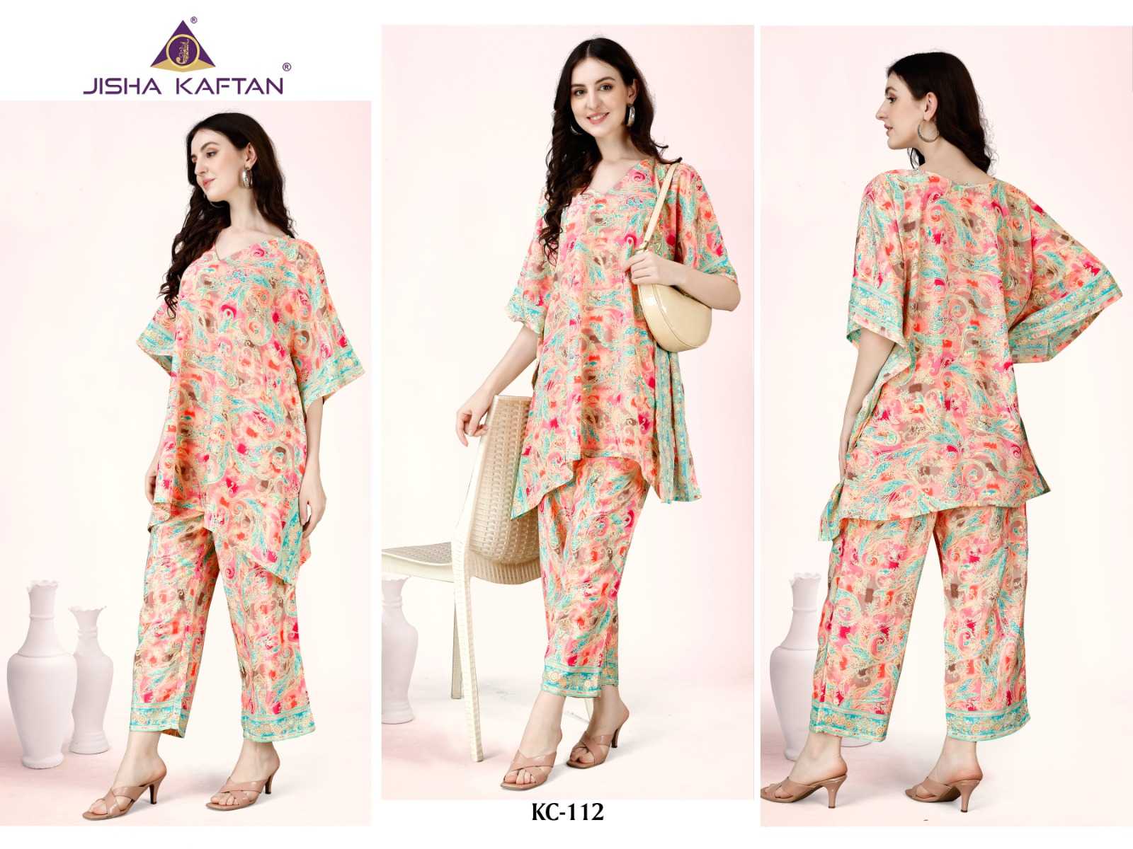 BOOK CATALOGUE JISHA KAFTAN PRESENTS KAFTAN CO ORD SETS VOL 2 ON KRISHNA CREATION. CALL ON +91-8866778727.