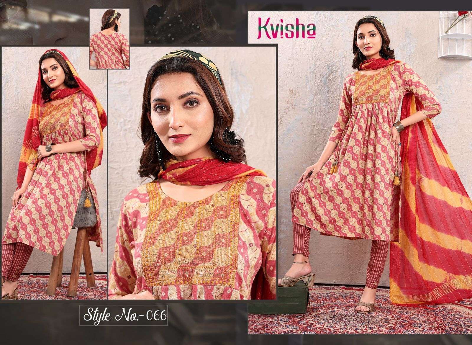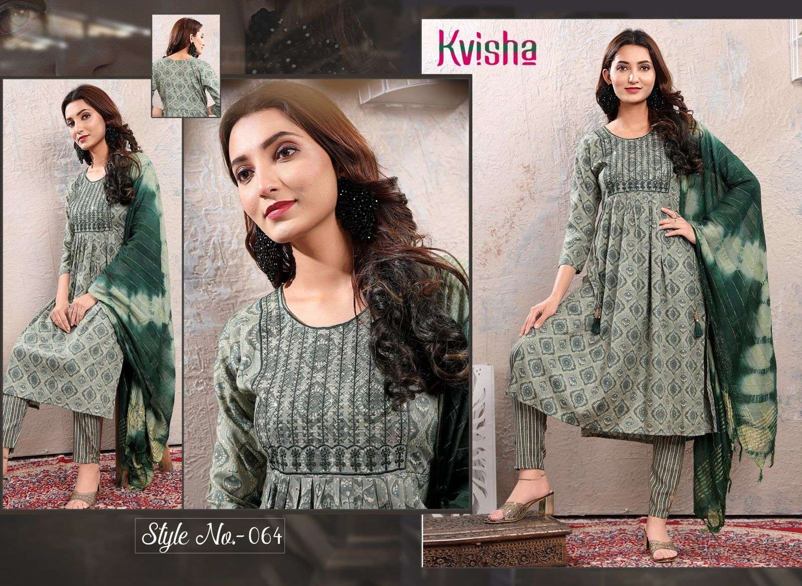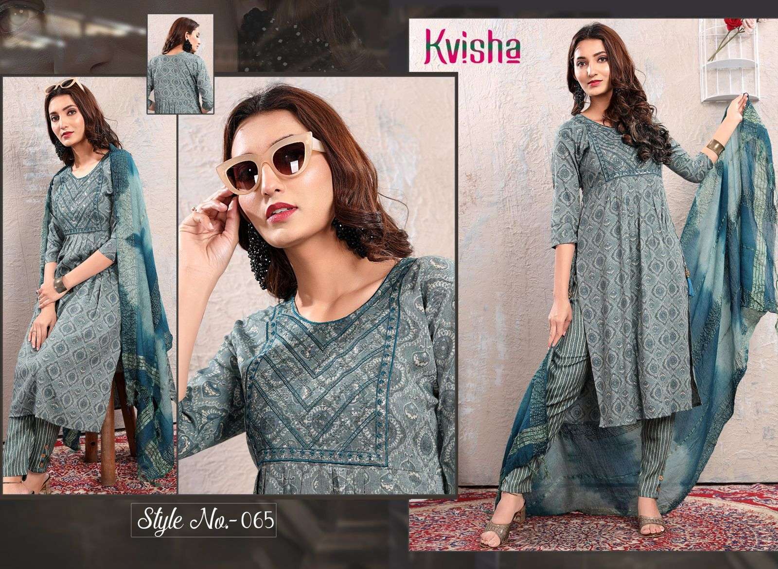 NAME :- JLF KAVISHA VOL.1 Three Piece Catalogue Fabrics:- Top:- Rayon Capsule Foil Print Designs :- 06 Size:- L.XL.XXL LENGTH:- TOP :- 44 INCH Pattern:- Sequence Embroidered Style:- Naira Cut Kurta Pant & Dupatta Rate :- 699/- |