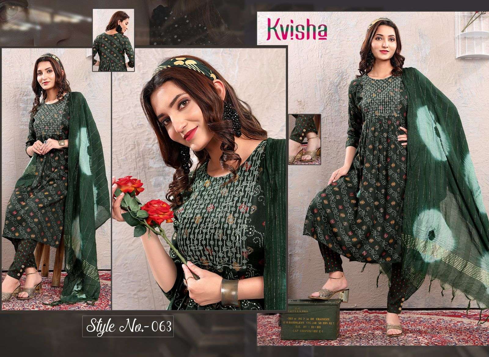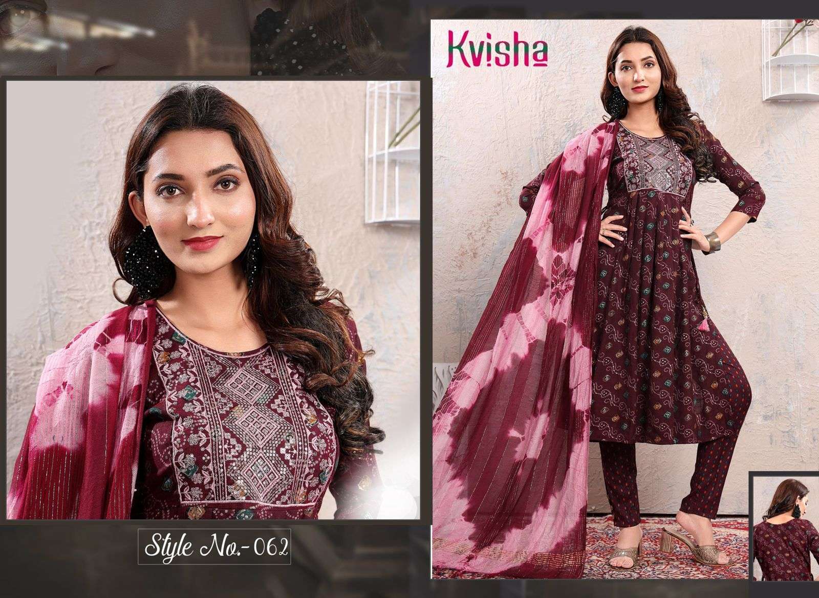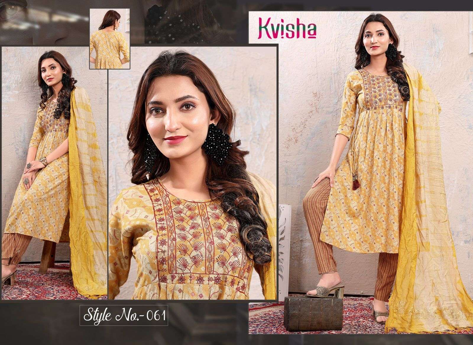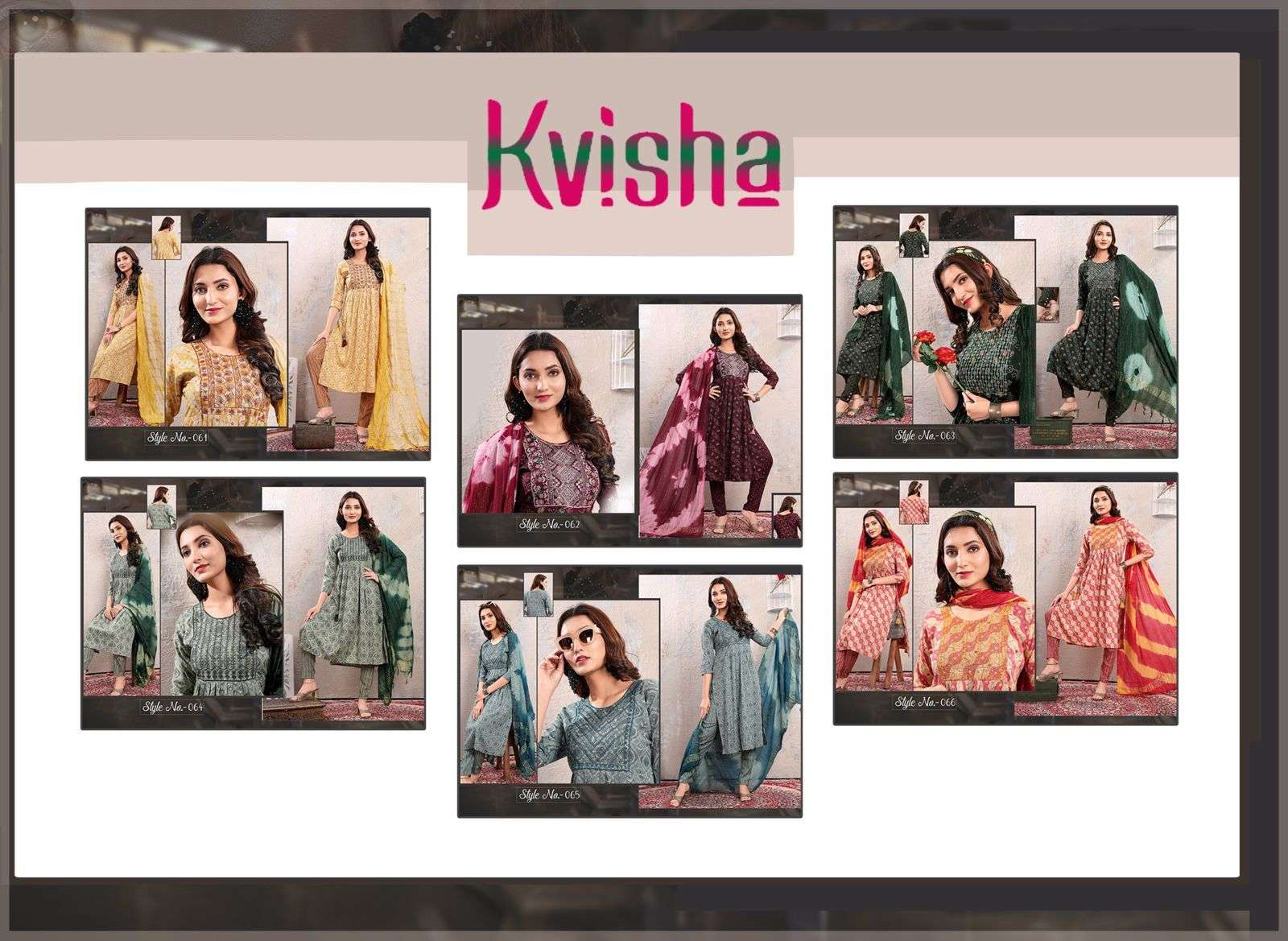 NAME :- JLF KAVISHA VOL.1 Three Piece Catalogue Fabrics:- Top:- Rayon Capsule Foil Print Designs :- 06 Size:- L.XL.XXL LENGTH:- TOP :- 44 INCH Pattern:- Sequence Embroidered Style:- Naira Cut Kurta Pant & Dupatta Rate :- 699/- |